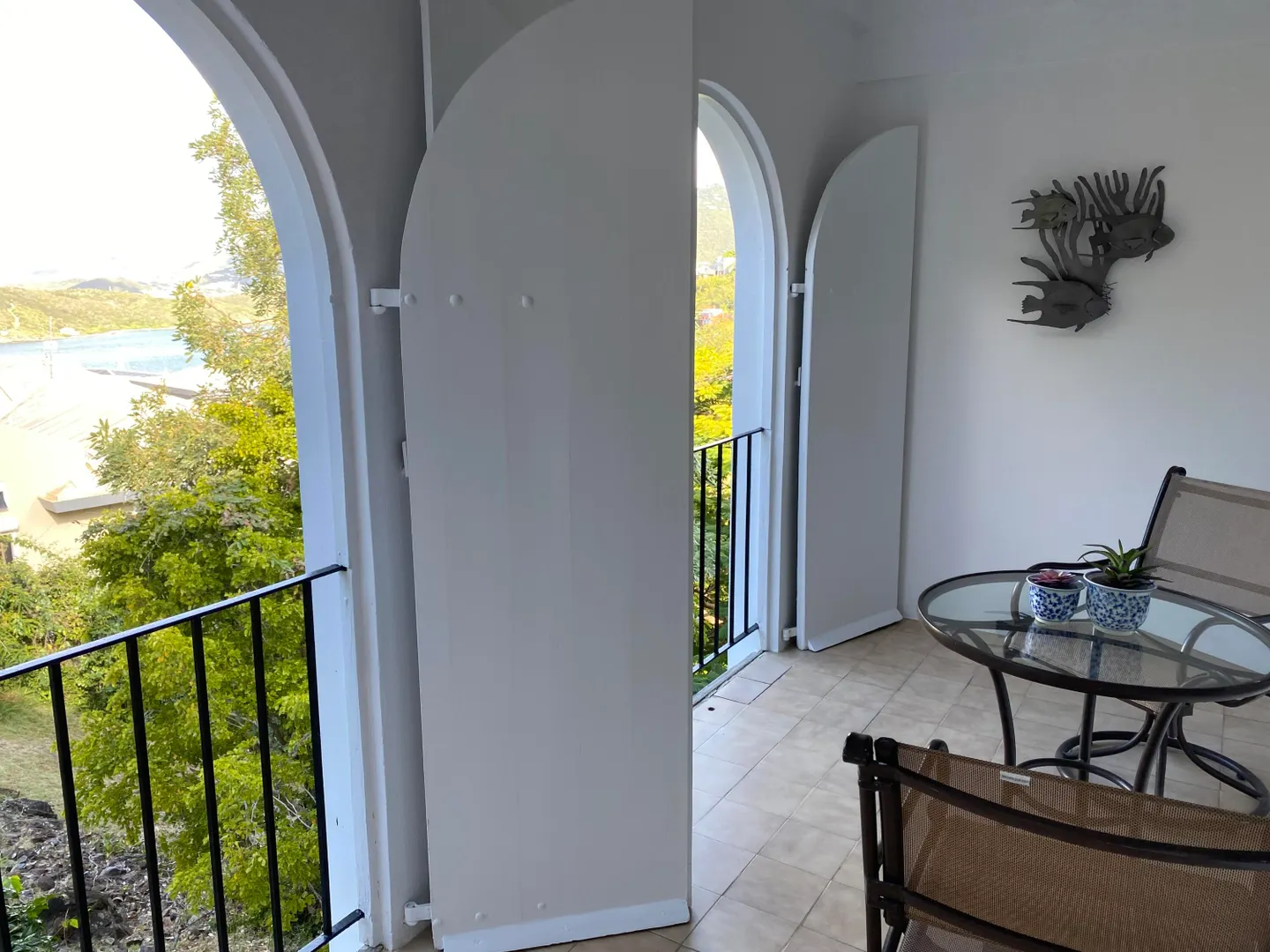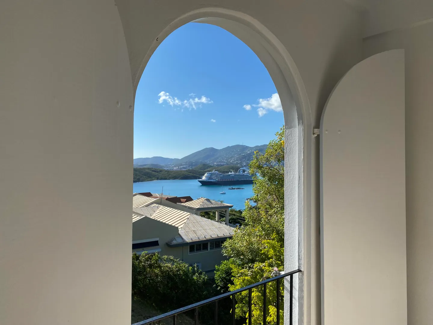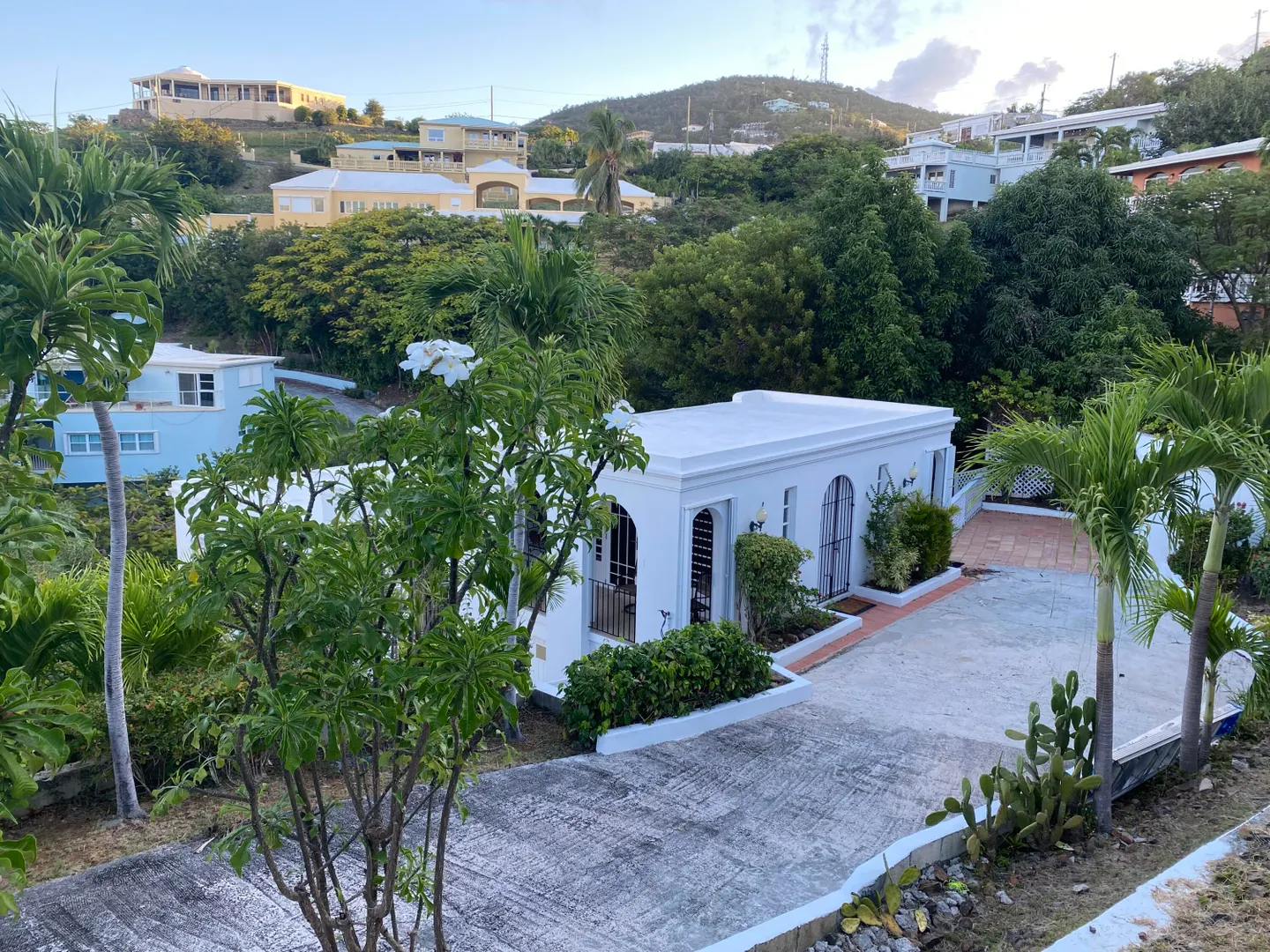 Architect Jeffrey Zucker's adaptation of classic climate-resilient West Indian design builds hurricane-resistant features into this 4 bedroom, 3 bath home. Nestled into a terraced, professionally landscaped yard, the home stairsteps down the sloping property to reveal a view of Hassel Island and Charlotte Amalie harbor framed by palms and native trees. Enjoy the two porches as cruise ships glide by at sunset, and the harbor lights twinkle across the water.Lovingly maintained by a single owner, the home has weathered hurricanes since its construction in 1980 with little damage. Caribbean-style wooded exterior shutters in arches with additional accordion hurricane shutters for other doors and windows provide protection and peace of mind. A concrete outbuilding protects the masssive 32 KW generator (2021) and 500-gallon diesel tank. An automatic transfer switch provides near seamless power. Two cisterns provide water for all uses. The driveway off the low-traffic private street is protected with a remote-controlled gate, and the property is fenced. The living room is entered at grade from the parking area and is half-level above the dining room and kitchen, which is half level above the main bedroom, full bath with tub, walk-in closet, a storage closet, a utility room with washer and dryer, and an enclosed porch area porch area with a large shower. Below this floor are two bedrooms connected by a shared bath. There are five split-system air conditioning units in living and sleeping areas. The lowest floor is reached by exterior stairs and has a bath with shower, a sitting area with a countertop and sink, and a bedroom with a separate door to a private micro-deck. There is an additional storage area accessible from the exterior stairway. A brief drive to Havensight and Downtown shopping, dining, and services, the home is a short to the Westin Frenchman's Reef Resort and Marriott Frenchman's Cove and Buoy Haus Resorts with a variety of restaurants and boutiques, two beaches, and a spa. The picturesque neighborhood is filled with multi-million dollar residences. Very few homes without pools are offered for sale in this neighborhood, and inventory in this price range is historically low in St. Thomas. With its desirable location, privacy, and lovely views, this unique property is worthy of consideration.