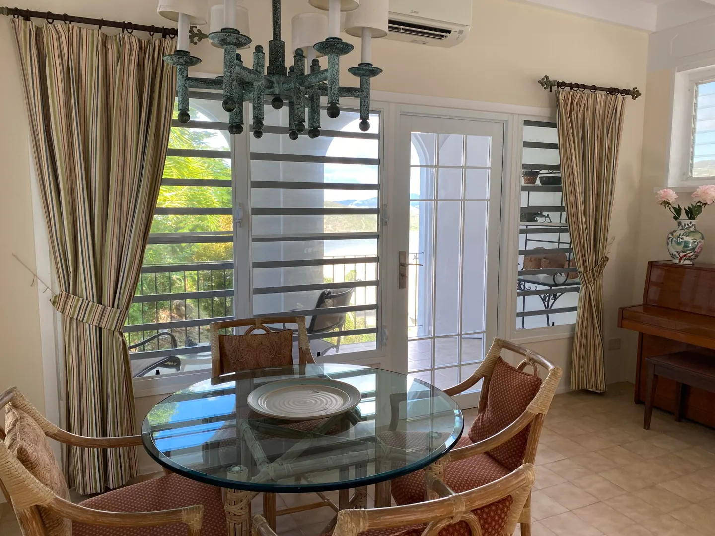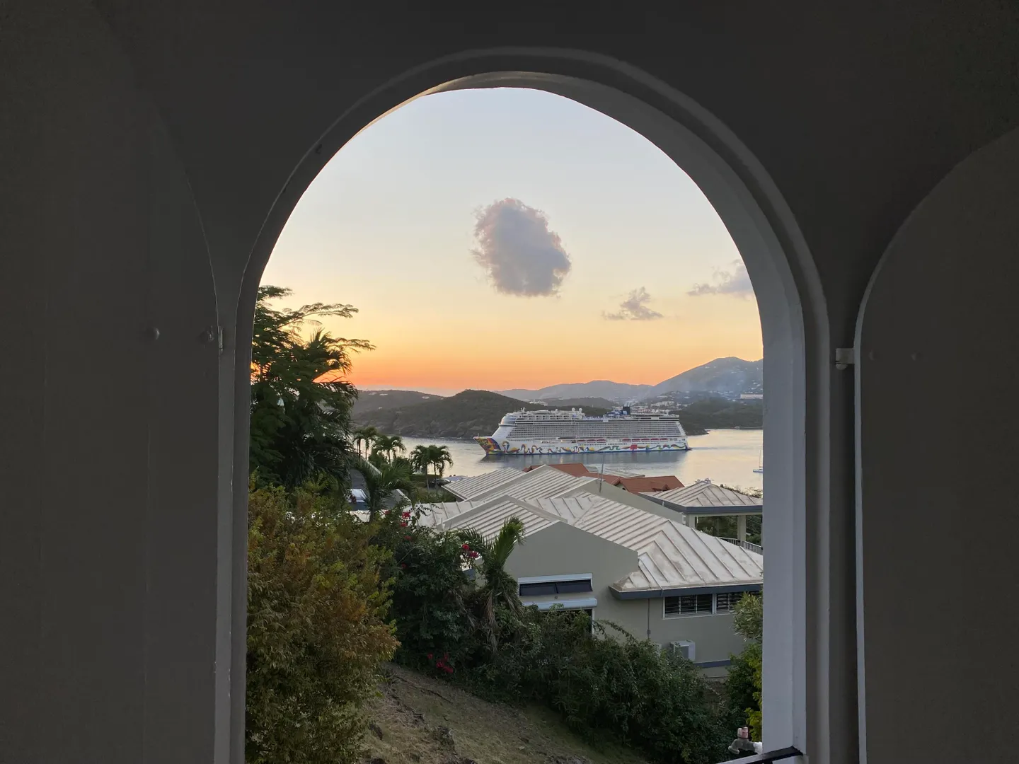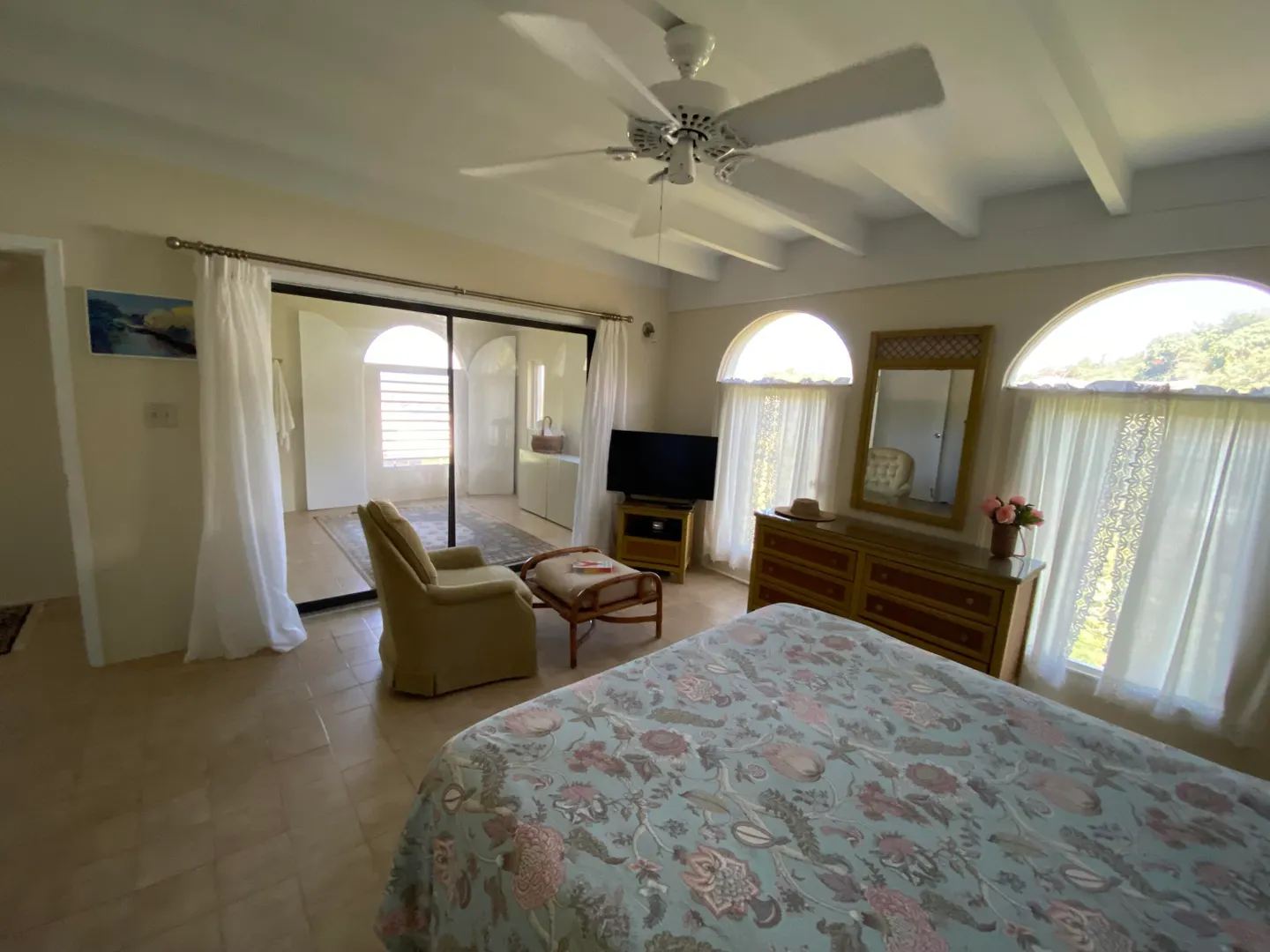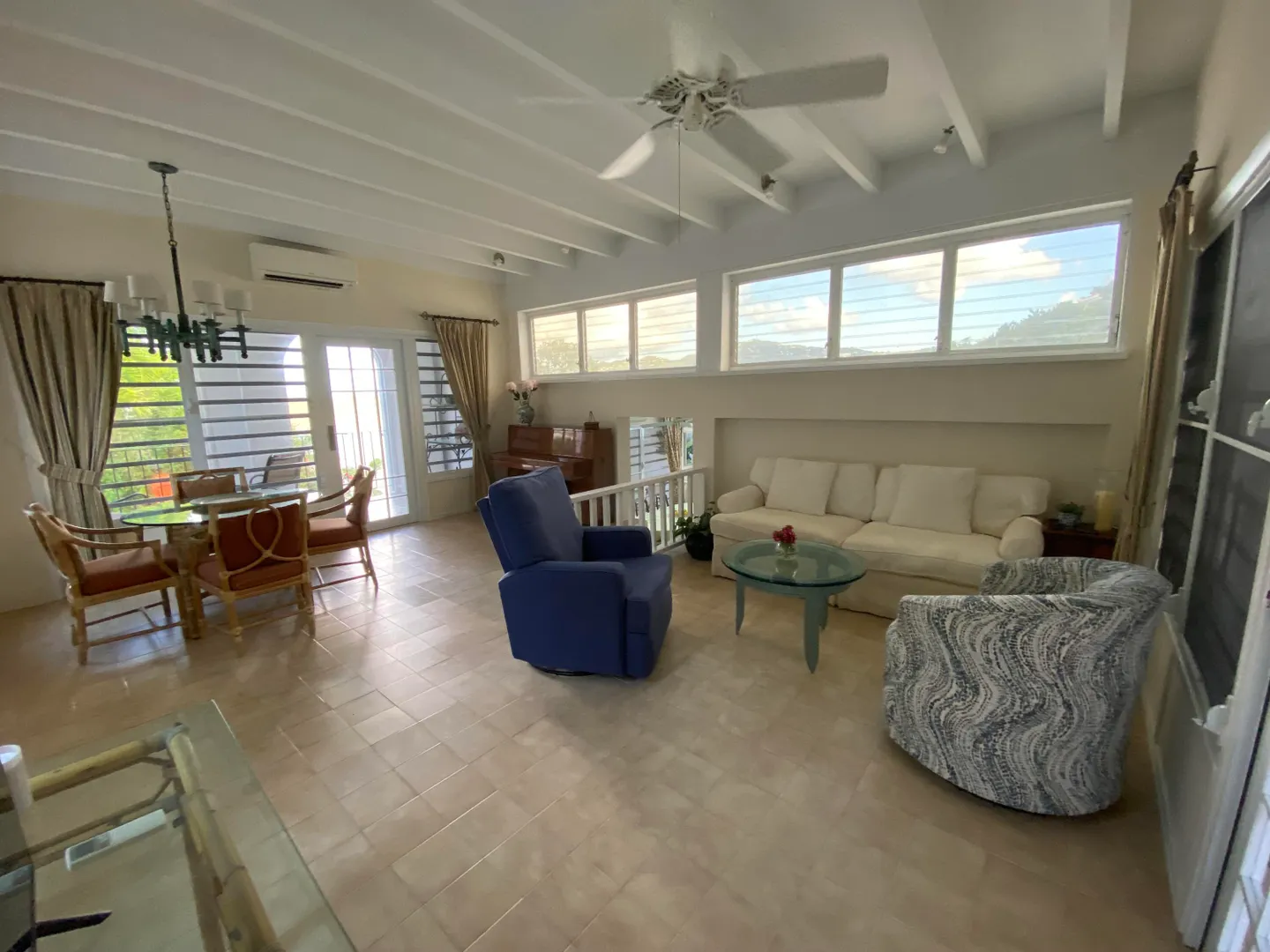 Architect Jeffrey Zucker's adaptation of classic climate-resilient West Indian design builds hurricane-resistant features into this 4 bedroom, 3 bath home. Nestled into a terraced, professionally landscaped yard, the home stairsteps down the sloping property to reveal a view of Hassel Island and Charlotte Amalie harbor framed by palms and native trees. Enjoy the two porches as cruise ships glide by at sunset, and the harbor lights twinkle across the water.Lovingly maintained by a single owner, the home has weathered hurricanes since its construction in 1980 with little damage. Caribbean-style wooded exterior shutters in arches with additional accordion hurricane shutters for other doors and windows provide protection and peace of mind. A concrete outbuilding protects the masssive 32 KW generator (2021) and 500-gallon diesel tank. An automatic transfer switch provides near seamless power. Two cisterns provide water for all uses. The driveway off the low-traffic private street is protected with a remote-controlled gate, and the property is fenced. The living room is entered at grade from the parking area and is half-level above the dining room and kitchen, which is half level above the main bedroom, full bath with tub, walk-in closet, a storage closet, a utility room with washer and dryer, and an enclosed porch area porch area with a large shower. Below this floor are two bedrooms connected by a shared bath. There are five split-system air conditioning units in living and sleeping areas. The lowest floor is reached by exterior stairs and has a bath with shower, a sitting area with a countertop and sink, and a bedroom with a separate door to a private micro-deck. There is an additional storage area accessible from the exterior stairway. A brief drive to Havensight and Downtown shopping, dining, and services, the home is a short to the Westin Frenchman's Reef Resort and Marriott Frenchman's Cove and Buoy Haus Resorts with a variety of restaurants and boutiques, two beaches, and a spa. The picturesque neighborhood is filled with multi-million dollar residences. Very few homes without pools are offered for sale in this neighborhood, and inventory in this price range is historically low in St. Thomas. With its desirable location, privacy, and lovely views, this unique property is worthy of consideration.
