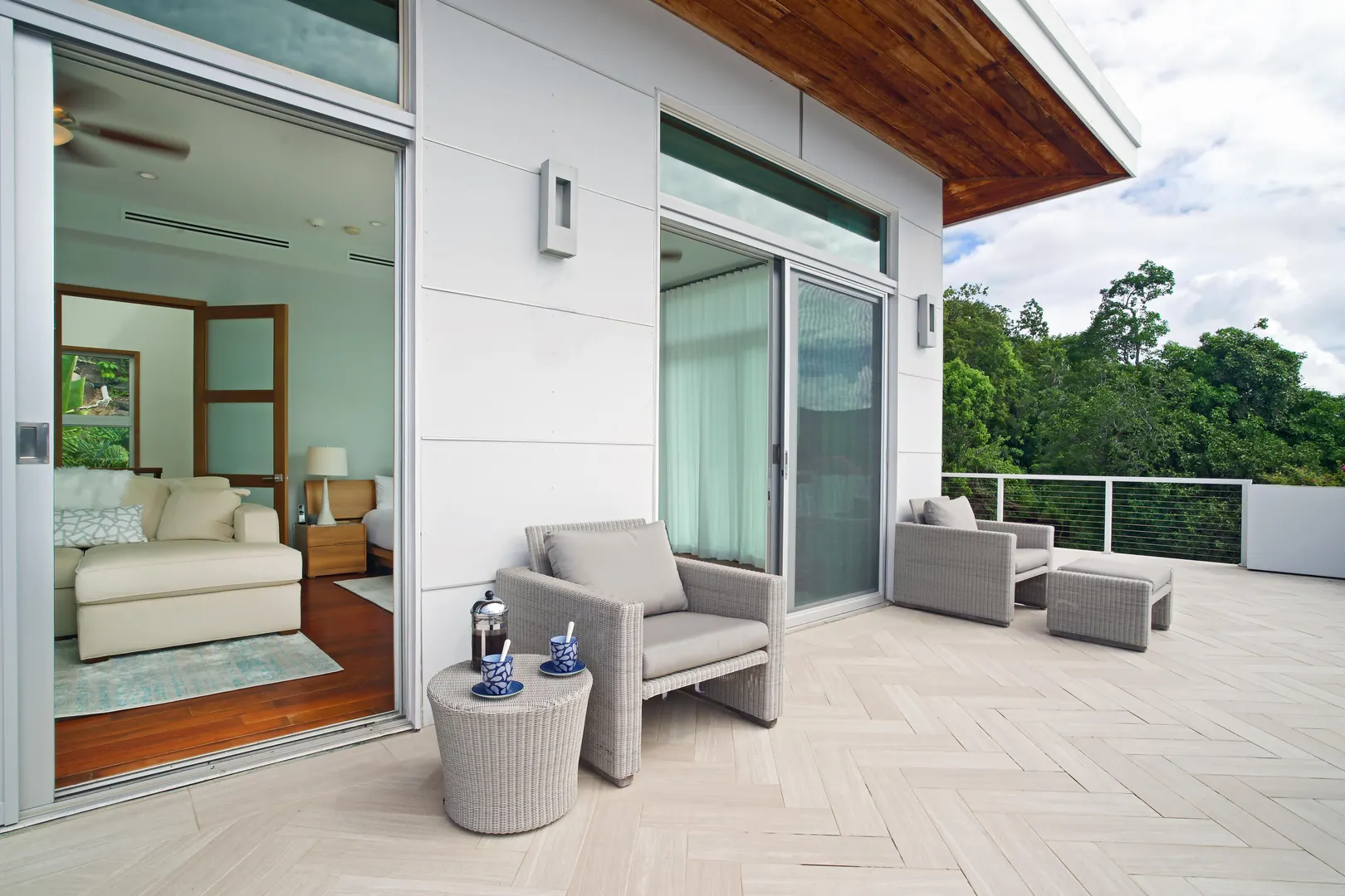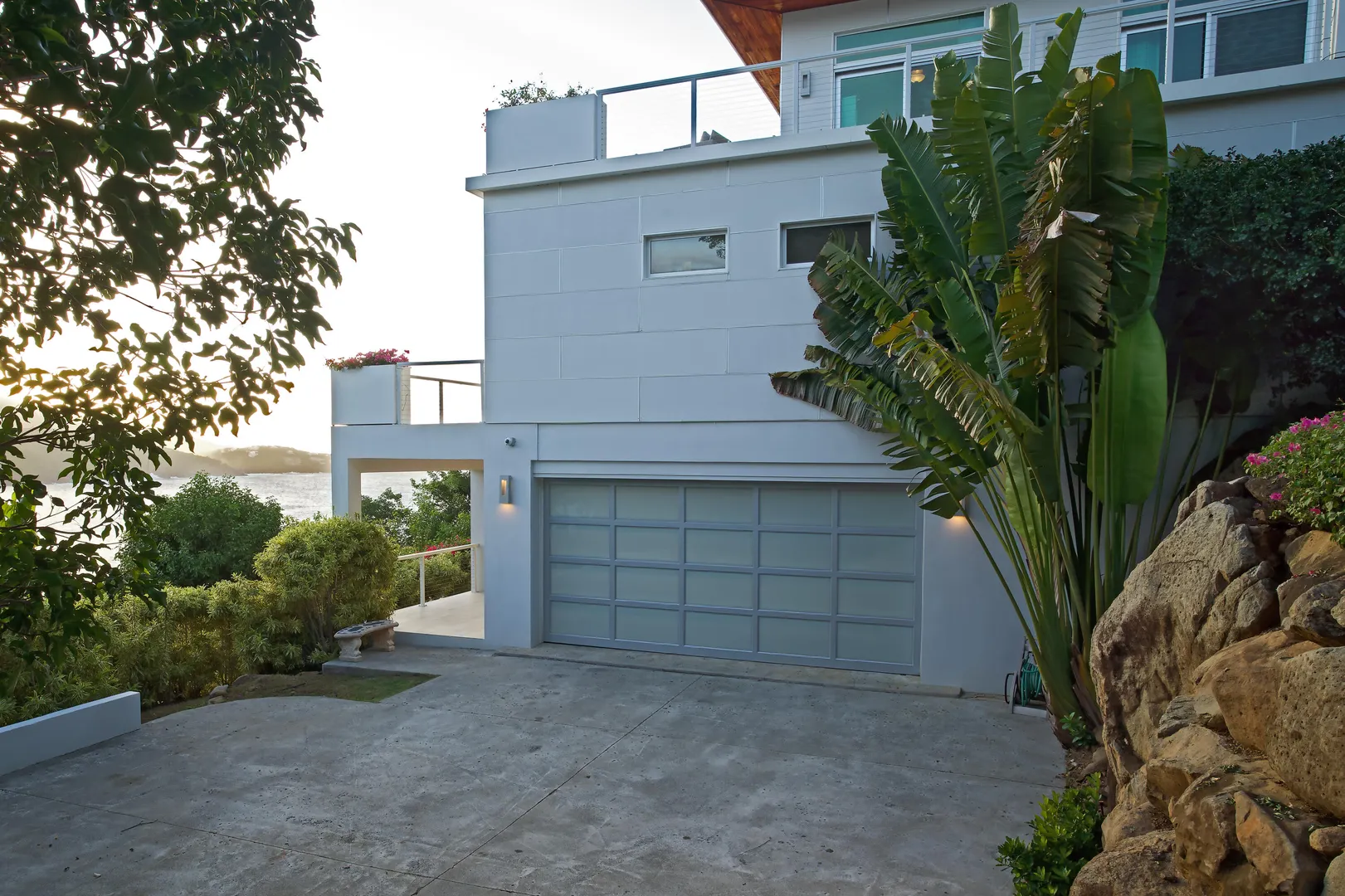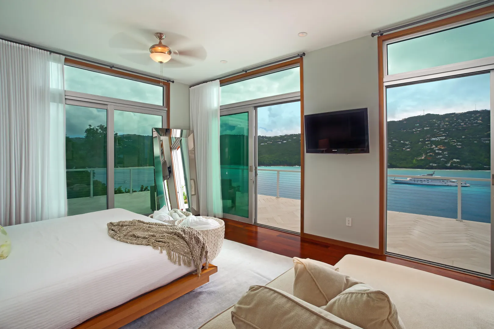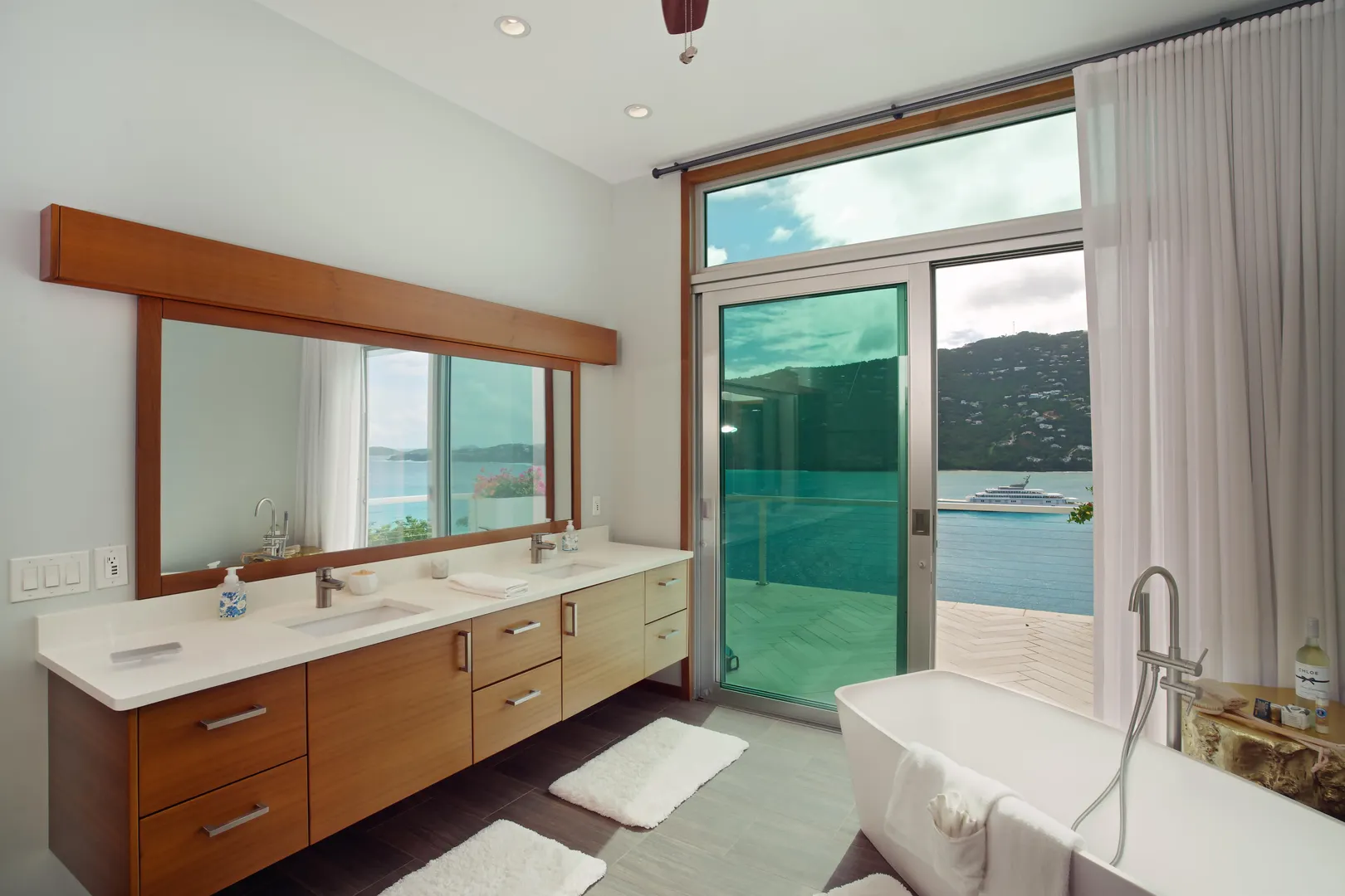 Perfectly located in the gated community of Peterborg Peninsula, this gorgeous 4 bedrooms 4 bath multi-level pool villa sits on a fenced one-half acre directly above Magens Bay.Go through the smart gate and either park in the air conditioned garage or drive right up to the front door. On the garage level there is a spacious one bedroom apartment with washer/dryer hookup and large covered deck with ocean views. Apartment can be accessed from the main house or a separate entrance, which makes it perfect for a guest or staff apartment or a very private home office. The main level is open concept with wall to wall sliding glass doors to take in the ocean view. The flooring is a mix of tile and Brazillian cherry wood.