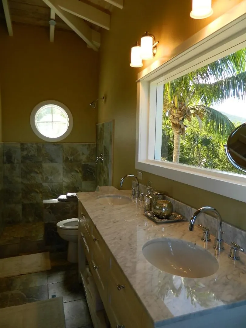 JUST GORGEOUS! Sunswept is a 3 bedroom, 3 bath fully furnished home w/ swimming pool located on the north shore on the Peterborg peninsula in the exclusive gated community of Sydney's Fancy. Tastefully remodeled kitchen with custom cabinets, granite counter tops and stainless steel appliances, lovely remodeled bathrooms, new tiled floors and decking. Andersen windows, split A/C's,a 25kw generator with automatic transfer switch, one car garage and a covered front porch - perfect for enjoying a coffee in the morning - overlooking the Atlantic ocean. All rooms are on one level and there are only 3 steps down to the swimming pool. Enjoy sunrise and the full moon rising. A wonderful home for entertaining. Solar Panels for electricity were just installed which represents a huge savings on WAPA bills. Sunswept is just a few minutes away by car to beautiful mile long Magens Bay beach, many restaurants and shopping.