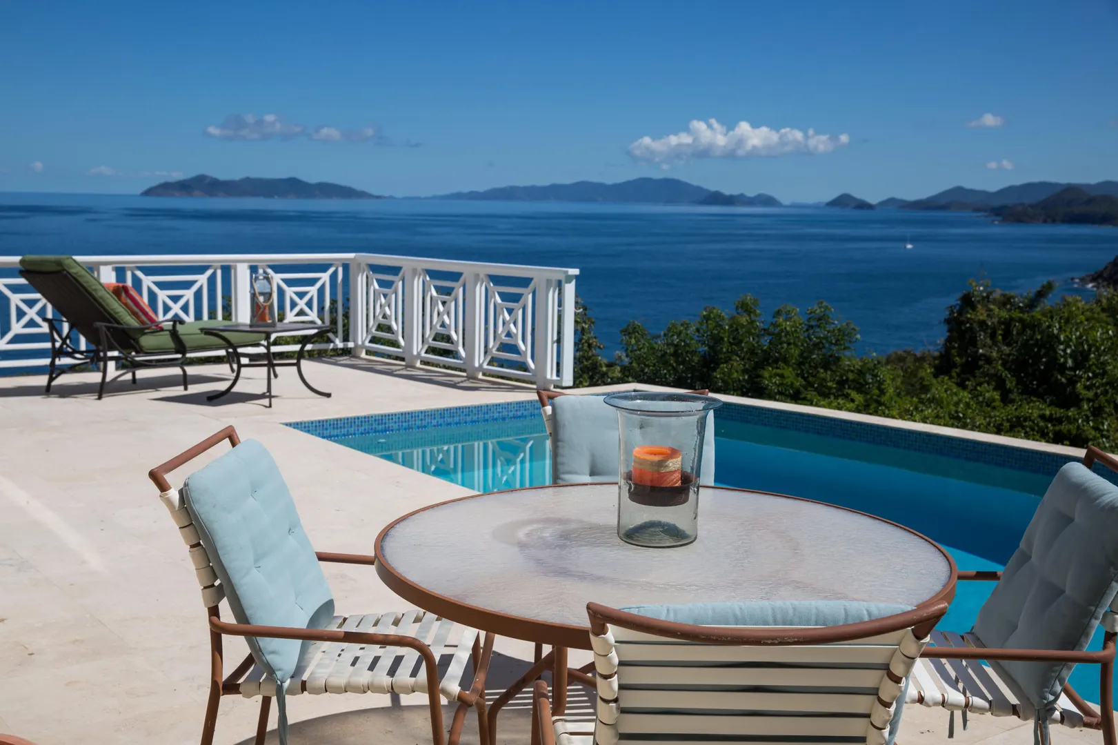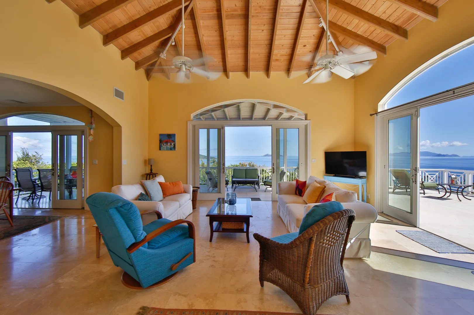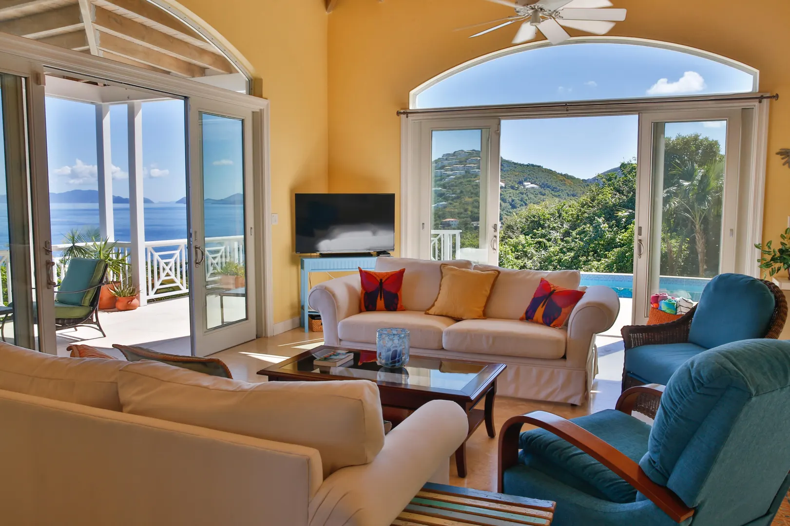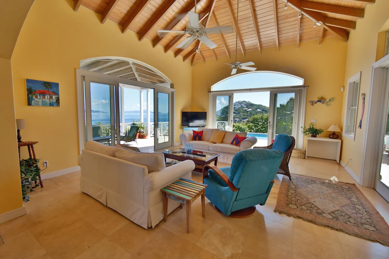 Seize the opportunity to buy this exceptionally valued island villa in premier Estate Peterborg. Motivated sellers have other ventures in mind and have reduced the price again on this custom-designed, airy 4 bedroom, 3.5 bath tropical sanctuary. This stunning island gem survived the two Cat 5 storms with only minimal/mostly cosmetic damage. See Documents for details. With no stairs at all from the privately gated, multi-car parking to the expansive living area and spacious covered gallery and sprawling poolside terrace, it offers a seamless indoor /outdoor floorplan for the best in island living and entertaining with stunning views of a dozen islands. A grand master suite is located on the main floor and 3 spacious bedrooms, 2 with ensuite baths and private decks are located upstairs.The villa has served alternately as a personal family retreat and has been operated successfully as a luxury vacation rental villa. Currently the home is generating great rental income housing relief work crews. See the Virtual tour of the villa including drone aerials under the Photo tab on the listing.