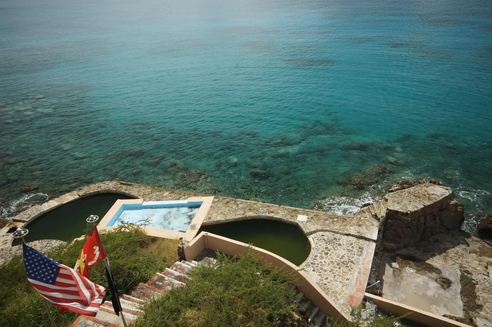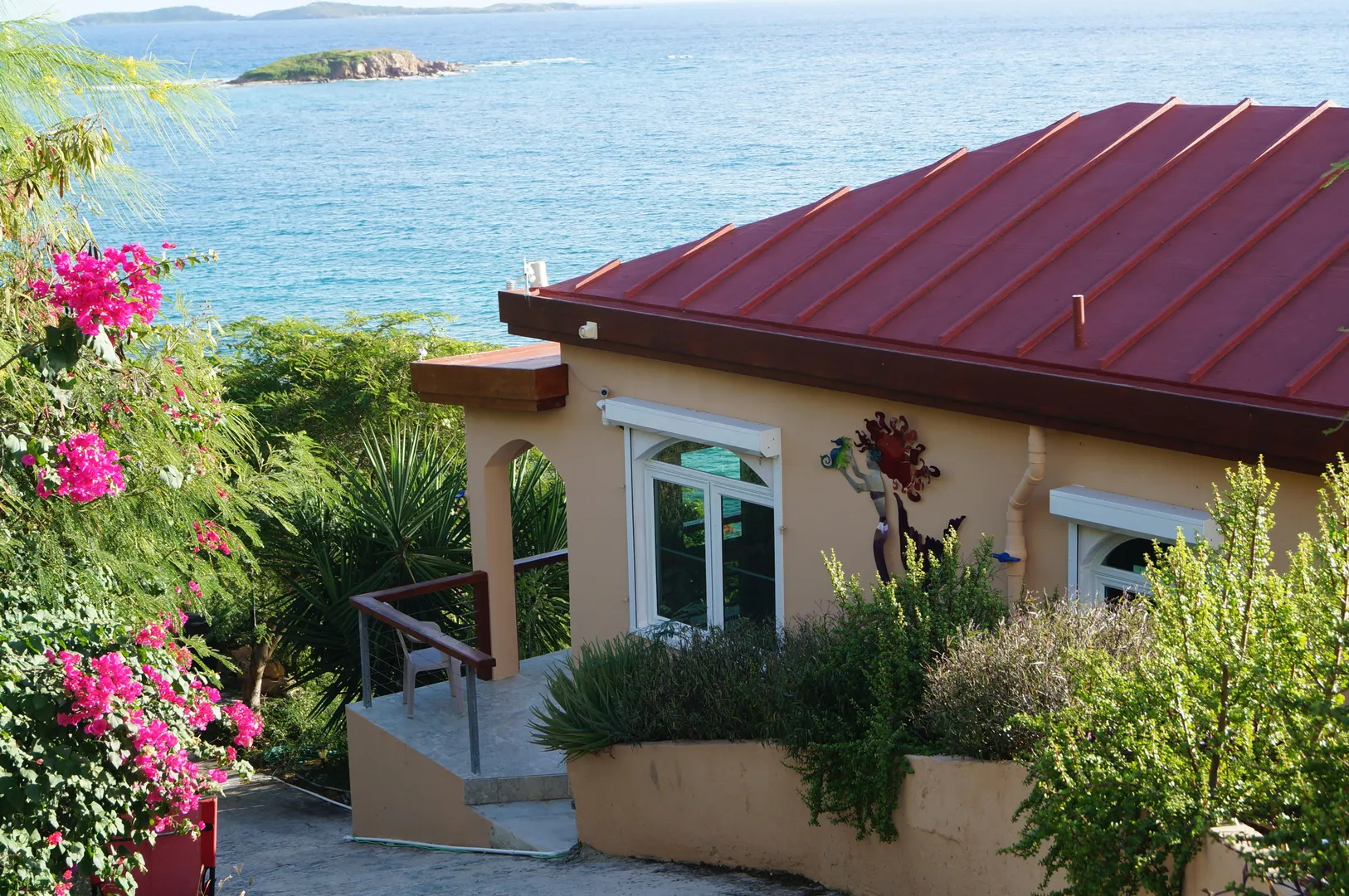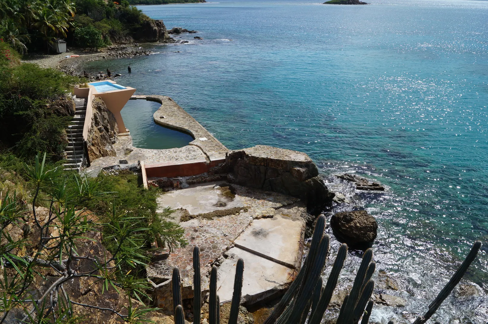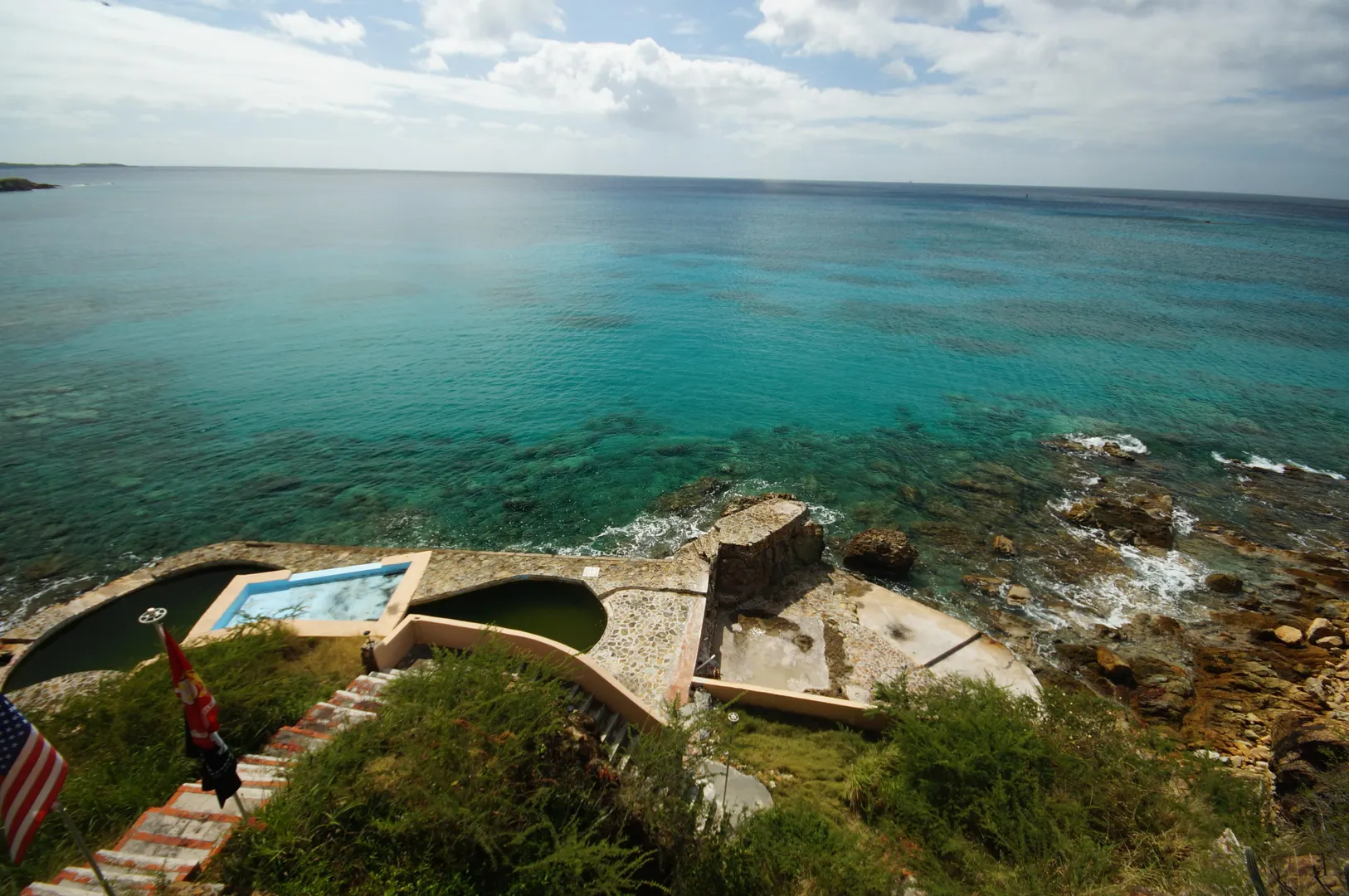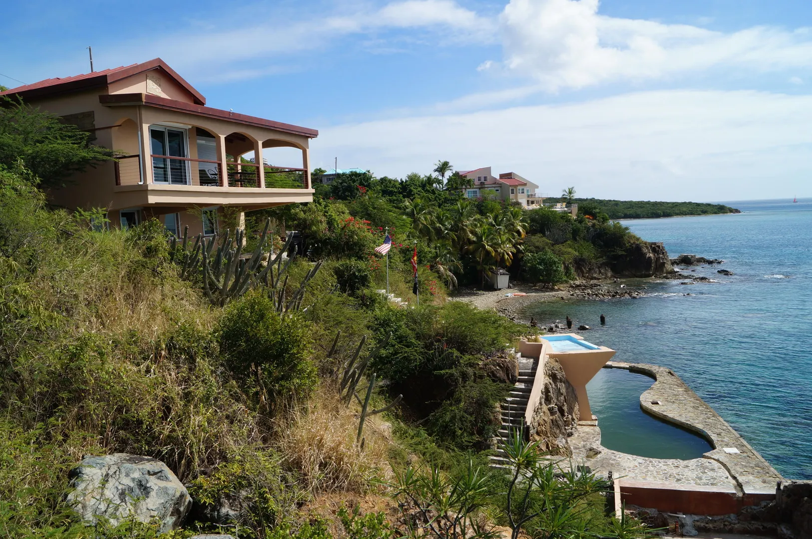 Amazing WATERFRONT Property! Salt water pool built in the ocean!! Beautiful Cottage with downstairs apartment waiting for the MAIN house to be designed/built!! Solid concrete and attention to detail. Vaulted tongue and groove ceiling throughout. Breathtaking views. Generator and sewage treatment enough to accommodate the main house. This is CARIBBEAN LIVING at it's finest See Supplement ''MERMAID'Mermaid Lagoon Estate Shoreline Drive overlooking Frenchman's Bay The Mermaid Lagoon waterfront property includes an adorable, modest sized cottage, well appointed and with (almost) wall-to-wall glass maximizes your priceless Caribbean Sea view! The cottage is cantilevered on the hillside, taking full advantage of the trade winds and magnificent views. A beautiful mermaid sculpture greets you at the entrance and from the time you open the door, you will be delighted!! If a cottage is not to your "size", it can certainly be utilized while you build YOUR "dream" manor house. Site plan leaves ample space for a main house to be constructed. The cottage can then be used as guest quarters or rental unit. Approved plan includes a prepared site for a state-of-the-art wind turbine, a future feature NOT to be overlooked. Imagine . . . lowering your WAPA utility bills! Plus, an installed propane generator is available for any island electric outages. But wait . . . start thinking Swiss-family Robinson as you take in your one-of-a-kind sea pool right at sea level! Sea water is pumped to the high platform creating a 10-ft. waterfall to the pool/lagoon below. Swim/enjoy- the sea water, free from any chemicals, cascades over its final rock steps returning to the sea below! With multiple outdoor waterfront terraces, another favorite spot off the pool deck will be "Titanic Point". THE perfect location for your early morning sunrise yoga workout . . . or end-of-day relaxation taking in the sunsets, cruise ships leaving port or just taking in the melody of the surf. You will love taking in the daily vision of water activity with sailboats, private yachts, even PIRATE ships passing by en-route to Buck Island just offshore. This is truly a unique, one-of-a-kind property to treasure; it's what DREAMS are made of!!! Are YOU ready to dream?