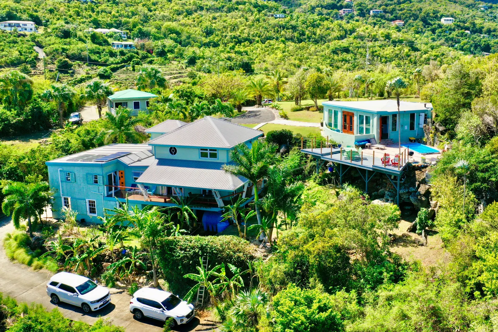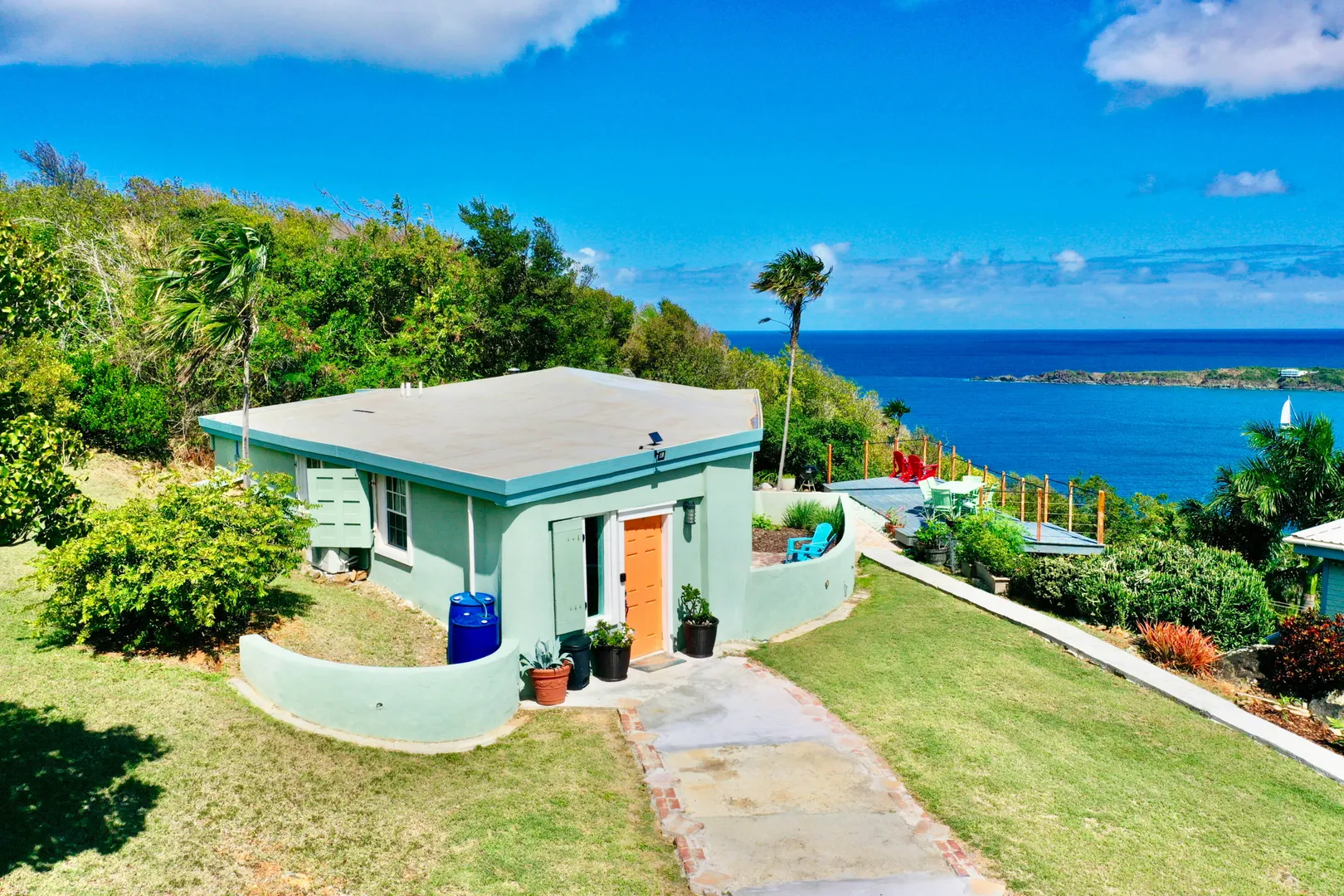 This gorgeous house has several ways to enjoy the island life. Views of the Atlantic Ocean from every room and LOTS of deck space for outdoor living. The house has SOLAR, Tesla battery, net metering AND a 12kw gen. Main house has 2 bedrooms on walk in level with another garage bedroom, two beds and one bath that can be separate from the main house accessible next to the kitchen or a separate stairway and a huge one bedroom bungalow. Beautiful views and LOTS of outdoor living space on an unheard of FLAT yard and 1.5 car garage. See DOCUMENTS tab for additional info.