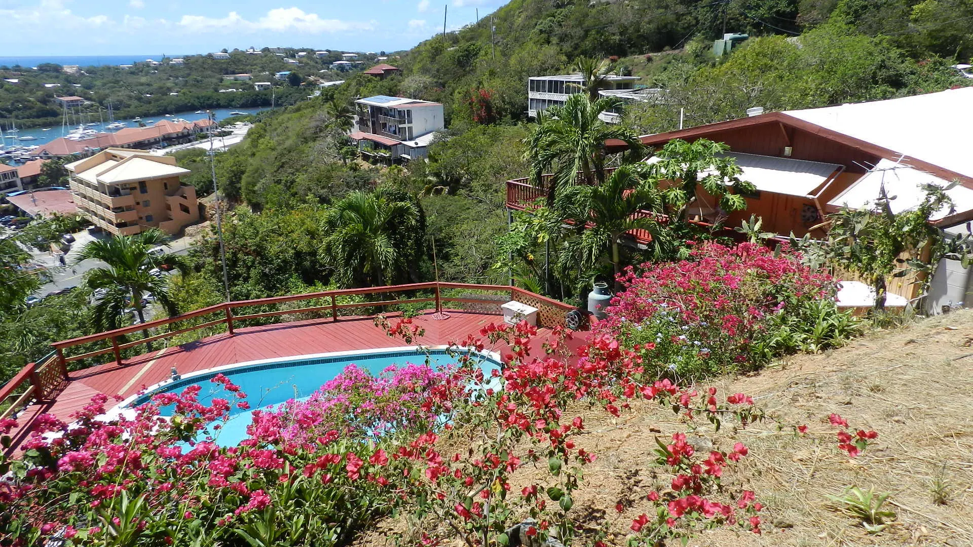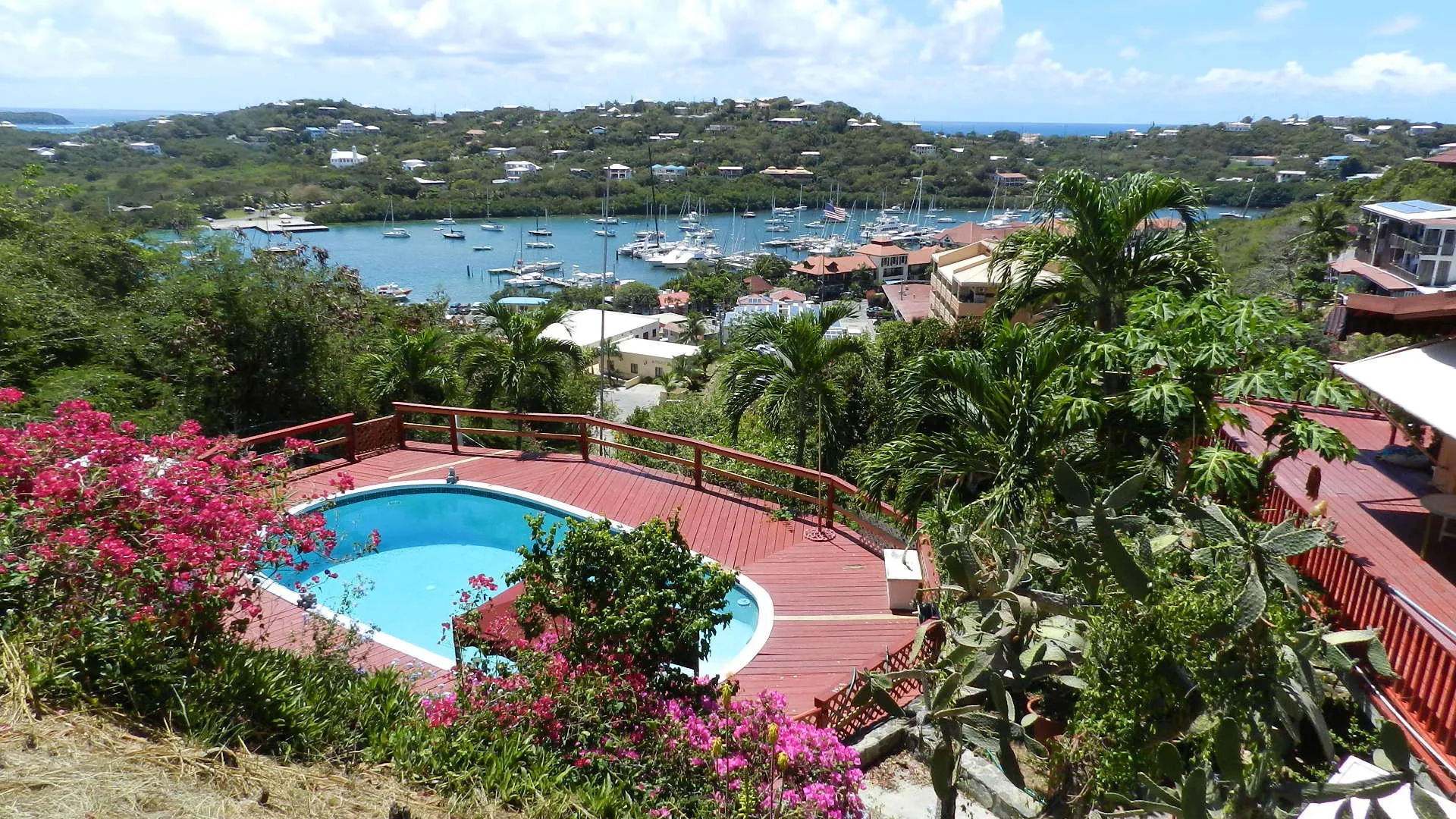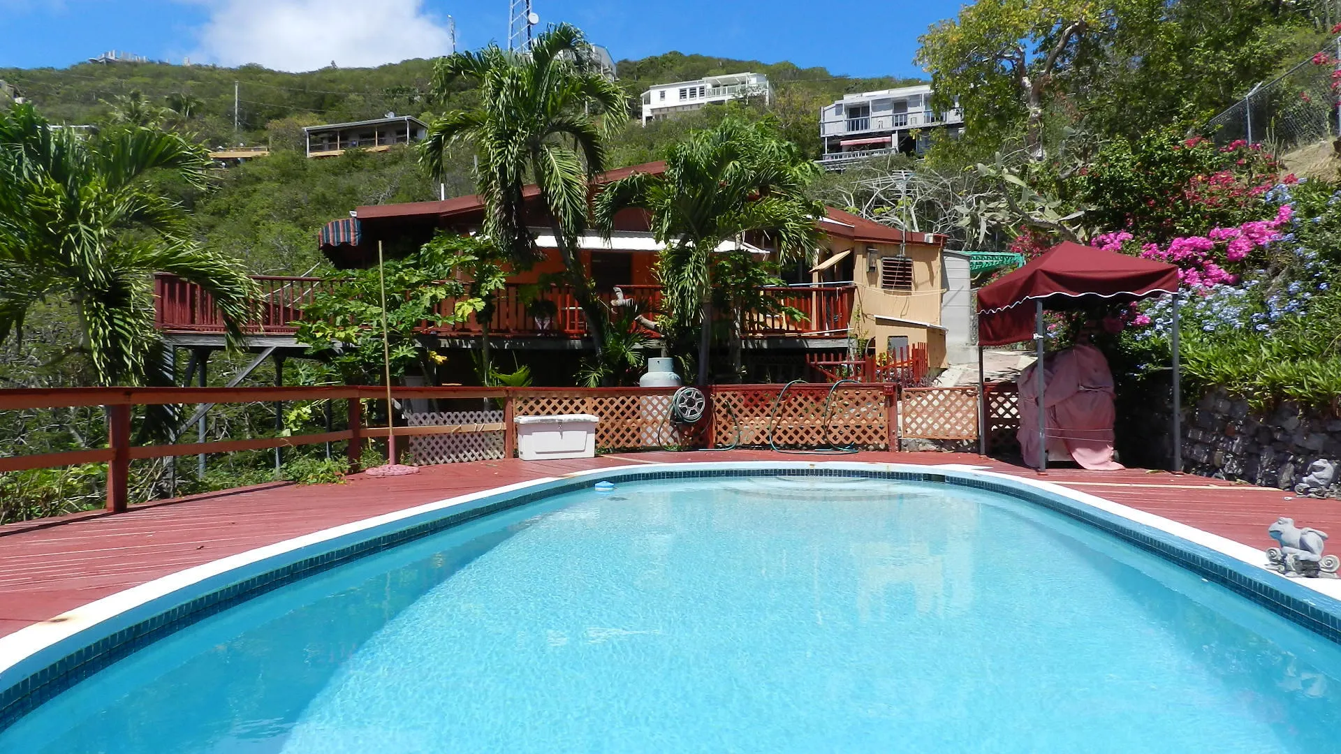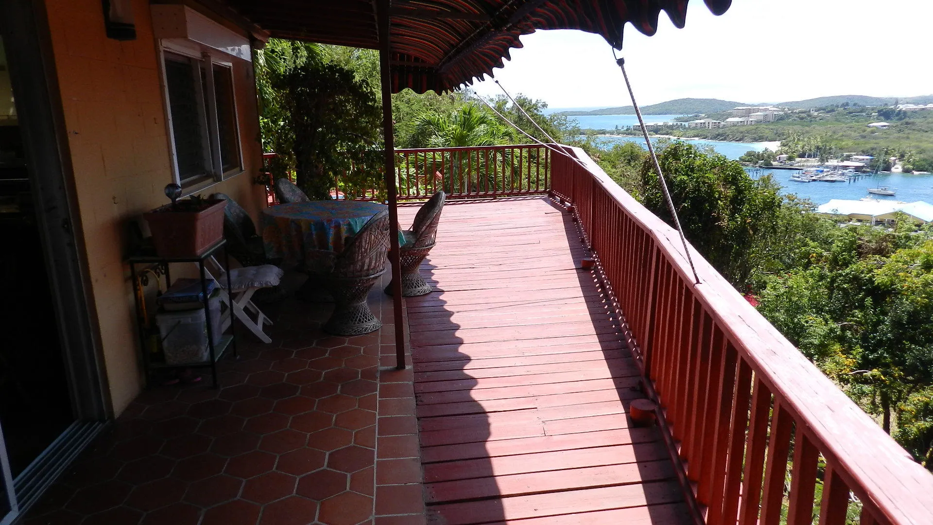 Located high on a breezy hillside above Red Hook village this well built, 3X2, walk in level masonry home is perfect for a family or rental. Panoramic views over Red Hook to St. James island from wrap around decks and large free form pool just steps from home. Large 1x2 apartment generates income. Entire property is fenced, and parking right at doorstep for several cars. R-3 ZONE ALLOWS EXPANSION