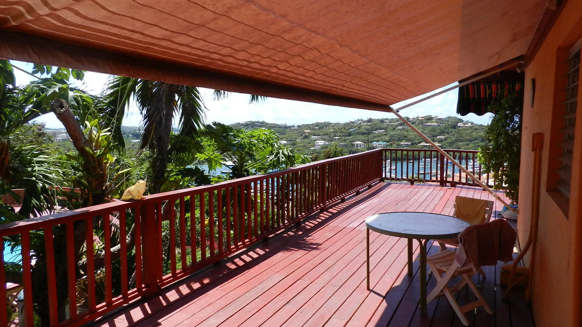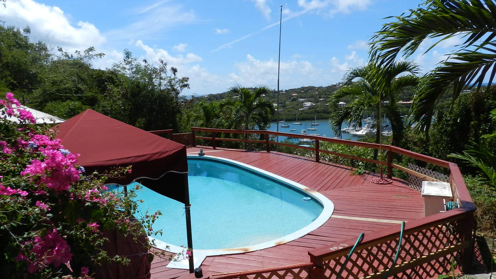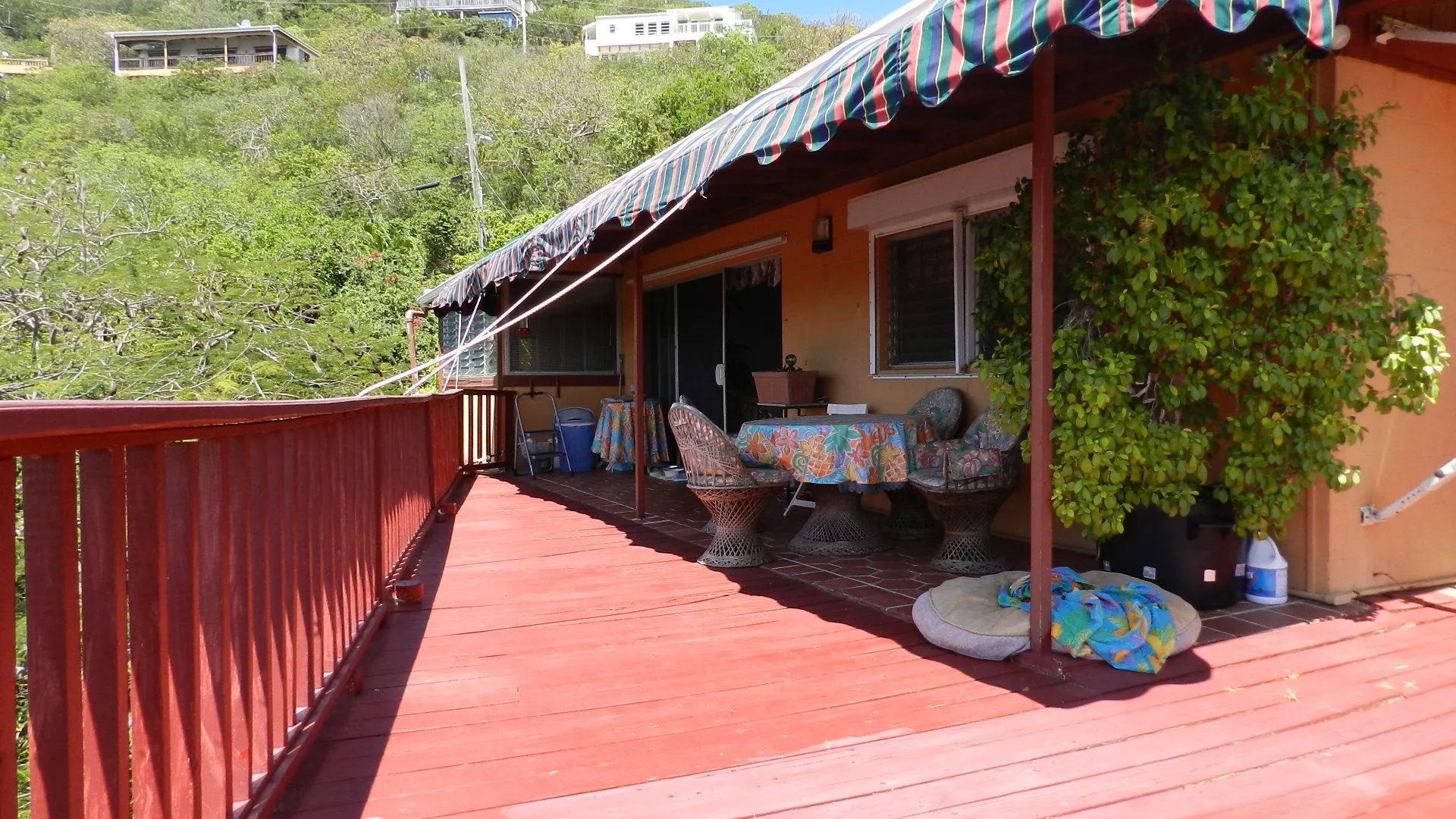 Located high on a breezy hillside above Red Hook village this well built, 3X2, walk in level masonry home is perfect for a family or rental. Panoramic views over Red Hook to St. James island from wrap around decks and large free form pool just steps from home. Large 1x2 apartment generates income. Entire property is fenced, and parking right at doorstep for several cars. R-3 ZONE ALLOWS EXPANSION