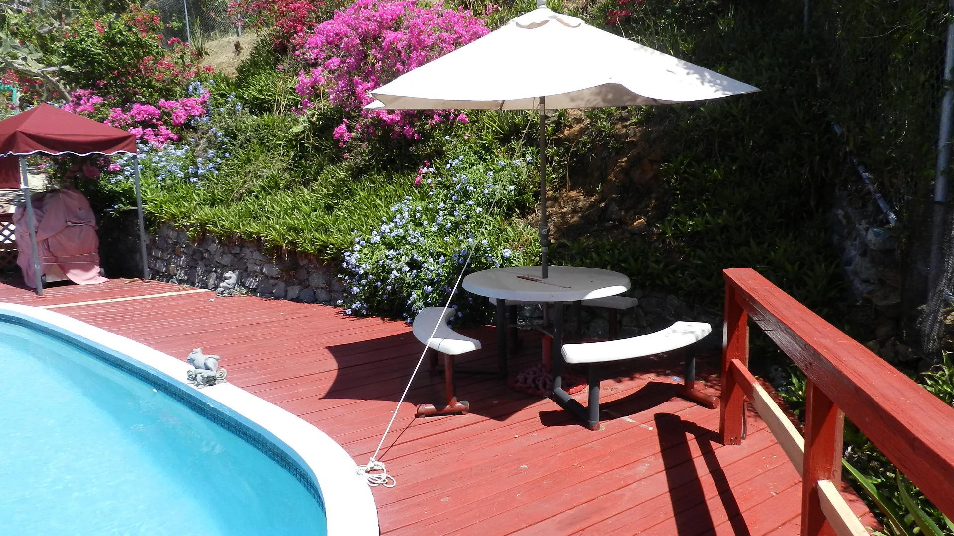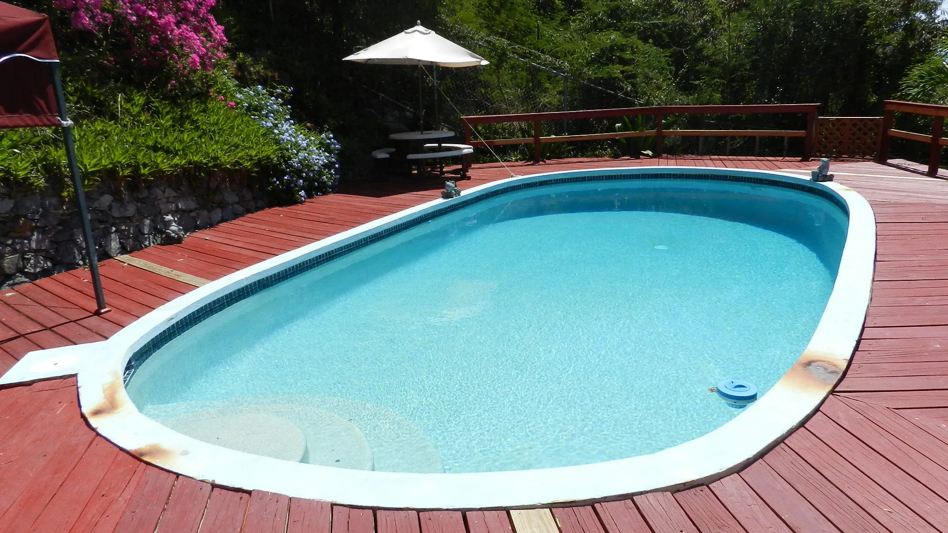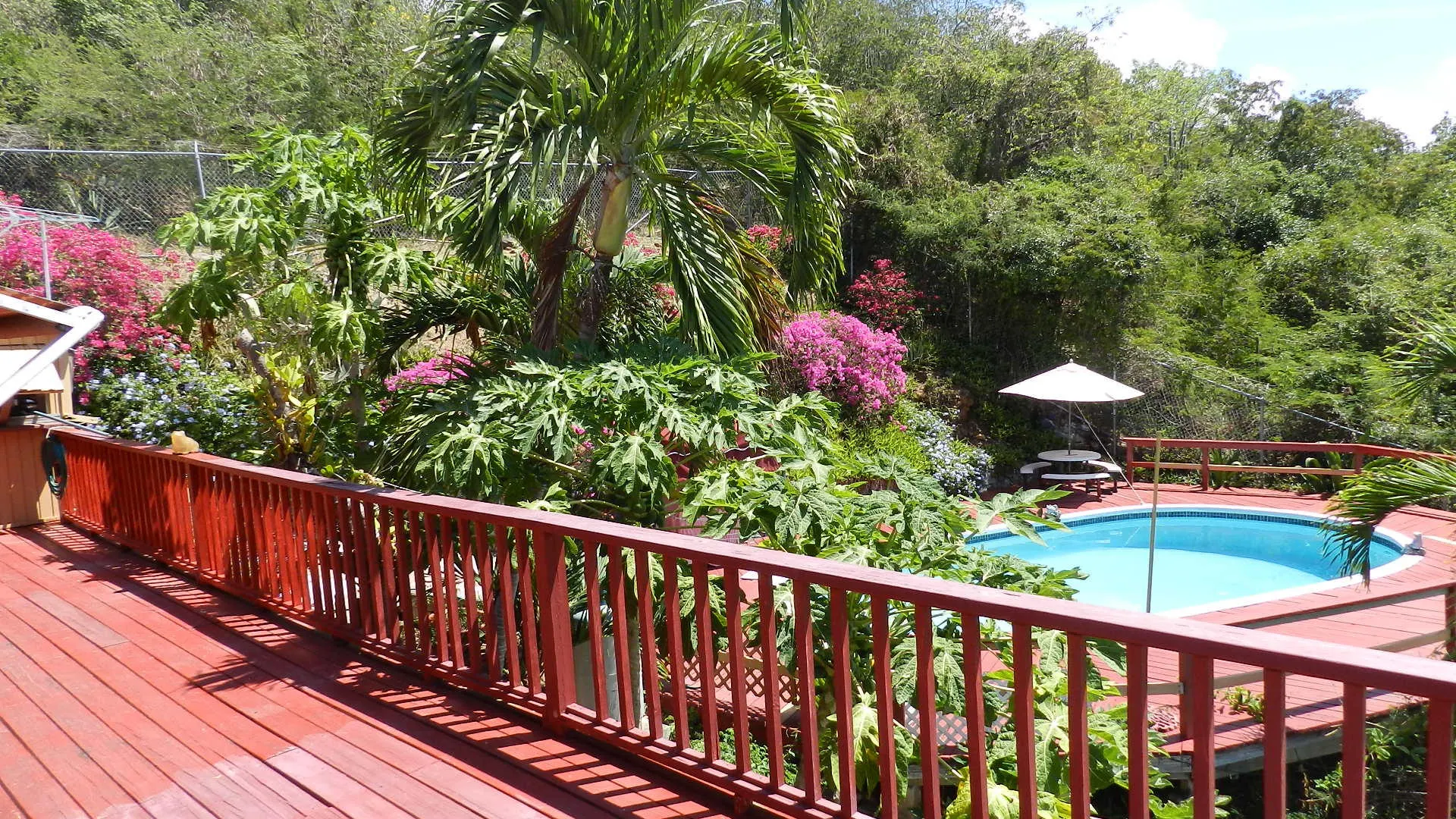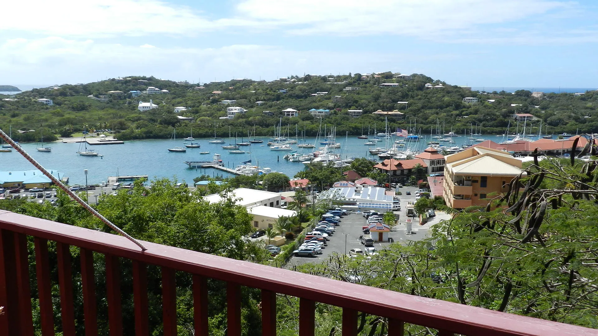 Located high on a breezy hillside above Red Hook village this well built, 3X2, walk in level masonry home is perfect for a family or rental. Panoramic views over Red Hook to St. James island from wrap around decks and large free form pool just steps from home. Large 1x2 apartment generates income. Entire property is fenced, and parking right at doorstep for several cars. R-3 ZONE ALLOWS EXPANSION