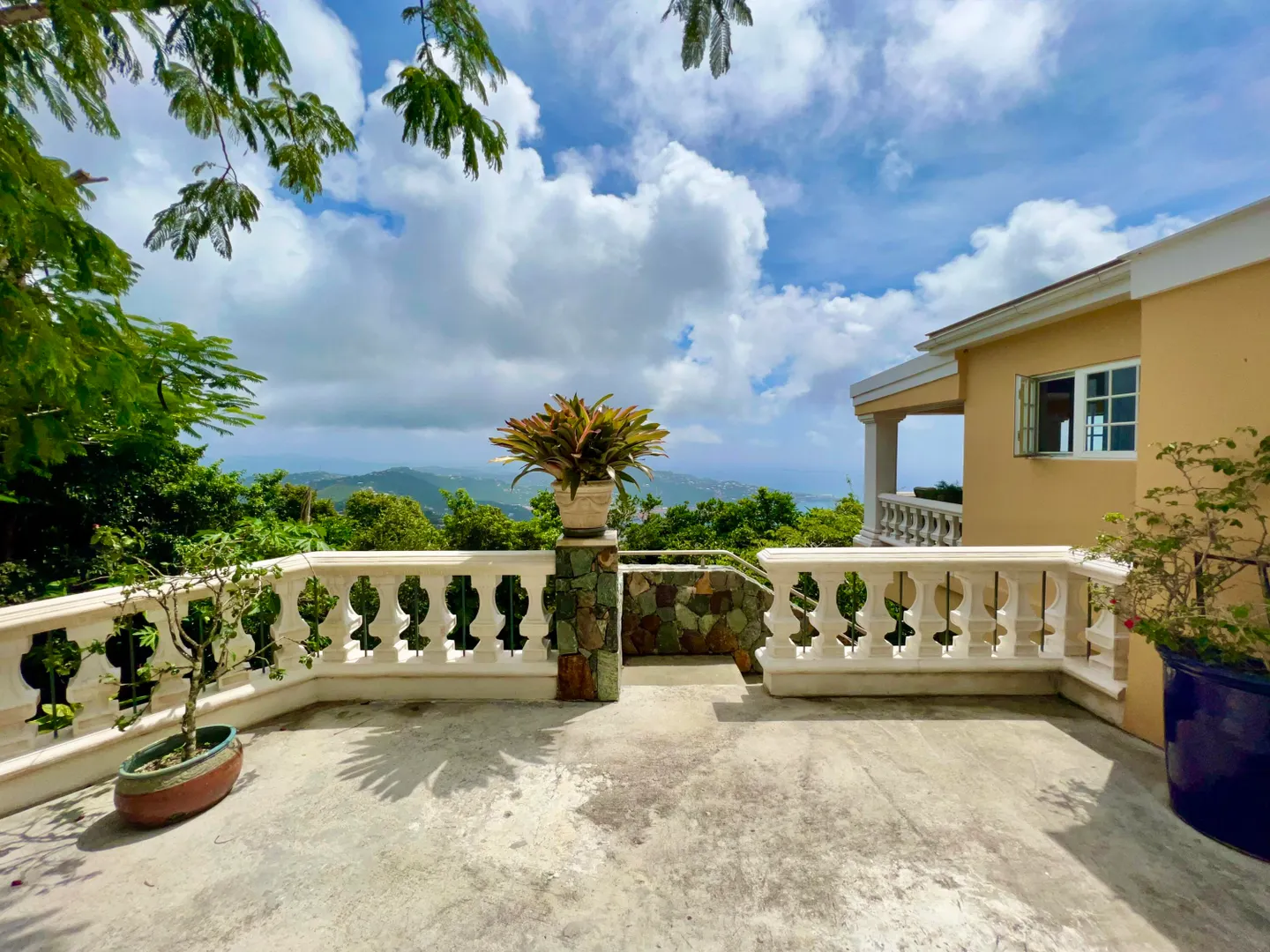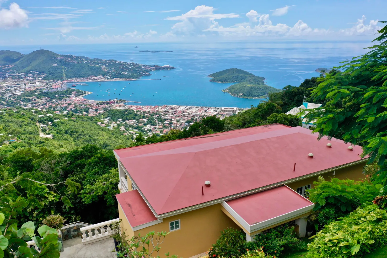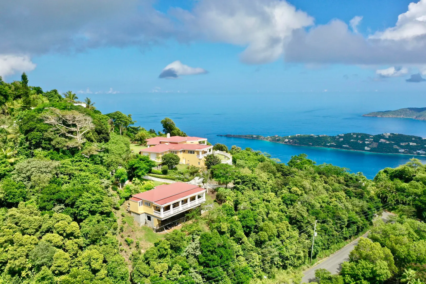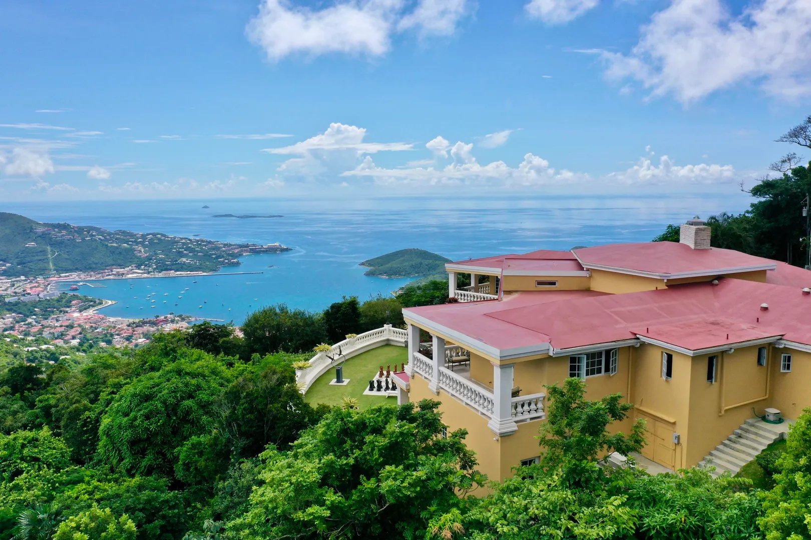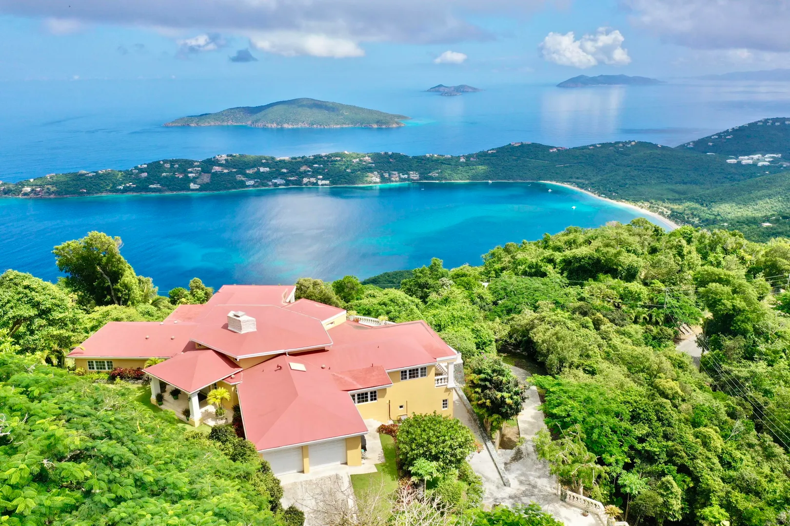 Called ''Trevista'' because of its incomparable (really!) 300 degree views , you can gaze from the master bedroom's expansive veranda out to Magens Bay and the islets off St. Thomas' northwest coast, all the way to the BVI, and even to the twinkling lights of Charlotte Amalie. Built on almost 2 acres in a cool, breezy mountaintop location, the 5BR main house features careful construction and unique finishes including hardwood flooring, custom cabinetry and imported tiles. The ''cottage'' is a full separate 2 BR residence with its own charm, views and parking. A full two car garage, wine cellar, flat grass yards, (with life size chess board!) and beautiful, immaculately maintained, mature gardens are just a few of the extraordinary features of this unique property. Furniture removed.