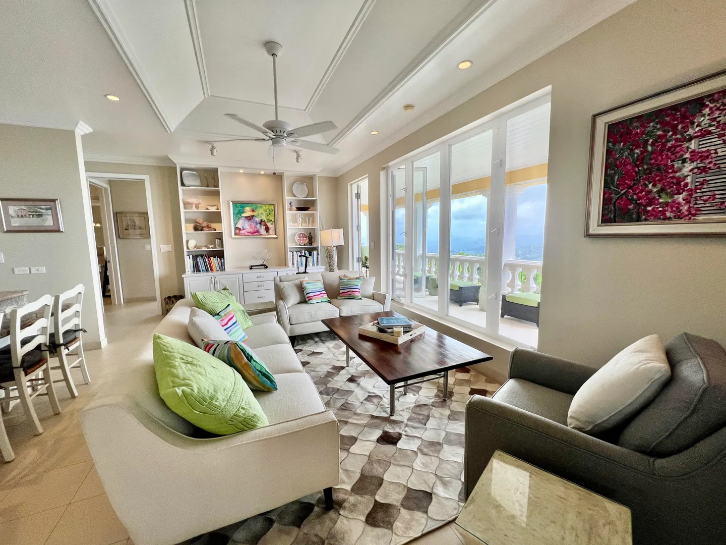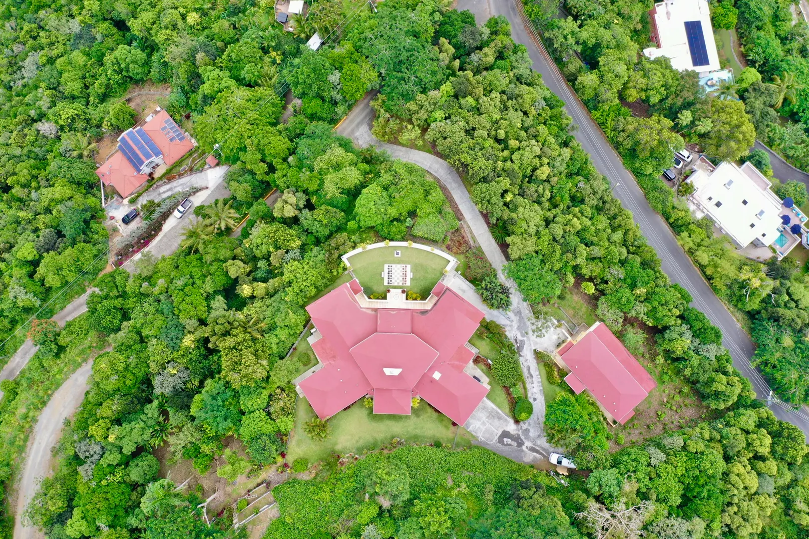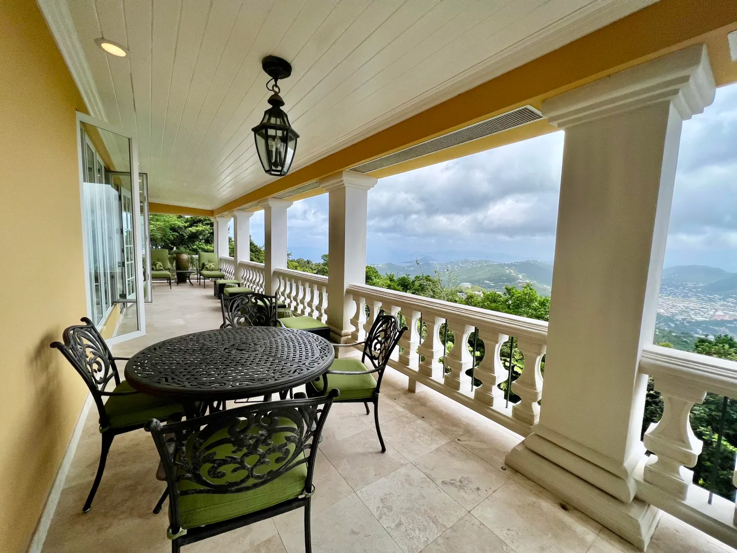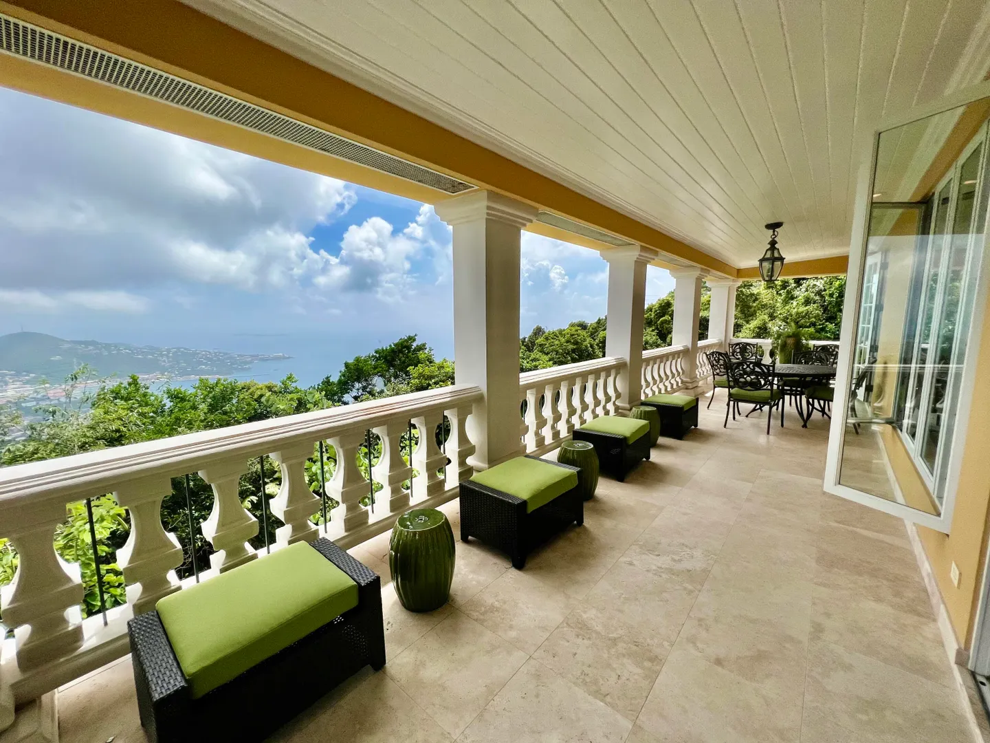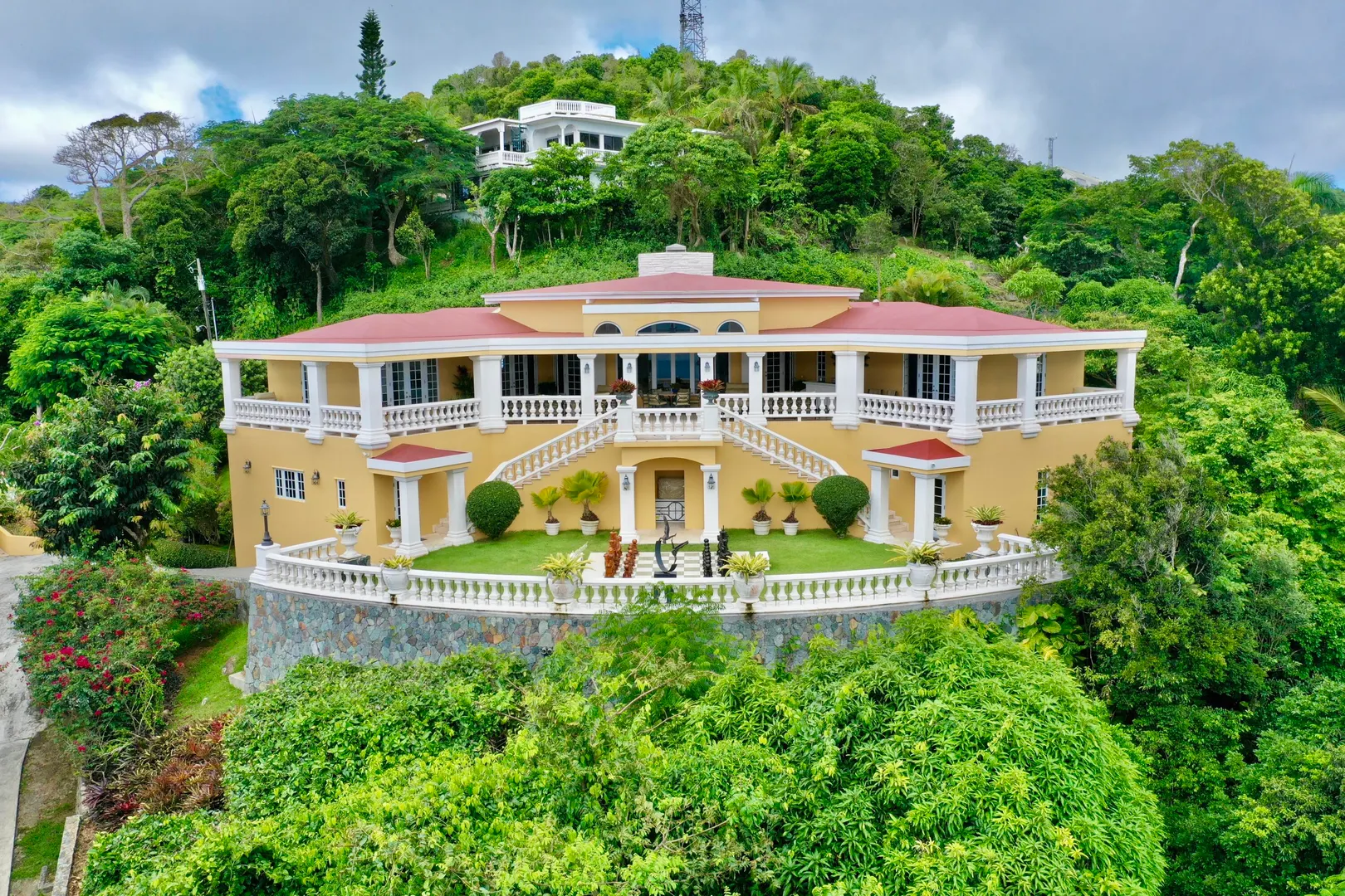 Called ''Trevista'' because of its incomparable (really!) 300 degree views , you can gaze from the master bedroom's expansive veranda out to Magens Bay and the islets off St. Thomas' northwest coast, all the way to the BVI, and even to the twinkling lights of Charlotte Amalie. Built on almost 2 acres in a cool, breezy mountaintop location, the 5BR main house features careful construction and unique finishes including hardwood flooring, custom cabinetry and imported tiles. The ''cottage'' is a full separate 2 BR residence with its own charm, views and parking. A full two car garage, wine cellar, flat grass yards, (with life size chess board!) and beautiful, immaculately maintained, mature gardens are just a few of the extraordinary features of this unique property. Furniture removed.