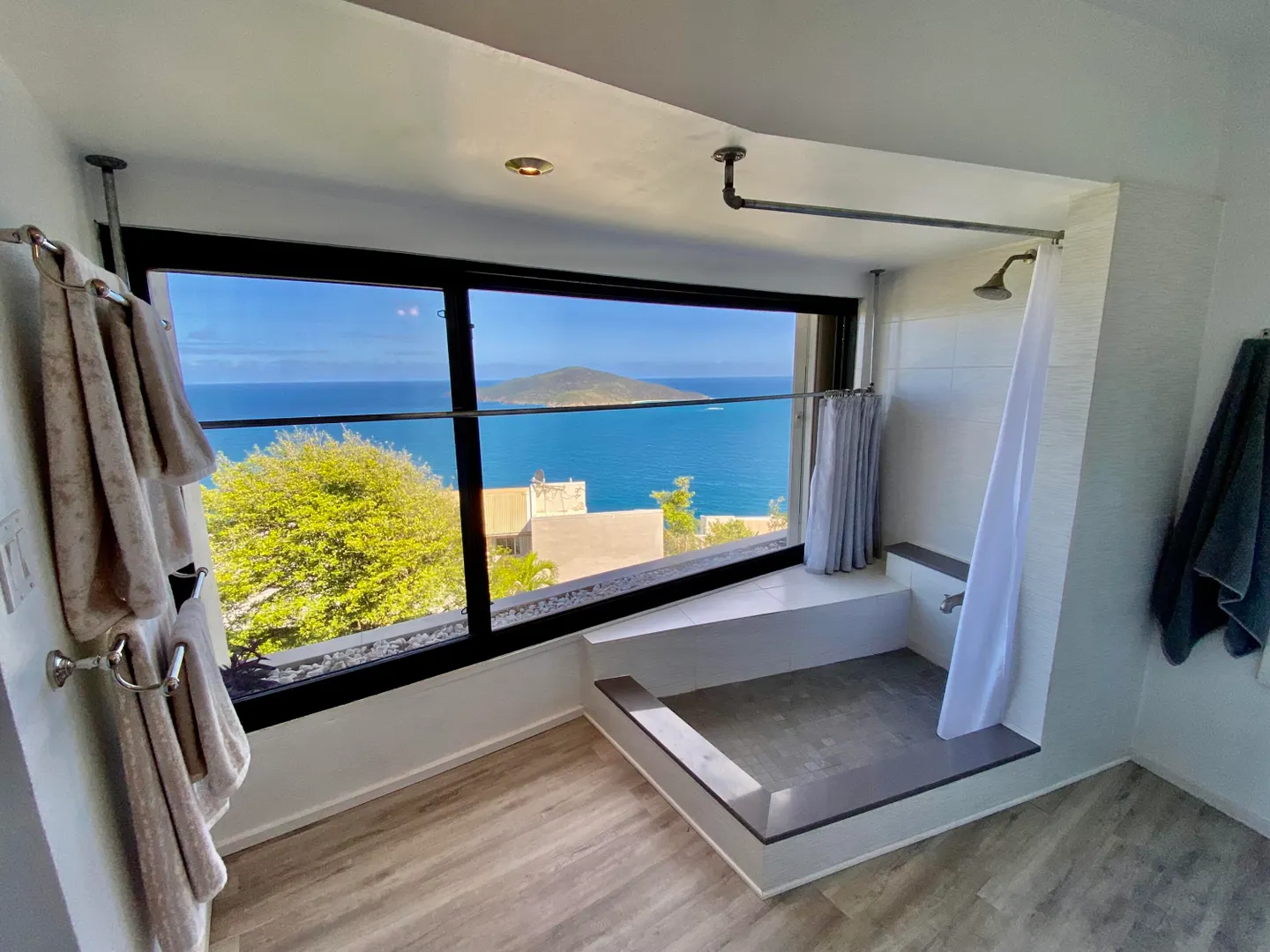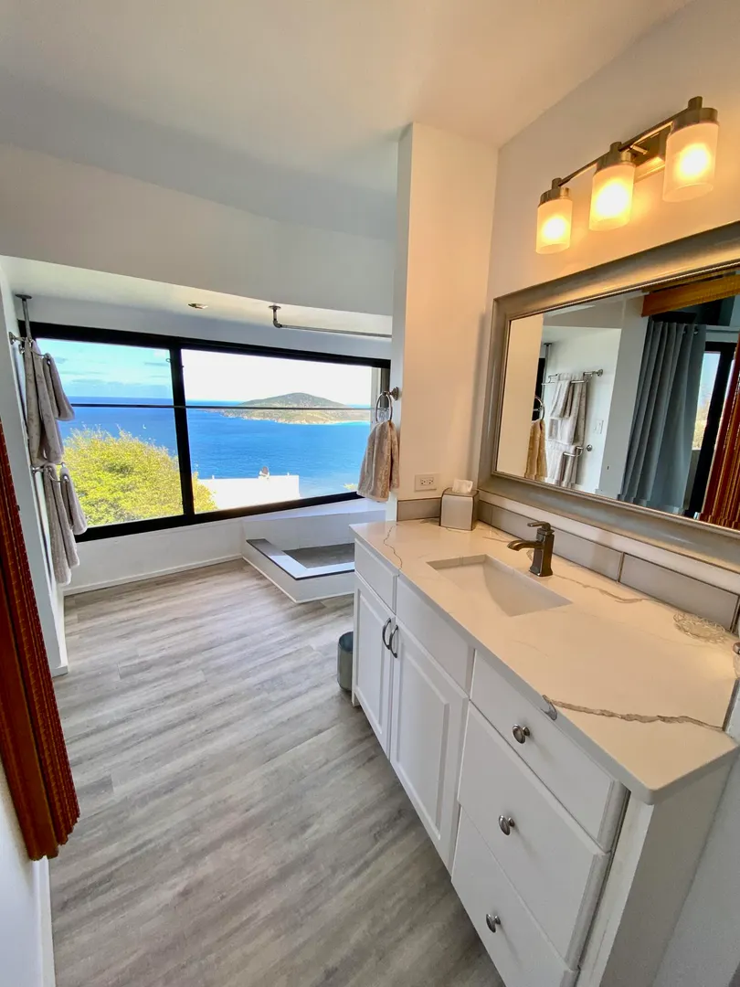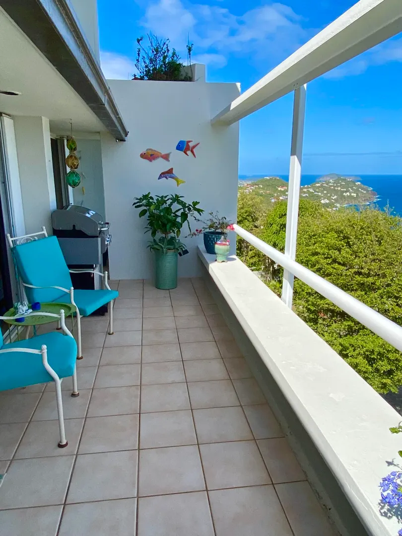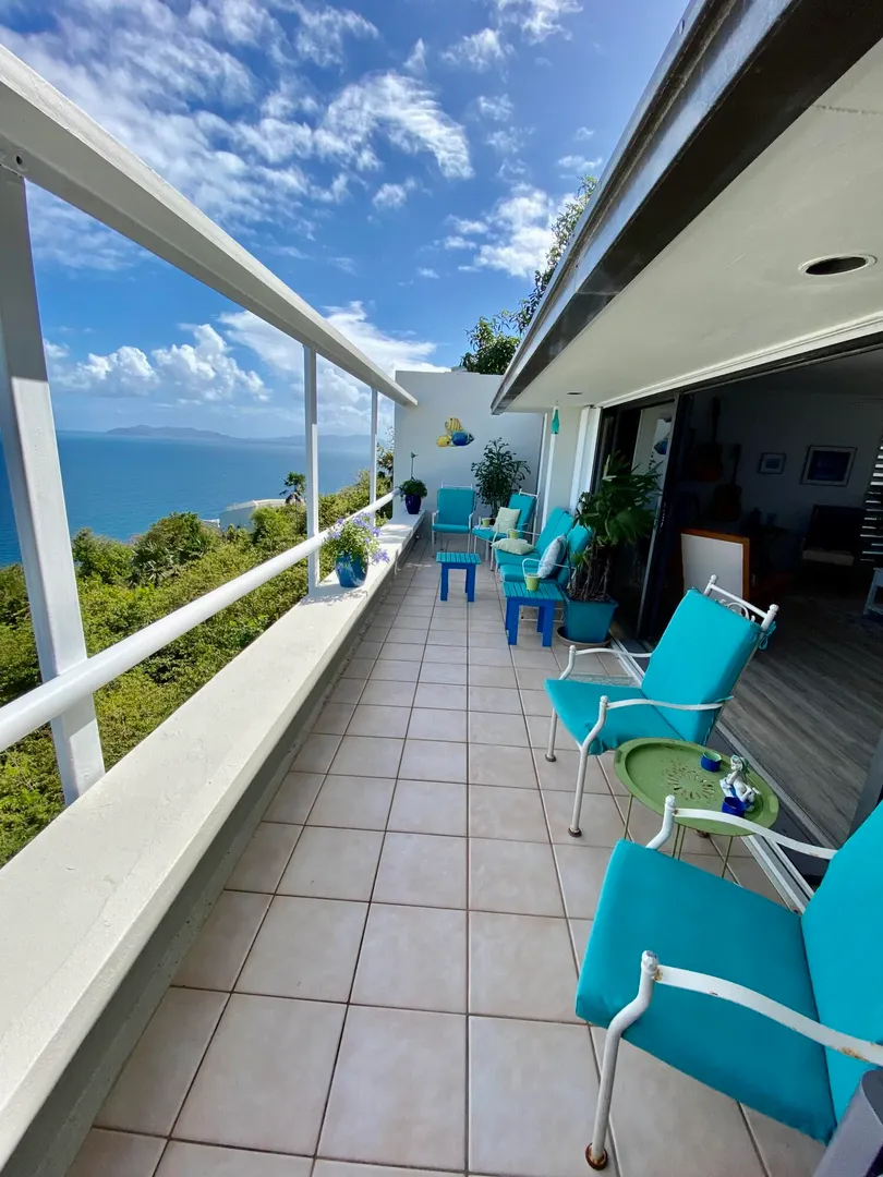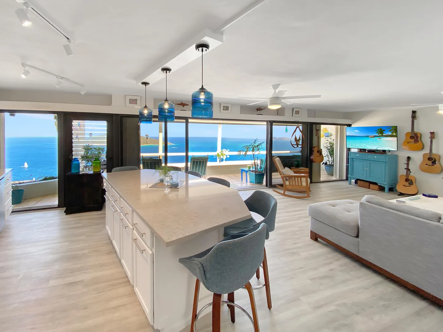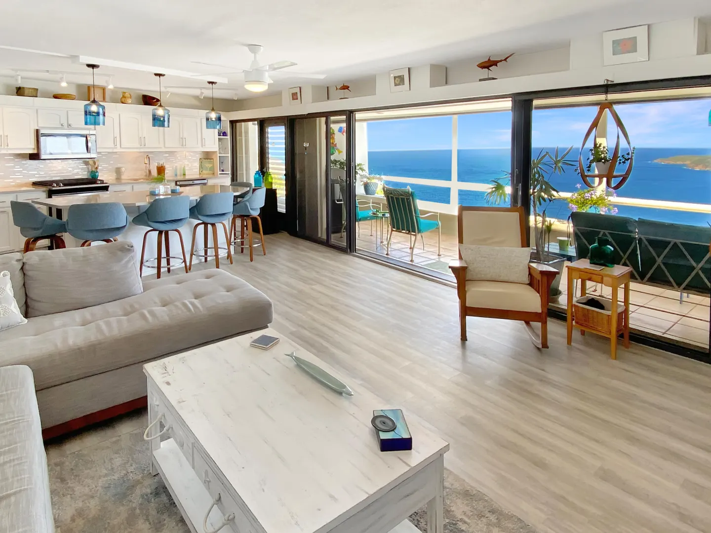 This two bedroom, two bath condominium has all the fine points for a perfect island retreat. With an encompassing view including all of the cays from St. Thomas to Tortola and west to Magens Bay, it offers spectacular sunrise and sunset vistas. Cooled by the prevailing tradewinds use of AC is truly optional. Fully remodeled in 2021 with calming coastal colors, it hits just the right aesthetic for an island home or part time residence. Walk in level and it's located right across from the Sanderling Pool. Mahogany Run is centrally located on St Thomas north shore, just a 5 minute drive to the renowned Magens Bay, the go to spot for paddling, swimming and runners or just enjoying the incredible beauty.