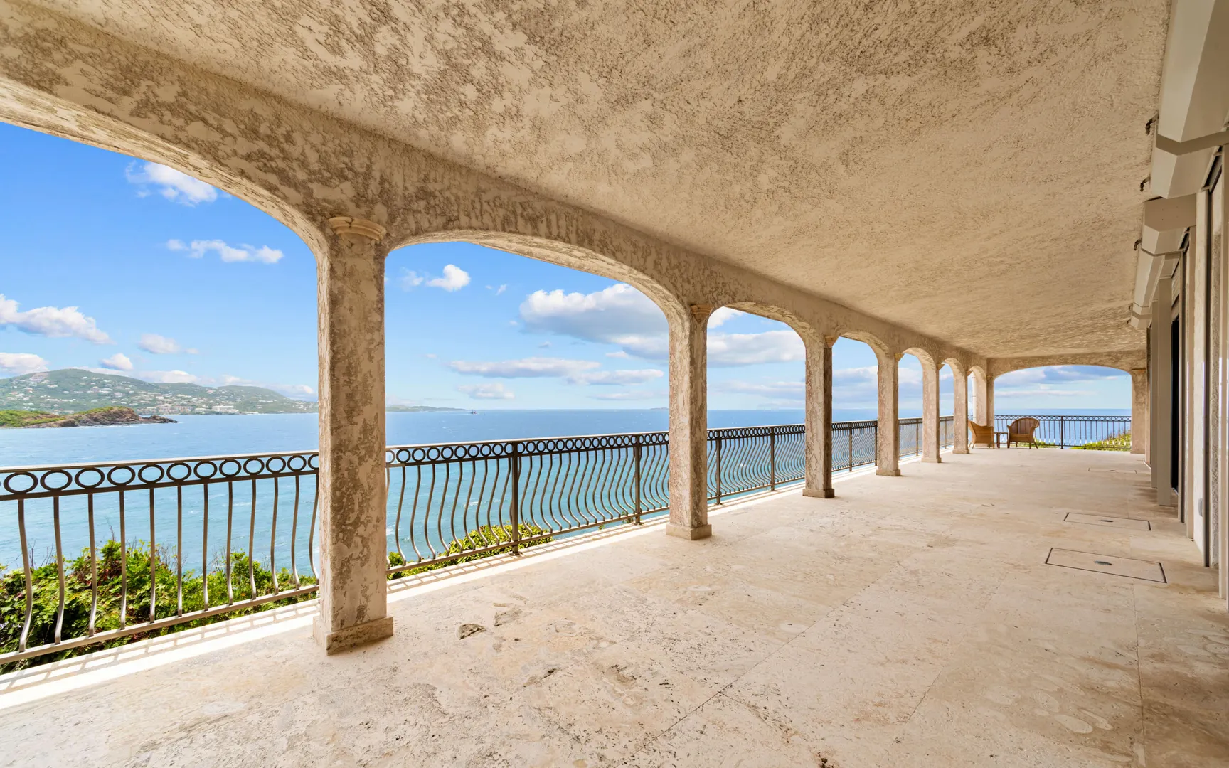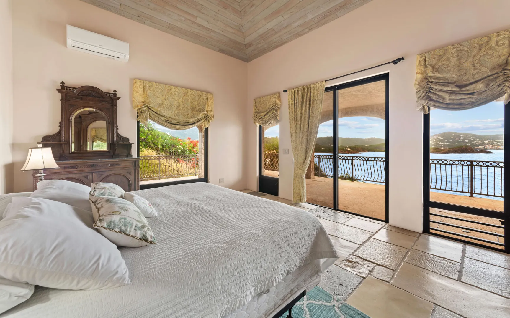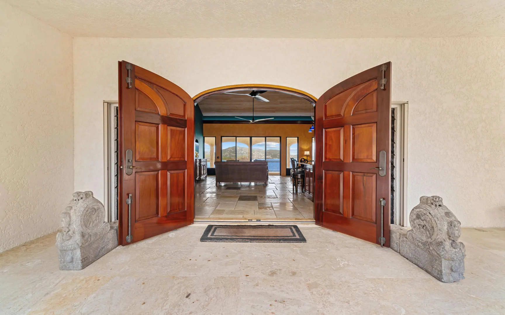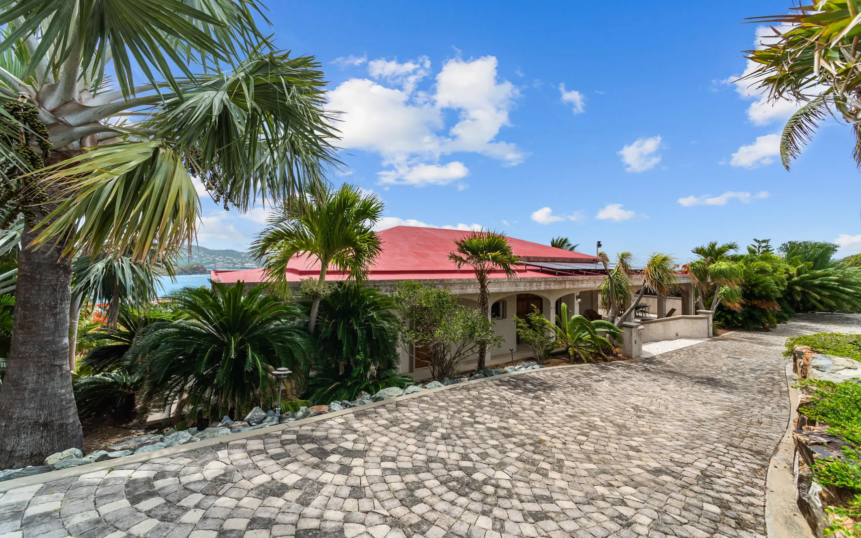 Meticulously engineered yet effortlessly livable, this Mediterranean-inspired villa at 29 Water Island was designed to embrace the Caribbean lifestyle while minimizing long-term maintenance. Solid concrete construction, an 8'' poured concrete and gunite roof, epoxy-coated rebar, and a coral stone plaster exterior provide enduring quality--allowing more time to enjoy island life and less time worrying about upkeep.Thoughtfully designed for comfort and independence, the home offers approximately 4,000 square feet of roof water collection, 35,000 gallons of cistern storage, solar panels, solar hot water, and a full battery backup system--supporting a relaxed, self-sufficient way of living.Inside, soaring pickled cypress ceilings, custom mahogany doors and cabinetry, and bronze-anodized windows and doors create a warm, timeless atmosphere that flows seamlessly to expansive covered coral stone decks, ideal for morning coffee, sunset dinners, and easy indoor-outdoor living.