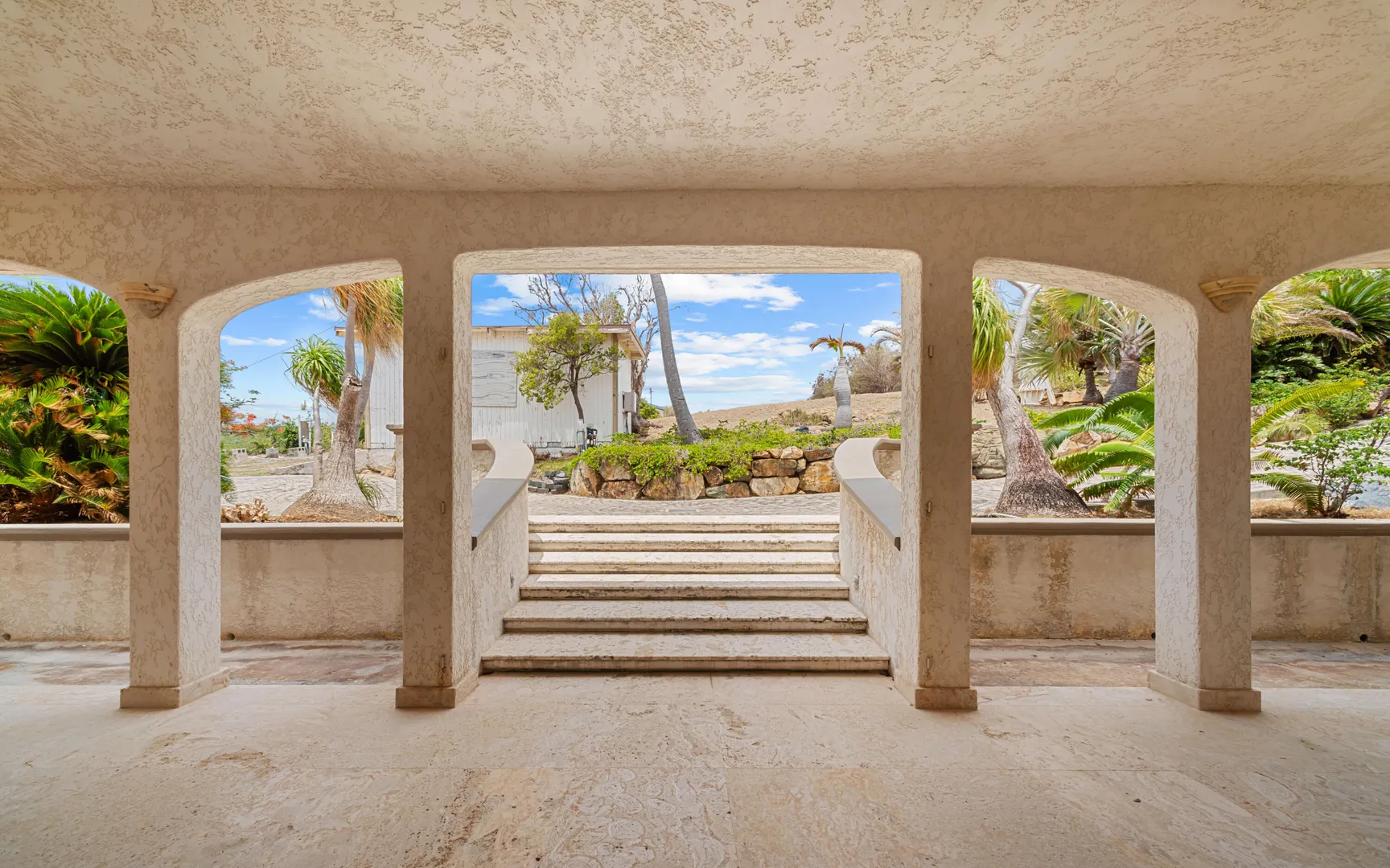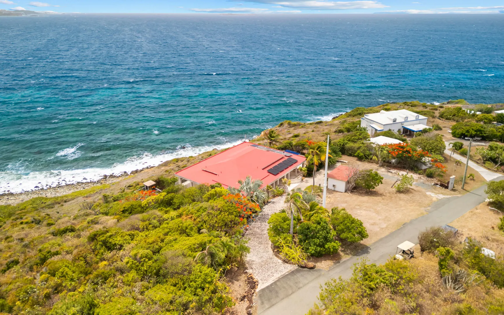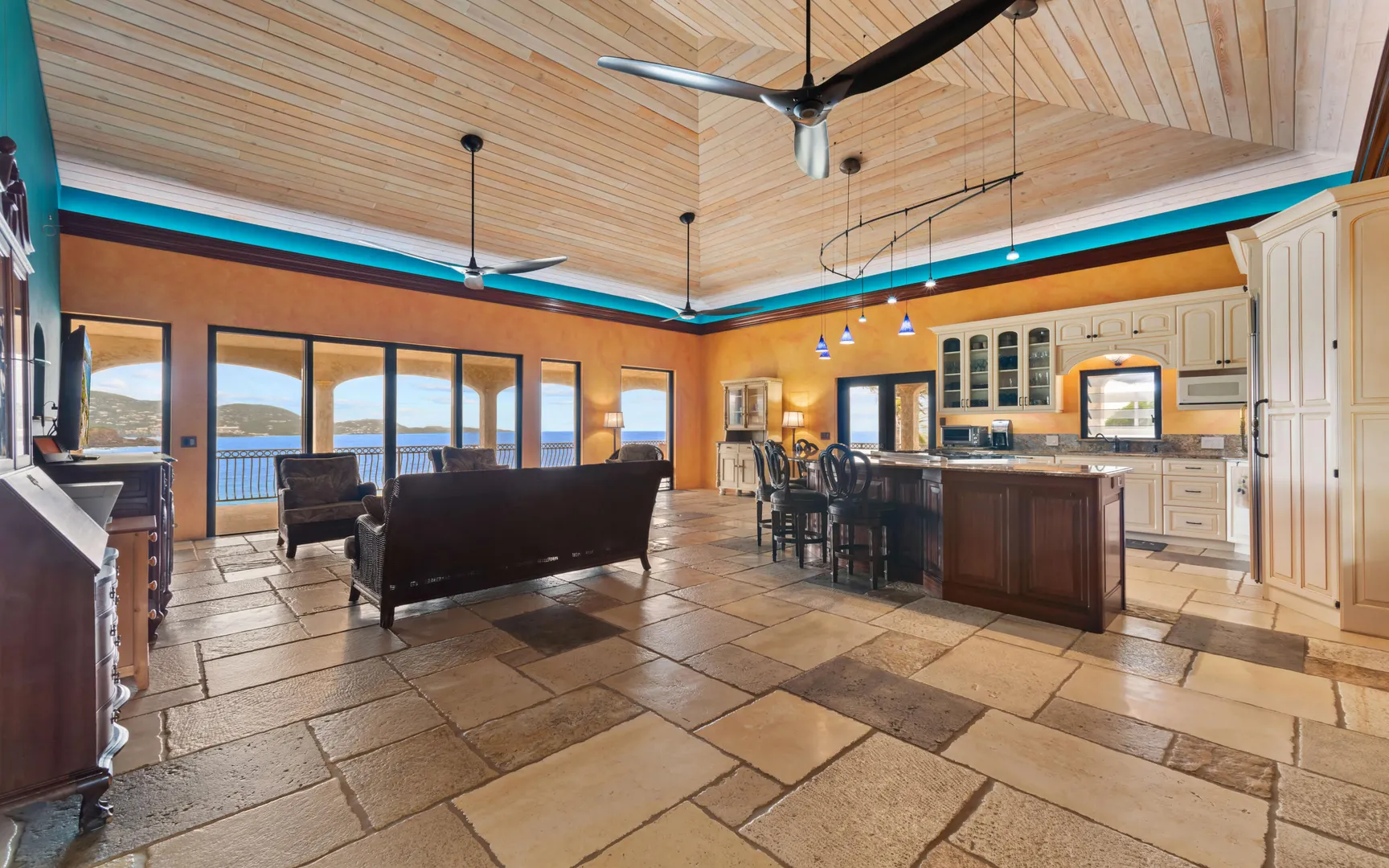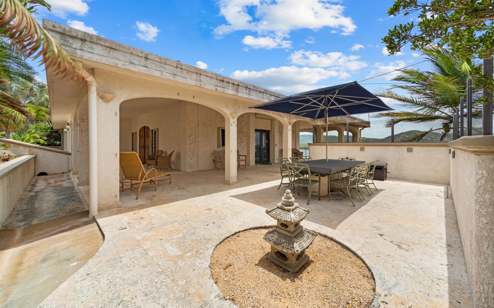 Meticulously engineered yet effortlessly livable, this Mediterranean-inspired villa at 29 Water Island was designed to embrace the Caribbean lifestyle while minimizing long-term maintenance. Solid concrete construction, an 8'' poured concrete and gunite roof, epoxy-coated rebar, and a coral stone plaster exterior provide enduring quality--allowing more time to enjoy island life and less time worrying about upkeep.Thoughtfully designed for comfort and independence, the home offers approximately 4,000 square feet of roof water collection, 35,000 gallons of cistern storage, solar panels, solar hot water, and a full battery backup system--supporting a relaxed, self-sufficient way of living.Inside, soaring pickled cypress ceilings, custom mahogany doors and cabinetry, and bronze-anodized windows and doors create a warm, timeless atmosphere that flows seamlessly to expansive covered coral stone decks, ideal for morning coffee, sunset dinners, and easy indoor-outdoor living.
