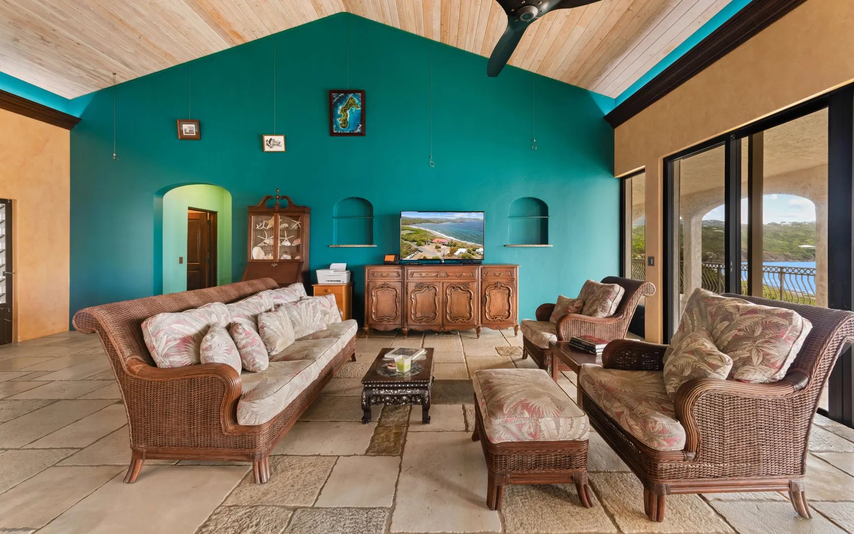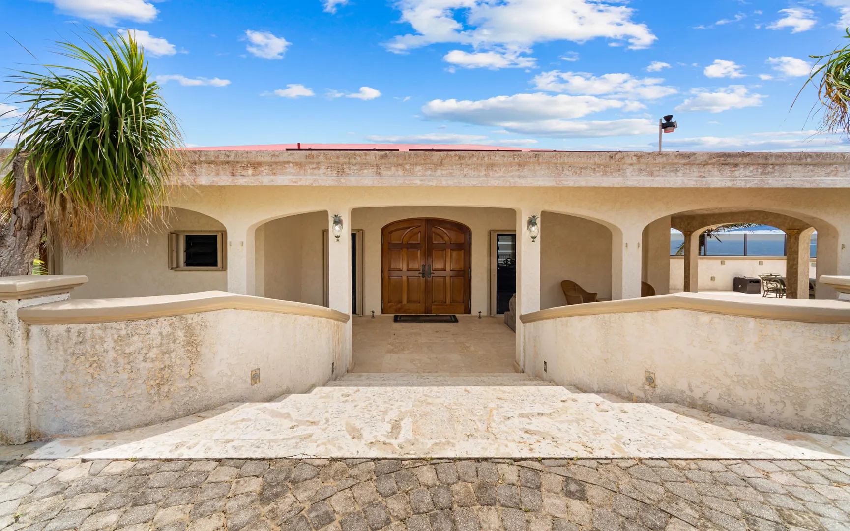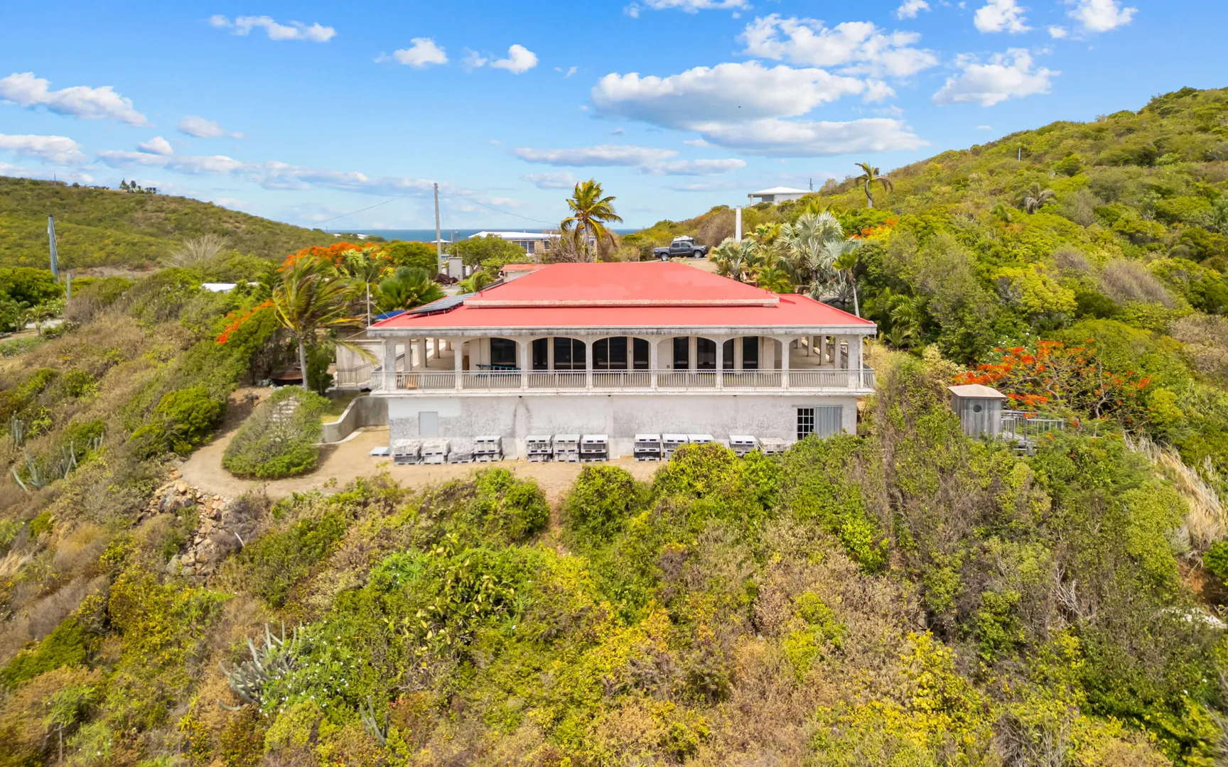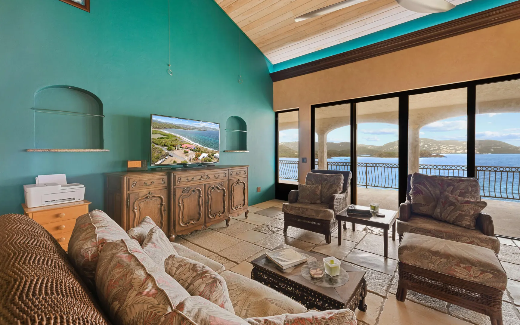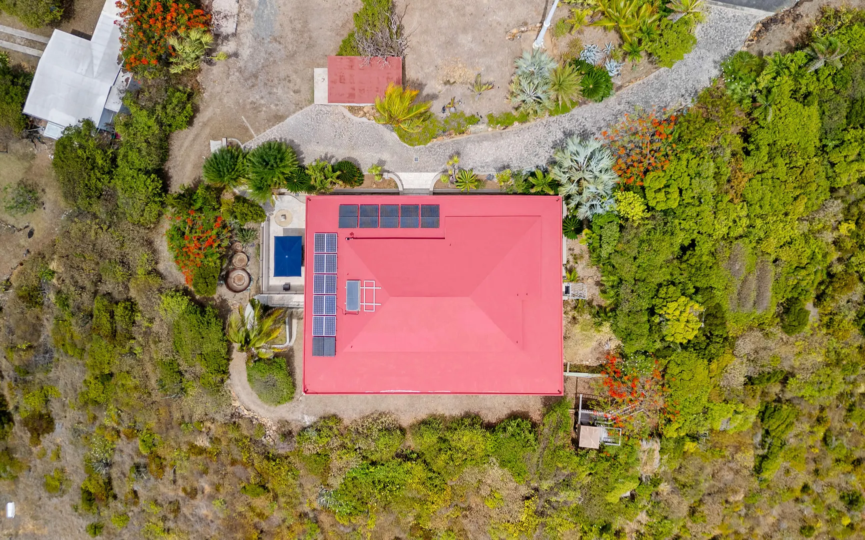 Meticulously engineered yet effortlessly livable, this Mediterranean-inspired villa at 29 Water Island was designed to embrace the Caribbean lifestyle while minimizing long-term maintenance. Solid concrete construction, an 8'' poured concrete and gunite roof, epoxy-coated rebar, and a coral stone plaster exterior provide enduring quality--allowing more time to enjoy island life and less time worrying about upkeep.Thoughtfully designed for comfort and independence, the home offers approximately 4,000 square feet of roof water collection, 35,000 gallons of cistern storage, solar panels, solar hot water, and a full battery backup system--supporting a relaxed, self-sufficient way of living.Inside, soaring pickled cypress ceilings, custom mahogany doors and cabinetry, and bronze-anodized windows and doors create a warm, timeless atmosphere that flows seamlessly to expansive covered coral stone decks, ideal for morning coffee, sunset dinners, and easy indoor-outdoor living.