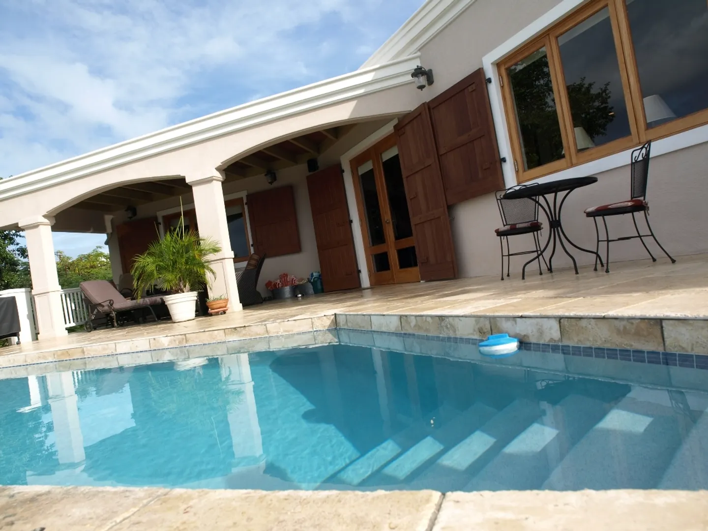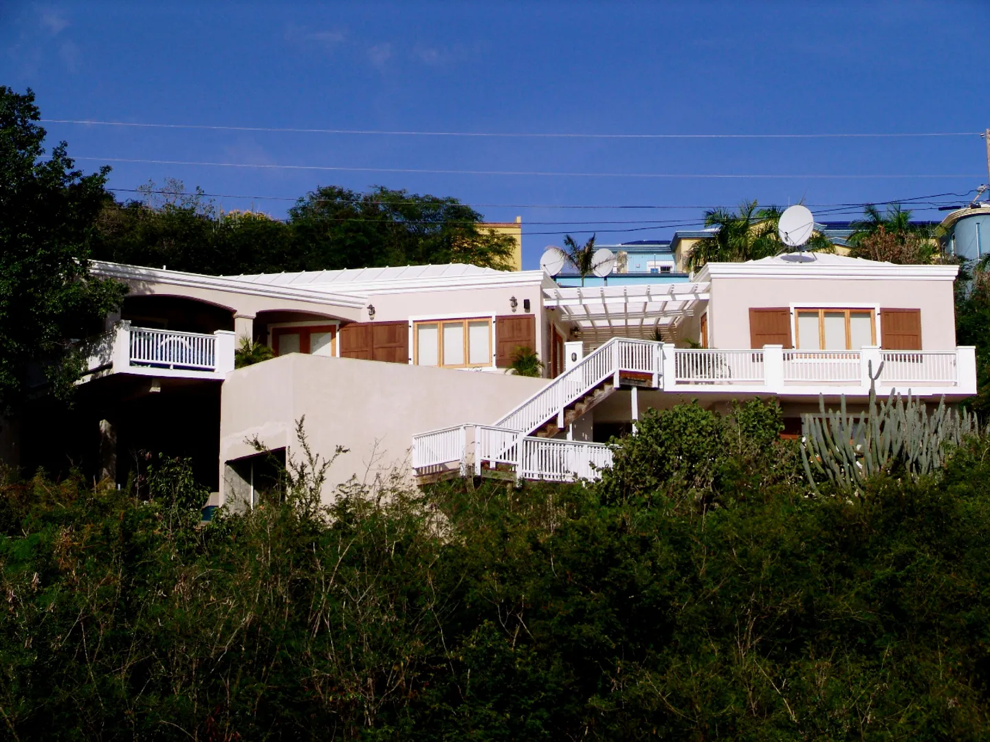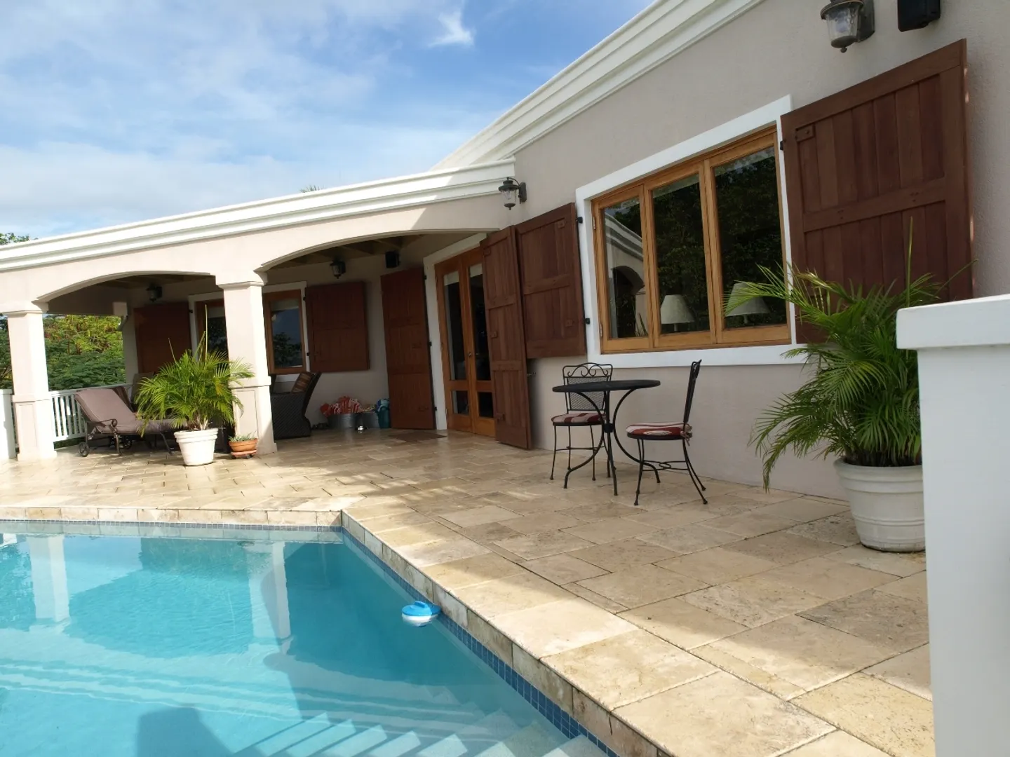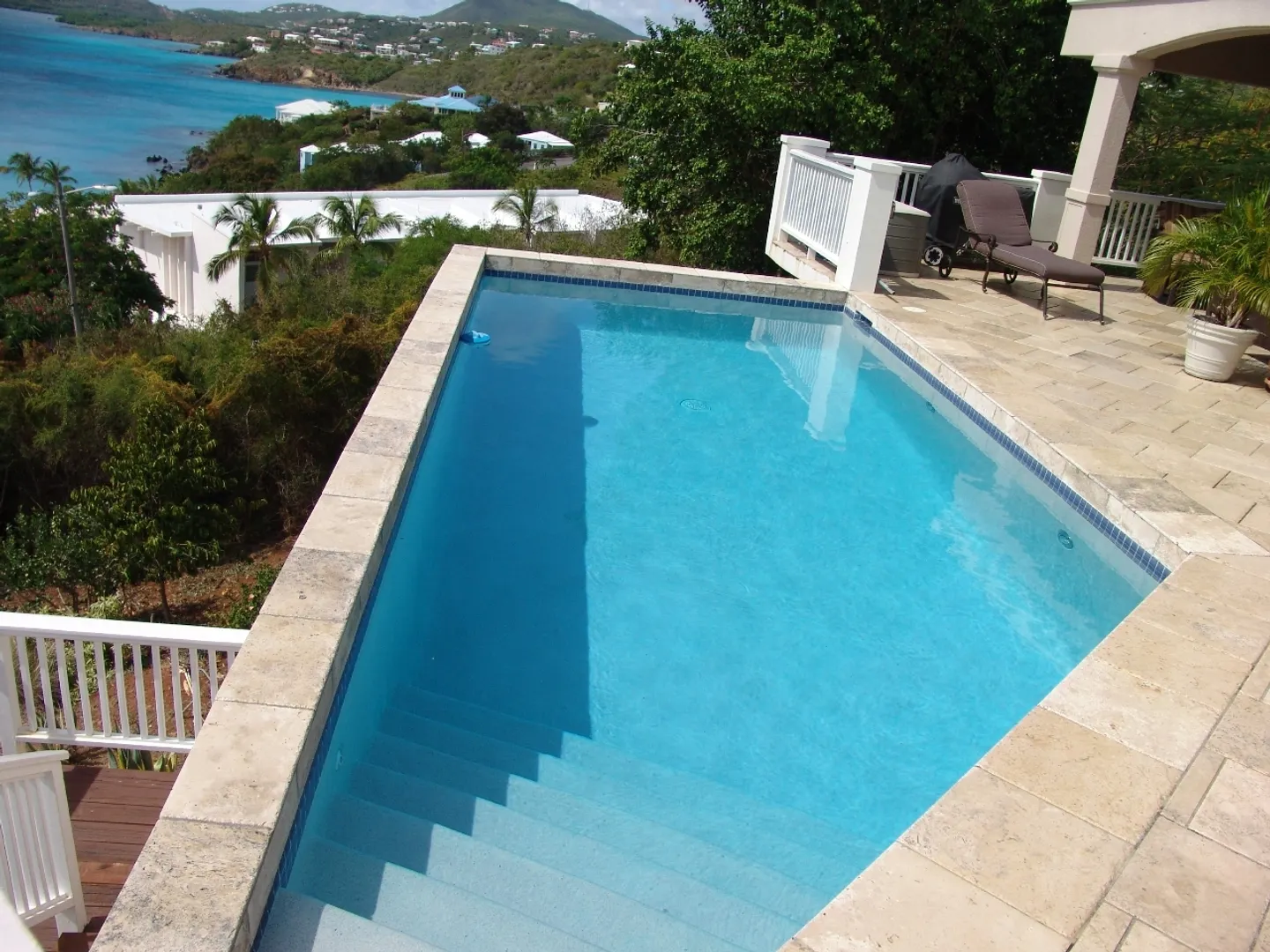 Set above Secret Harbour, this beautiful three bedroom home has all that you could want. Location, views, swimming pool, gourmet kitchen, custom cabinetry, travertine throughout, lush professional landscaping, gated drive with ample parking and more!! Truly a home for the discriminating. Built by JPK Development in 2007, the attention to detail is remarkable. Vauled ceilings and custom windows andcustom windows shades are just a few of the extras. The kitchen boasts a Wolf 6 burner gas stove, Trash compactor, GE Profile convection oven, microwave and refrigerator. Propane Gaurdian generator (17 KW) and on demand propane hot water heaters help with the WAPA bills. There is a satellite for Dish Network and a satellite receiver for Broadband Internet. Four interior and two exterior speakers for easy listening! All in a setting that is truly a Caribbean Paradise.