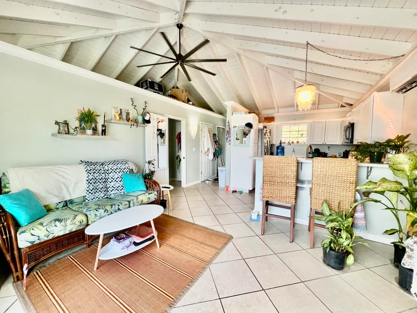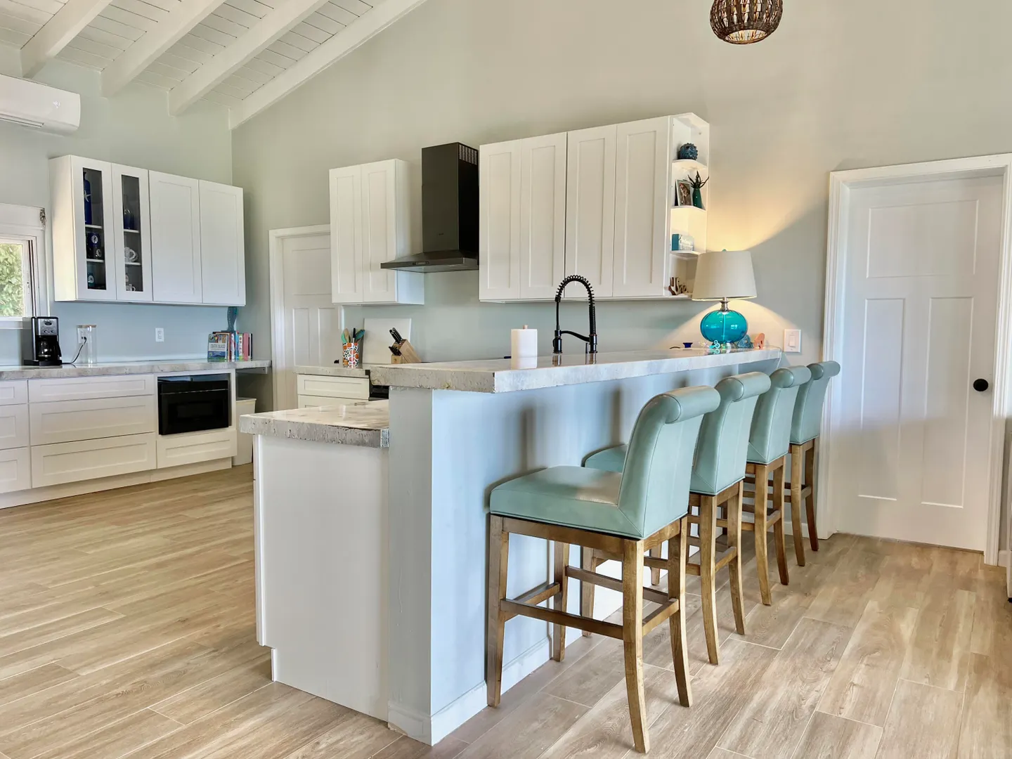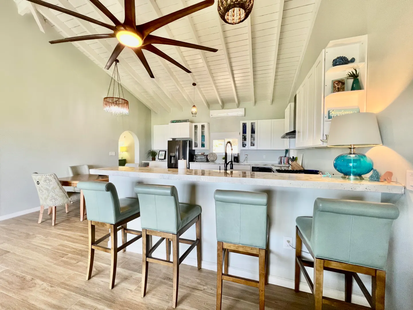 This remarkable property offers a seamless blend of modernity, privacy, and natural splendor. The two-story, newly constructed main house features two bedrooms and two bathrooms on the upper level, and an extraordinary four car garage on the lower level with a bonus unfinished room to make your own. A separate stand-alone one bedroom one bathroom cottage expands the value of this unique island retreat. The heart of the main home lies in the oversized kitchen, complete with upgraded stainless-steel appliances and custom concrete countertops adorned with seaglass inserts. Gather around the 10-foot bar on its leather swivel bar stools. The spacious bedrooms provide private refuges, while the custom-tiled shower in the master bathroom and the bathtub in the guest room offer moments of