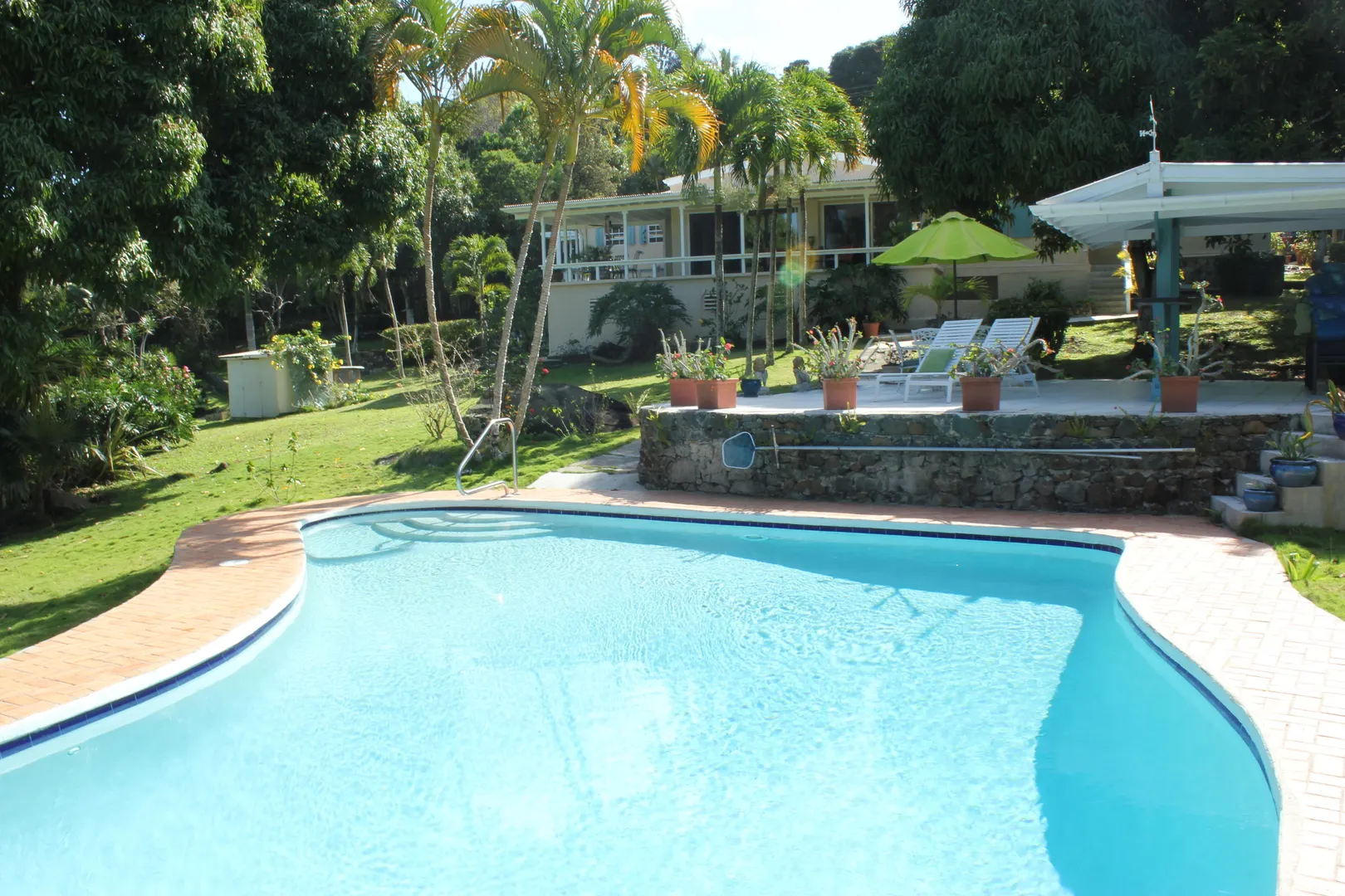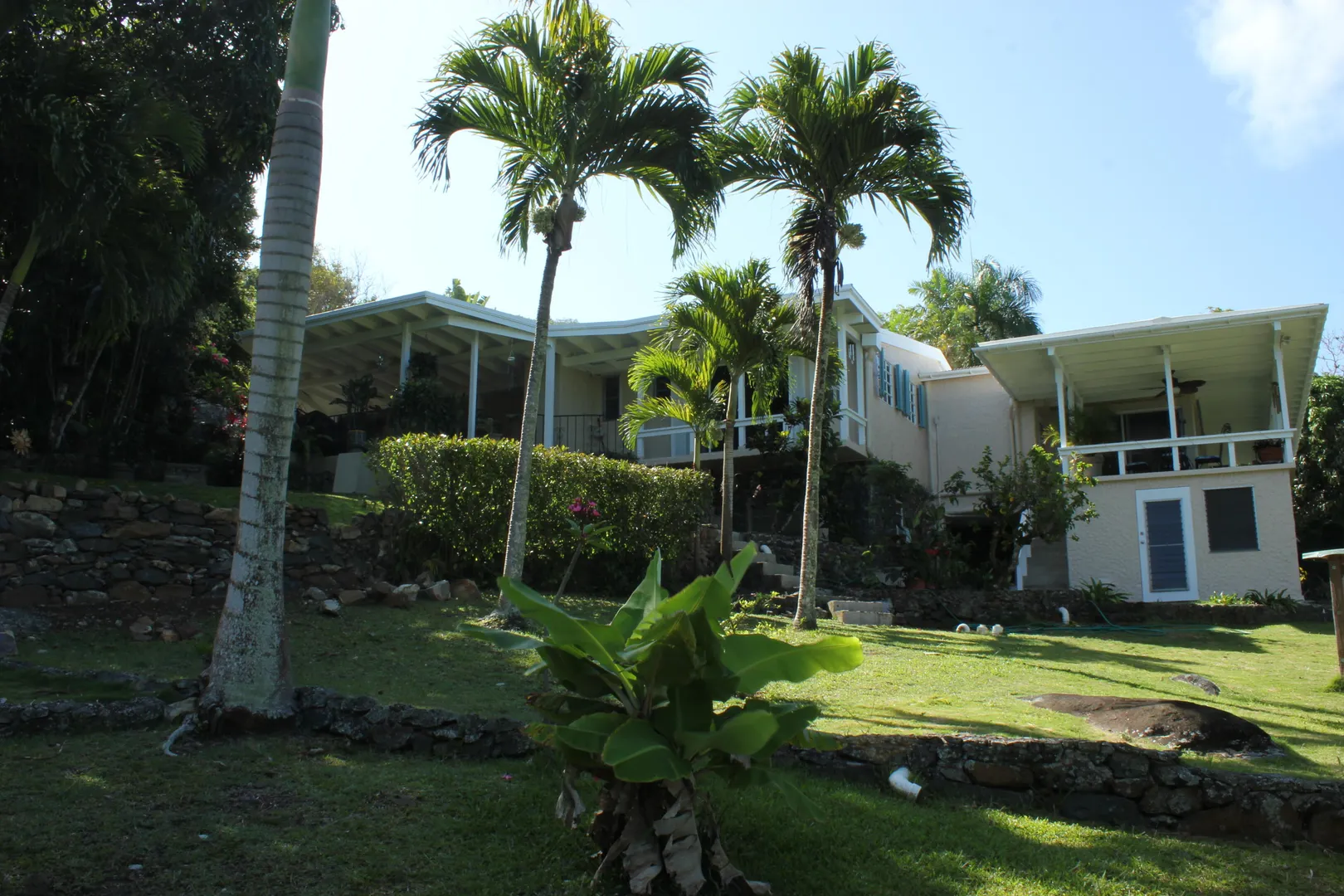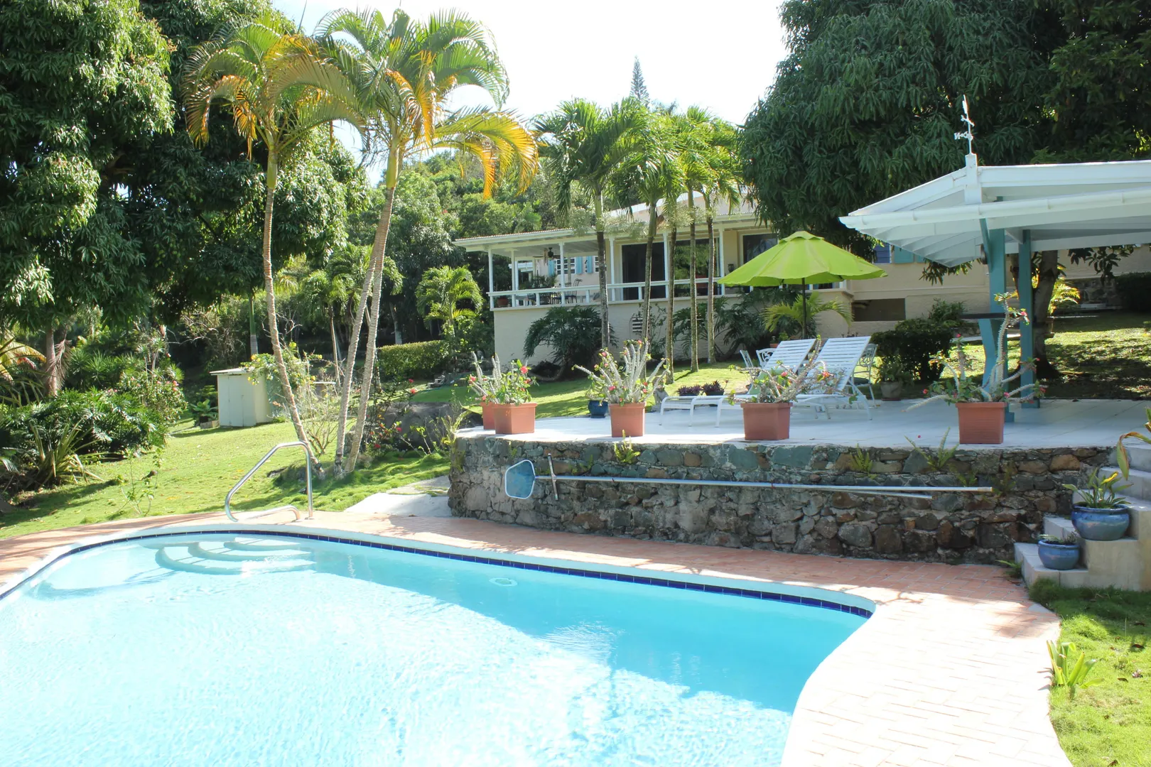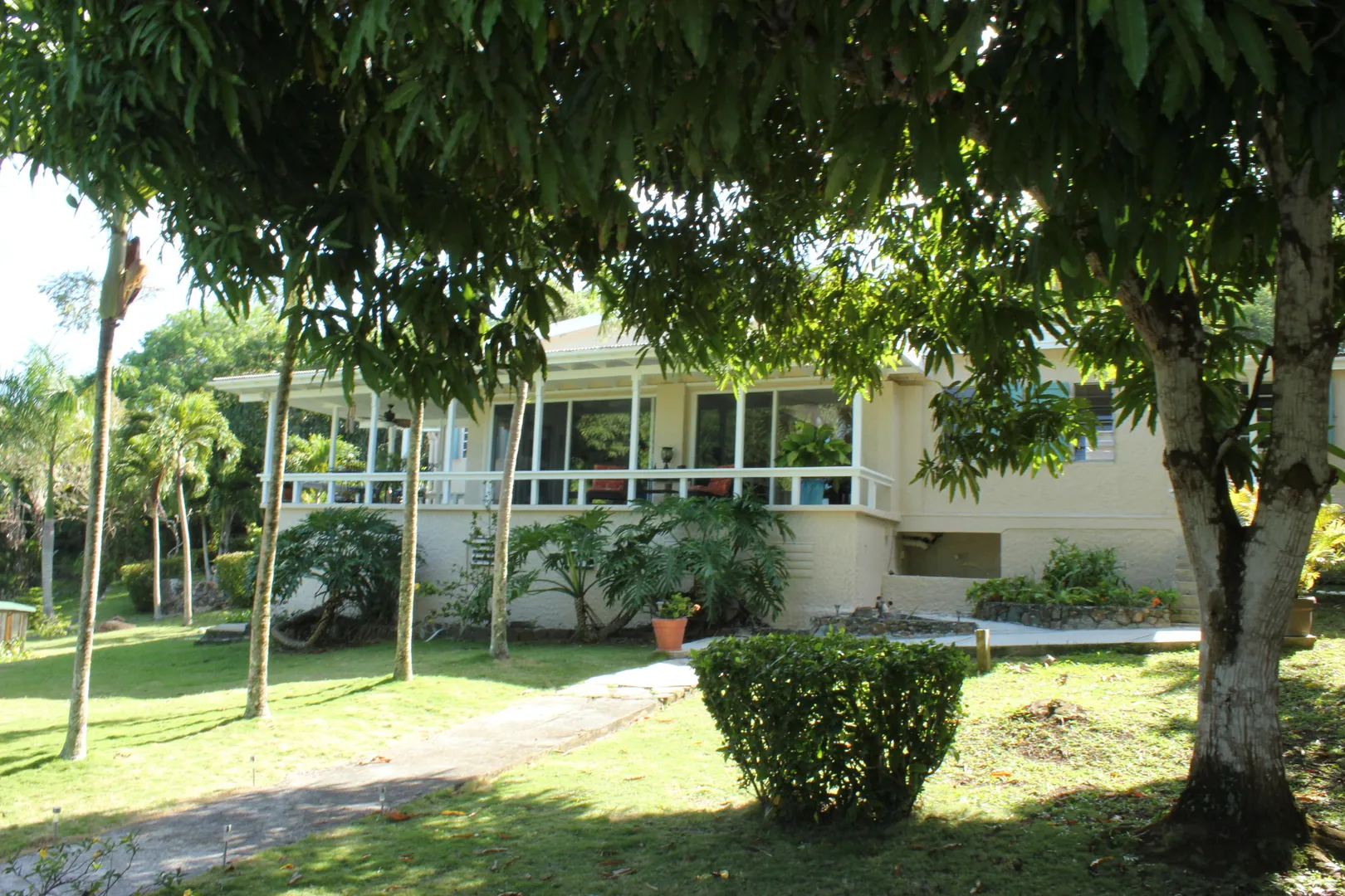 Lovingly and meticulously detailed, upgraded and renovated over the past year, this property is like no other on St. Thomas. Imagine over two acres of rolling lawns, massive Mahogany trees, fruit trees and flowering plants surrounding the masonry home with over 3,359 sf interior including 4 bedrooms, 5.5 baths, office, great room, den, living room, second outdoor kitchen and huge pool. Details include an electric gate at entrance, fully fenced, circular driveway, car port and 20kw generator w/ auto transfer switch, brand new custom glamorous kitchen with top of the line GE appliances in 'slate', upgraded baths, new split air conditioning, new flooring, upgraded electrical and painted inside and out. You will be charmed by the blue bit walls meandering throughout the property,and the trees were all trimmed to reveal amazing northwest water views that are stunning. Bring your pets, horses, kids and baskets to collect your mangoes, avocados, oranges and limes IMPROVEMENTS 10K Solar Array on roof with net metering New custom kitchen with solid wood cabinets by Patrick Corcoran cabinet maker Synthetic Quartz Counters Replaced every electrical switch and outlet in house Appliances are new GE Profile in new slate color; including double ovens with glass cooktop, dishwasher and two refrigerators with a third refrigerator and dishwasher and bar frig in summer kitchen on patio. LED lights on top of kitchen cabinets Pool refinished with Diamond Brite pool pump new UV- Dual water filters New flooring 3 new split a/c units a/c i every bedroom and office Entire house painted interior and exterior since 2015 New ceiling fans 4 stage RO water filtration in kitchen 20,000 gallon cistern under pool patio to service filling of pool Move in condition ALL furnishings and art work convey AT FULL LISTING PRICE See list of trees and plants under documents tab