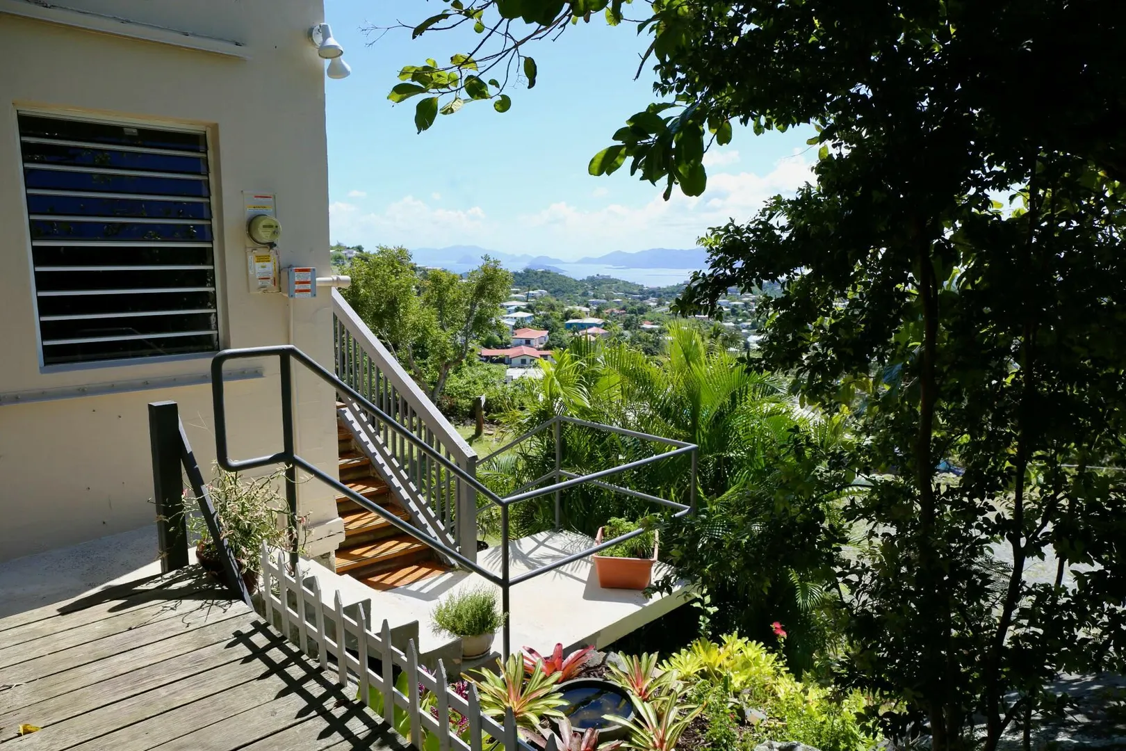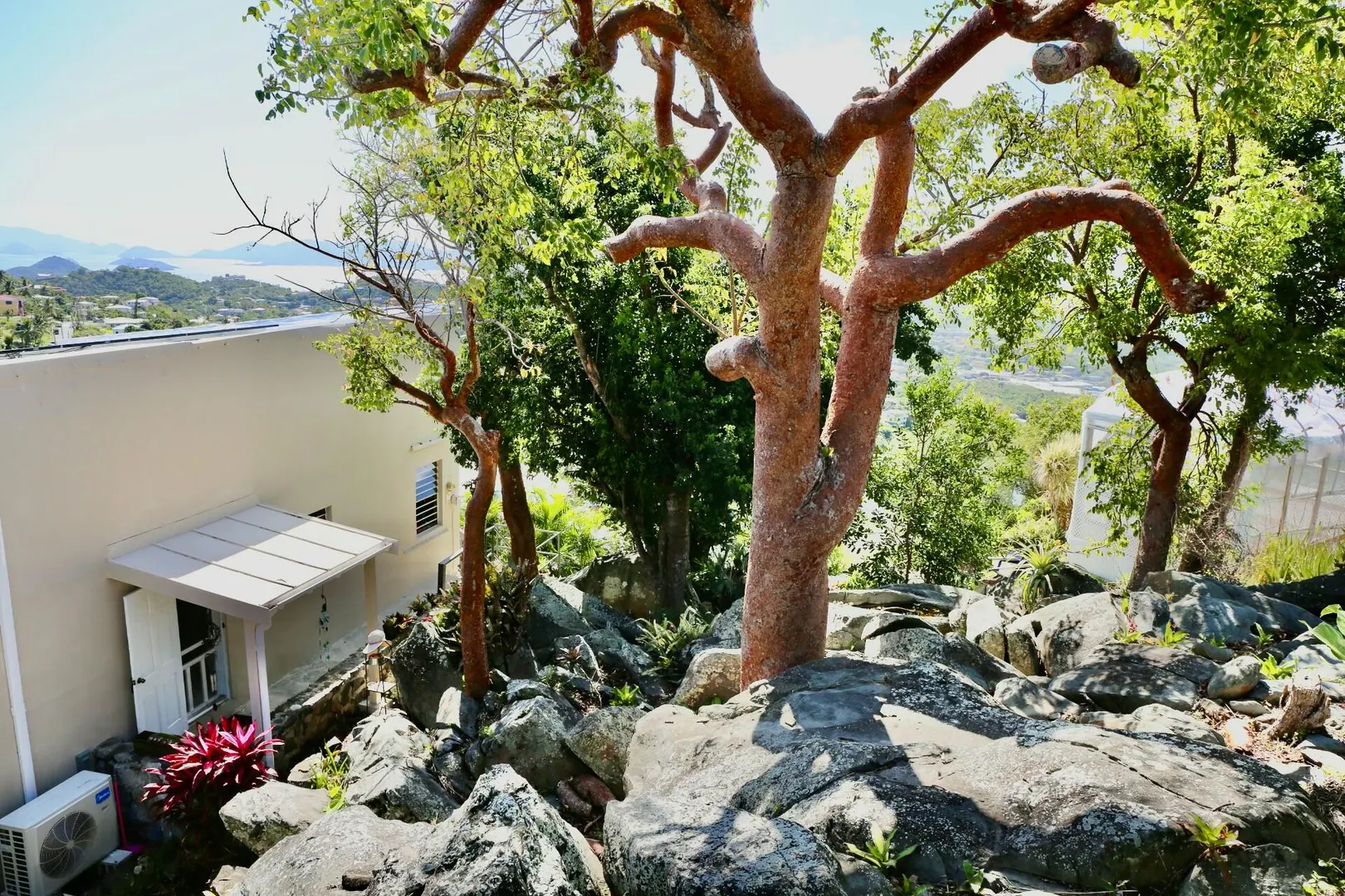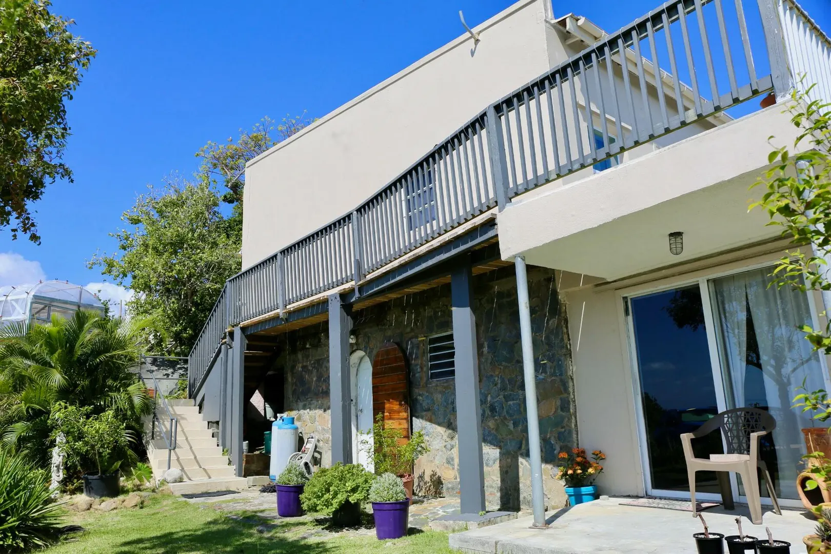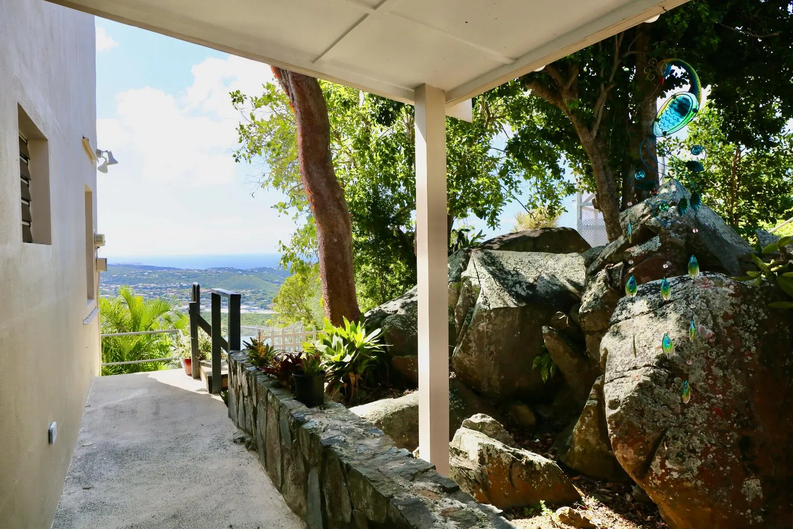 The views are endless. Hans Lollik to the left, BVI, St. John and you can see St. Croix on a clear day. A wrap around balcony for taking in the island chain. This terrific property has an open floor plan, 3 bedrooms, 2 baths in the main house, a 1 bed 1 bath apartment downstairs and separate laundry room/storage/work area with unfinished plumbed full bathroom. The large, flat parking area can accommodate plenty of vehicles . Solar panels with net metering keeps the Wapa bills low and there is battery back up. There are 2 attic spaces for extra storage. Gorgeous gardens set among the boulders make this property very unique. Lots of fruit trees throughout the property. The home offers easy, comfortable living with wonderful breezes.