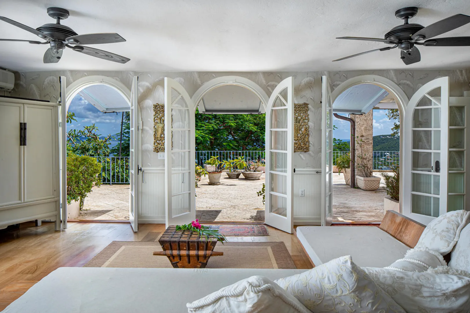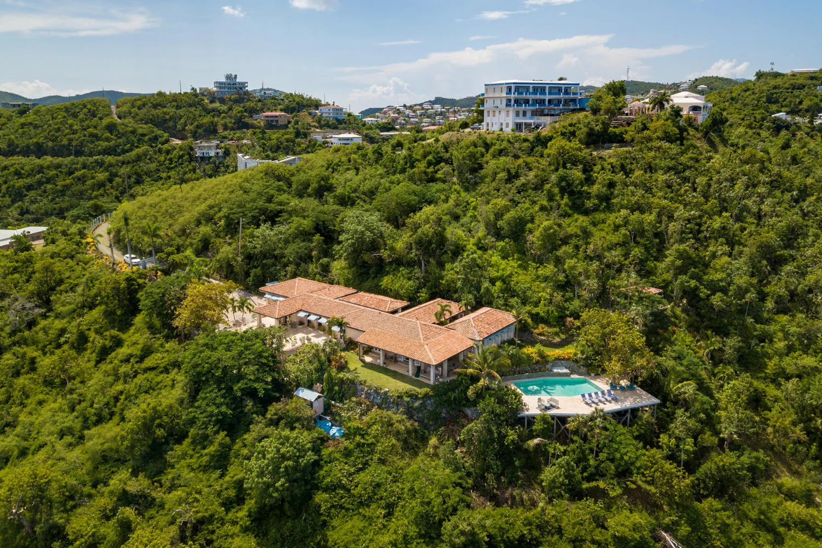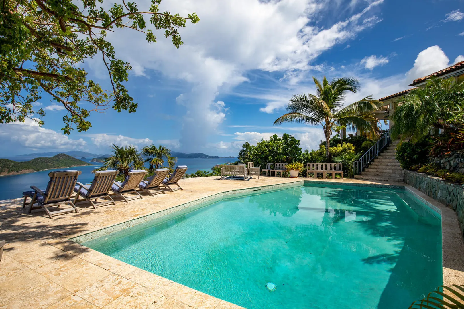 The PERFECT villa rental home - vacation here when you can - enjoy terrific rental income when you're gone. Stately and charming with celestial views and spacious indoor-outdoor flow - INDOCHINE, a 3-acre estate, is the ideal Caribbean get-away for weddings, family holidays, business retreats - or spoil yourself and make it your family home. Perched high overlooking the US & British Virgin Islands, Indochine features four en-suite bedrooms and a separate bedroom/living room suite below - all with stunning down-island views, as well as an expansive pool deck and meditation pavilion. A small studio provides a perfect dwelling for a caretaker, or use it as additional guest space. Minutes from world famous Magens Bay. Years of 6-figure rental history. Generator/AC/Gated