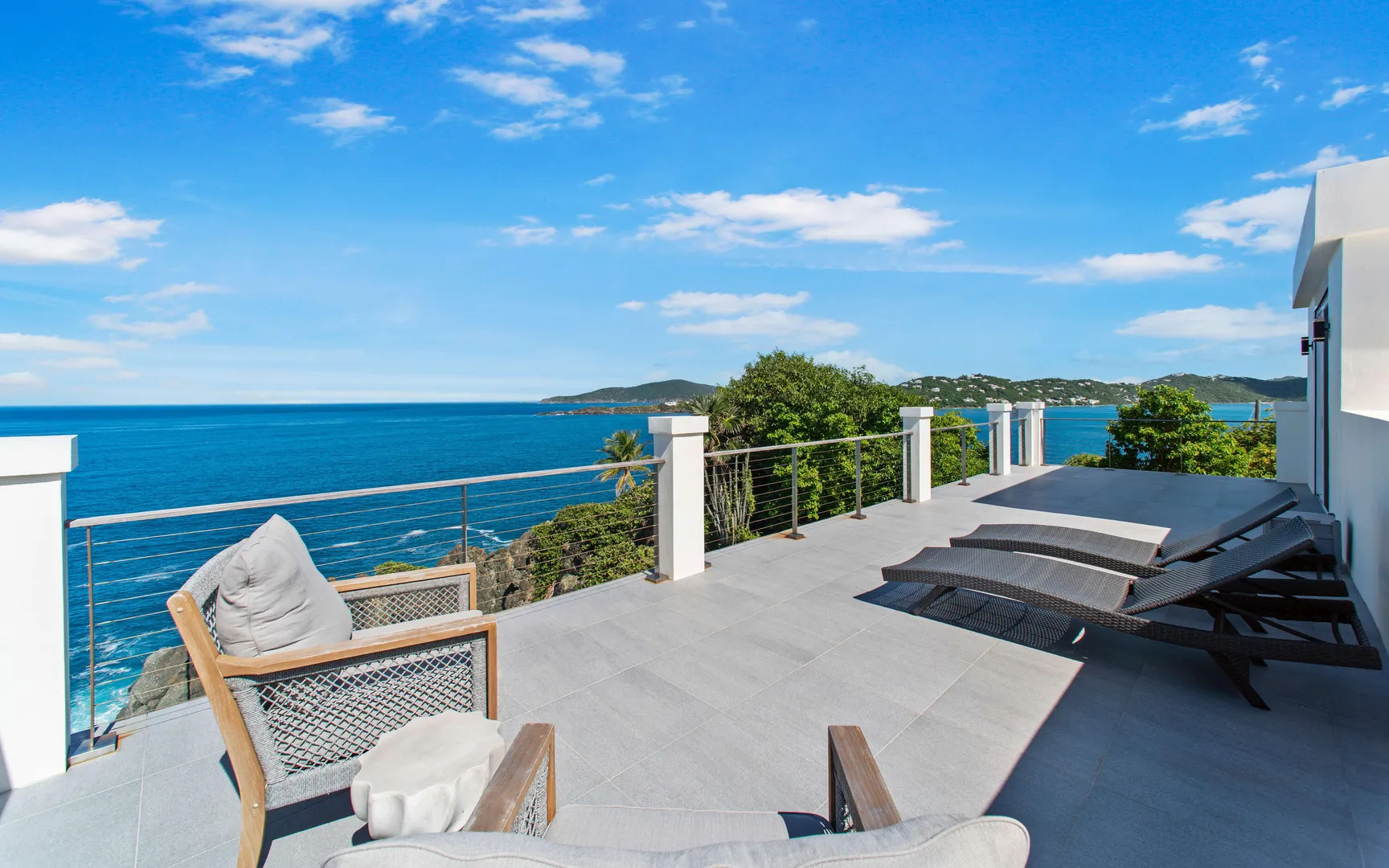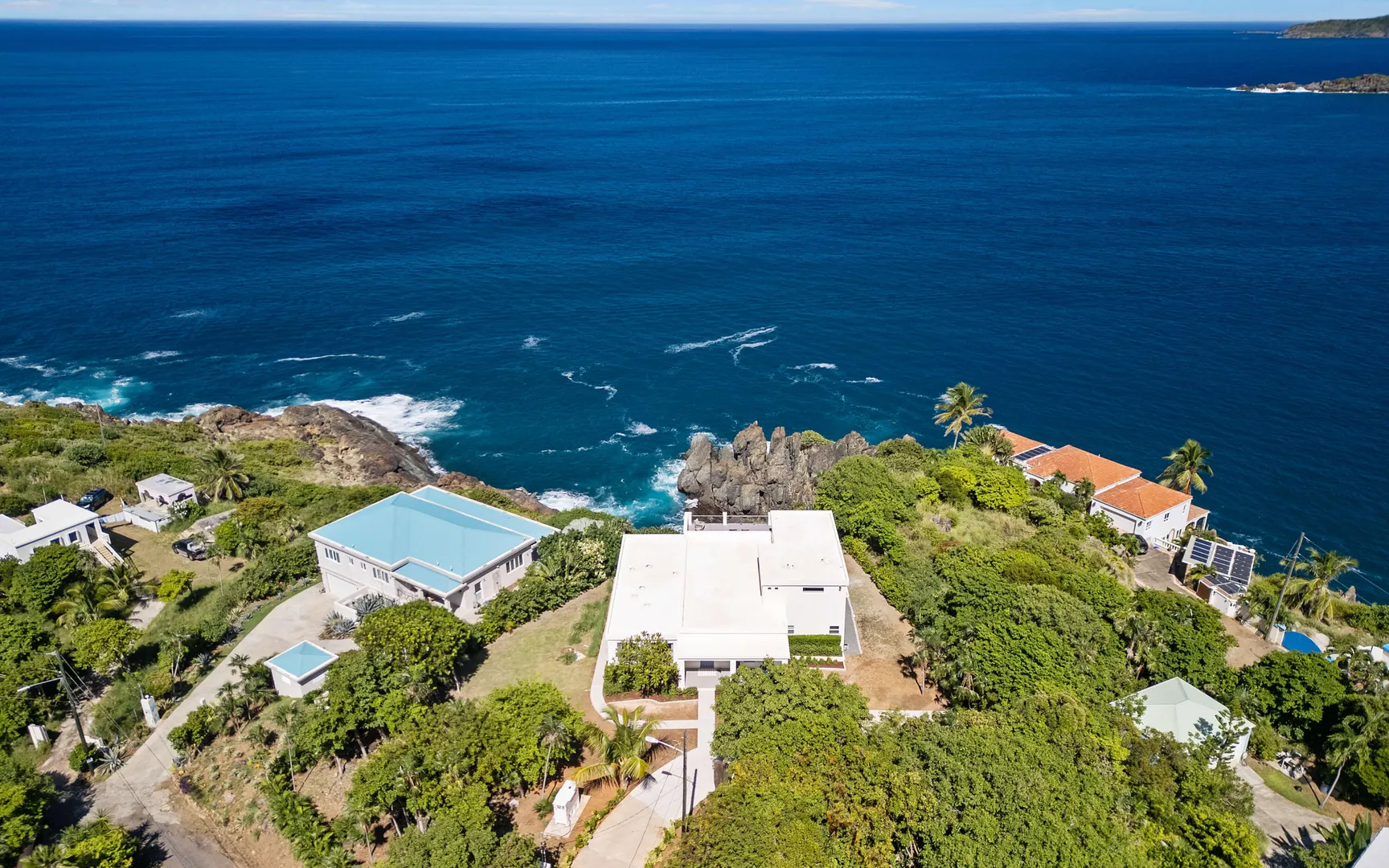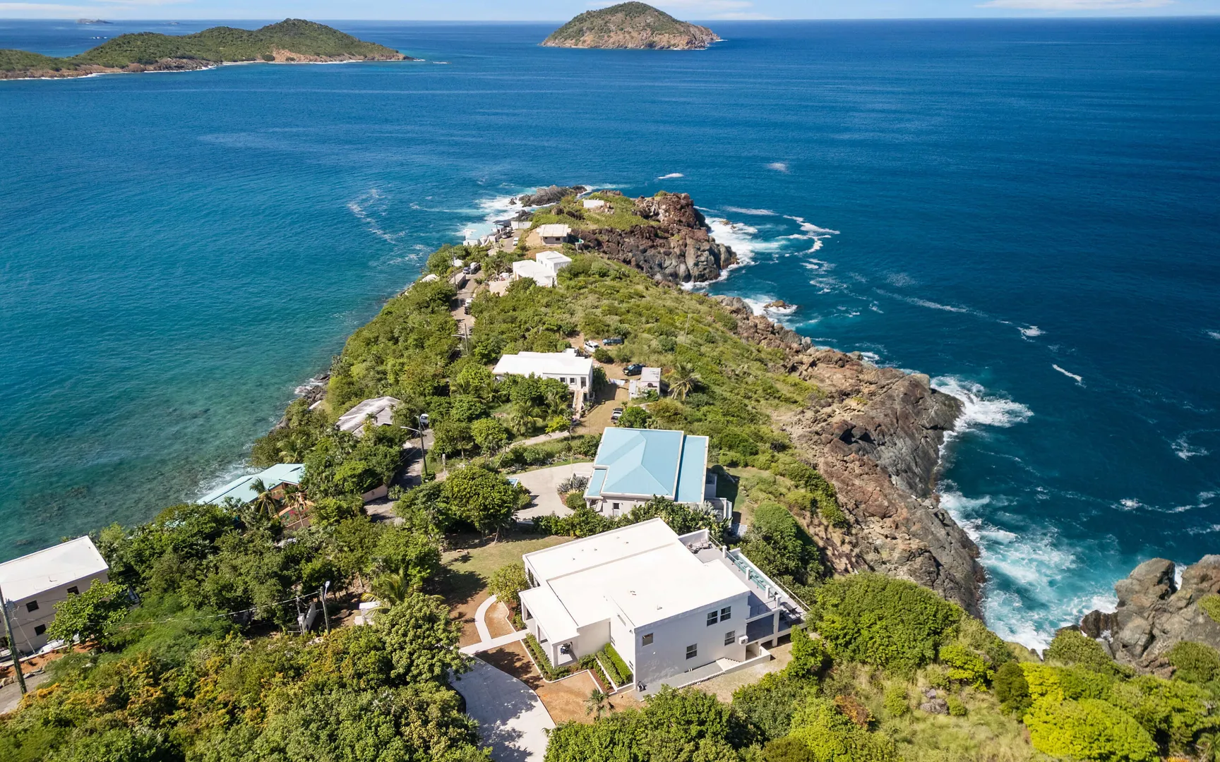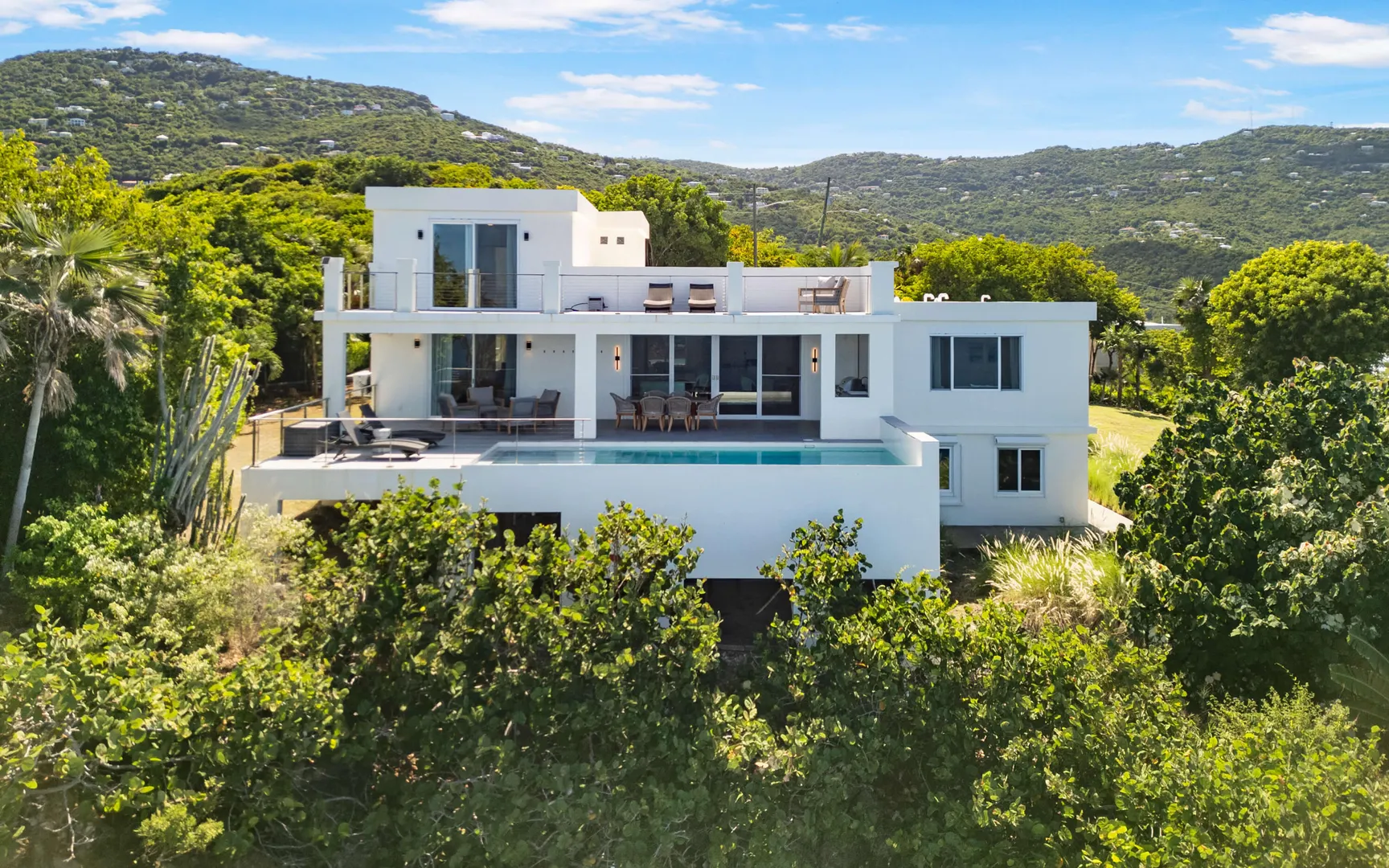 Stunning waterfront home on St. Thomas with panoramic ocean views and over 6,000 square feet of indoor-outdoor living. The main house offers 4 beds and 4.5 baths with more than 3,200 square feet inside. A separate 2-bed, 1-bath unit downstairs adds great flexibility for guests or long-term use. Built of all concrete with a concrete roof, full shutters, and a gated driveway, the home offers strength, privacy, and low-maintenance living. The great room and kitchen open to an unforgettable pool deck, with another private deck off the upper primary with exceptional views. Modern finishes, a backup generator, and the scale of new construction, without the long timelines or today's build costs, make this a standout waterfront property.