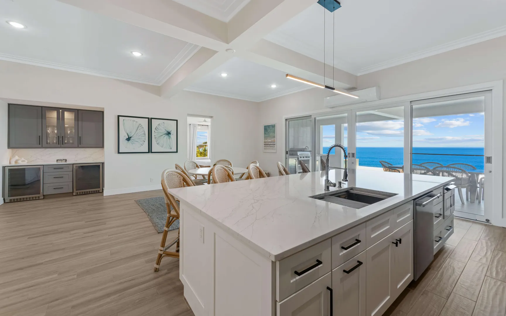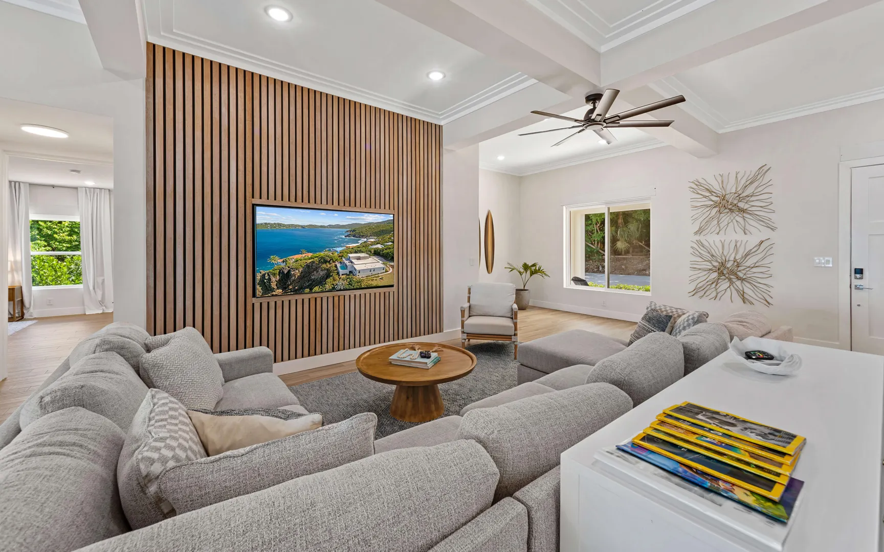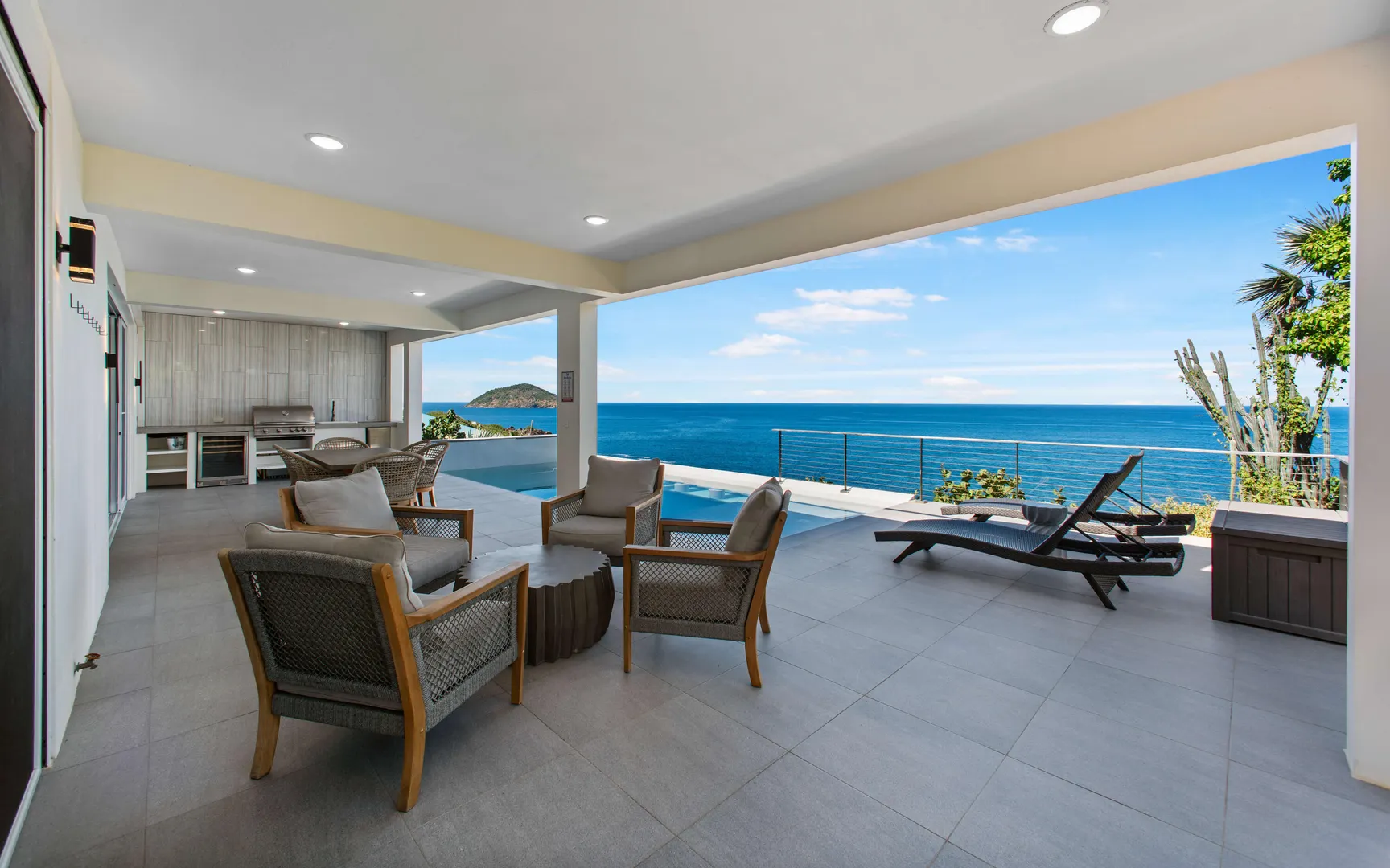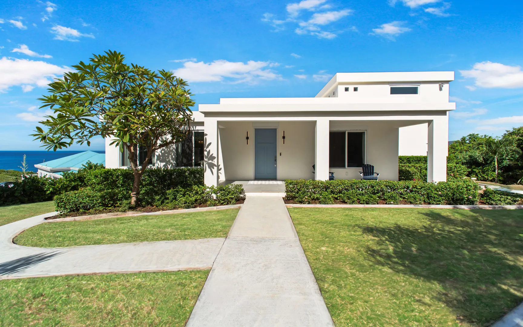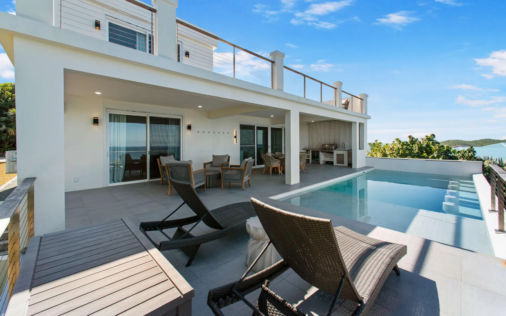 Stunning waterfront home on St. Thomas with panoramic ocean views and over 6,000 square feet of indoor-outdoor living. The main house offers 4 beds and 4.5 baths with more than 3,200 square feet inside. A separate 2-bed, 1-bath unit downstairs adds great flexibility for guests or long-term use. Built of all concrete with a concrete roof, full shutters, and a gated driveway, the home offers strength, privacy, and low-maintenance living. The great room and kitchen open to an unforgettable pool deck, with another private deck off the upper primary with exceptional views. Modern finishes, a backup generator, and the scale of new construction, without the long timelines or today's build costs, make this a standout waterfront property.