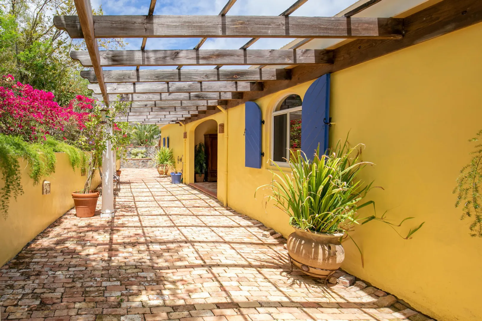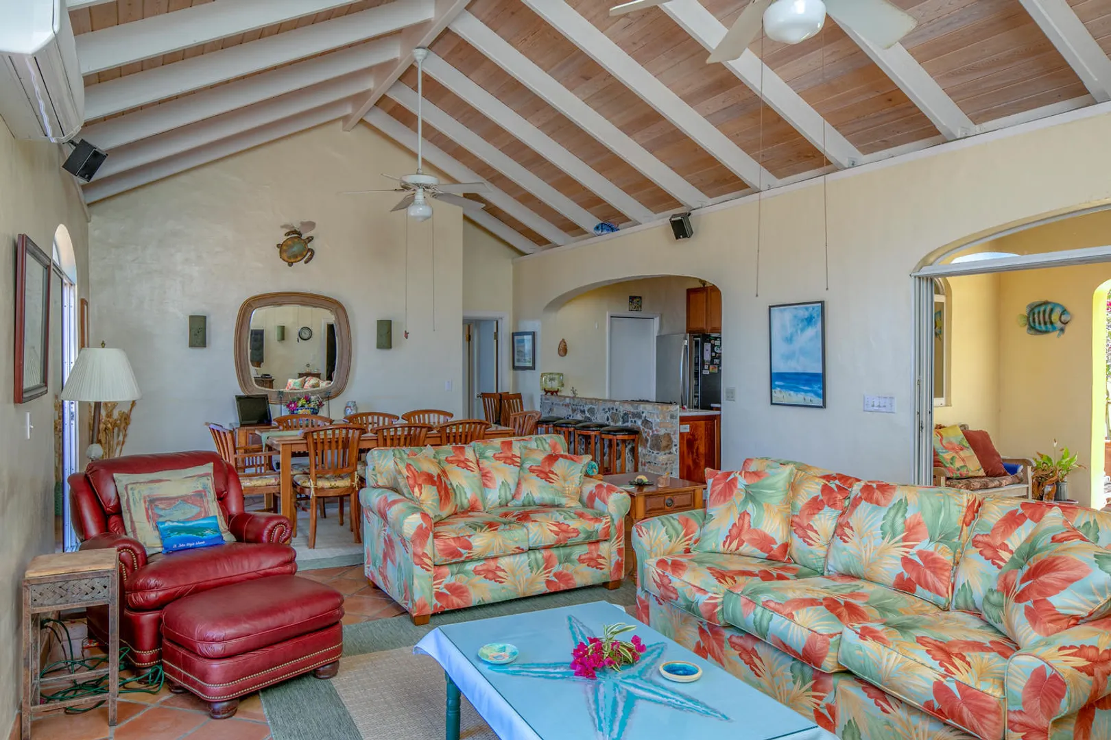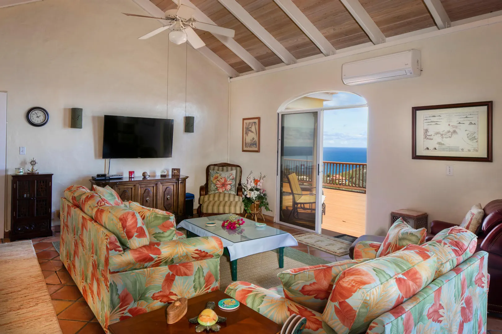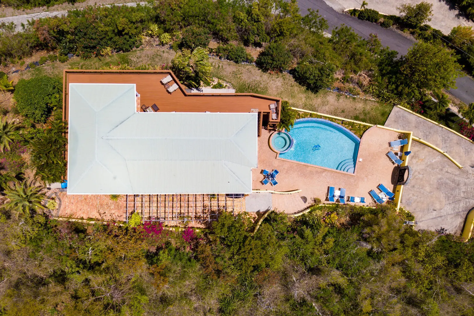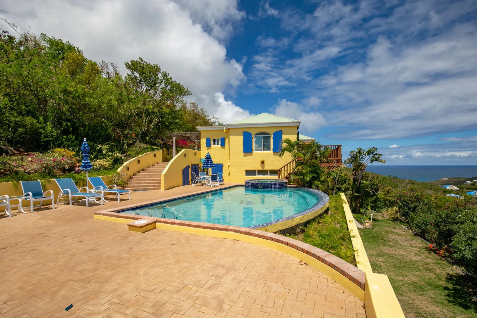 La Papaya is perched on a knoll in Chocolate Hole North to take advantage of expansive views from Ditleff Point to St. Thomas. Between the upper and lower level of the villa is the large brick paved pool patio with lovely curved edge pool and elevated jacuzzi with waterfall. Upstairs is a great room with kitchen, dining and living areas flanked by a large master suite at the east and guest bedroom with jetted tub at the west. Downstairs is a third guest suite as well as a small apartment with 2 small bedrooms. Each area opens onto covered and open porches and decks. Professionally landscaped with flowering plants and trees, a grassy lawn and fruit trees.