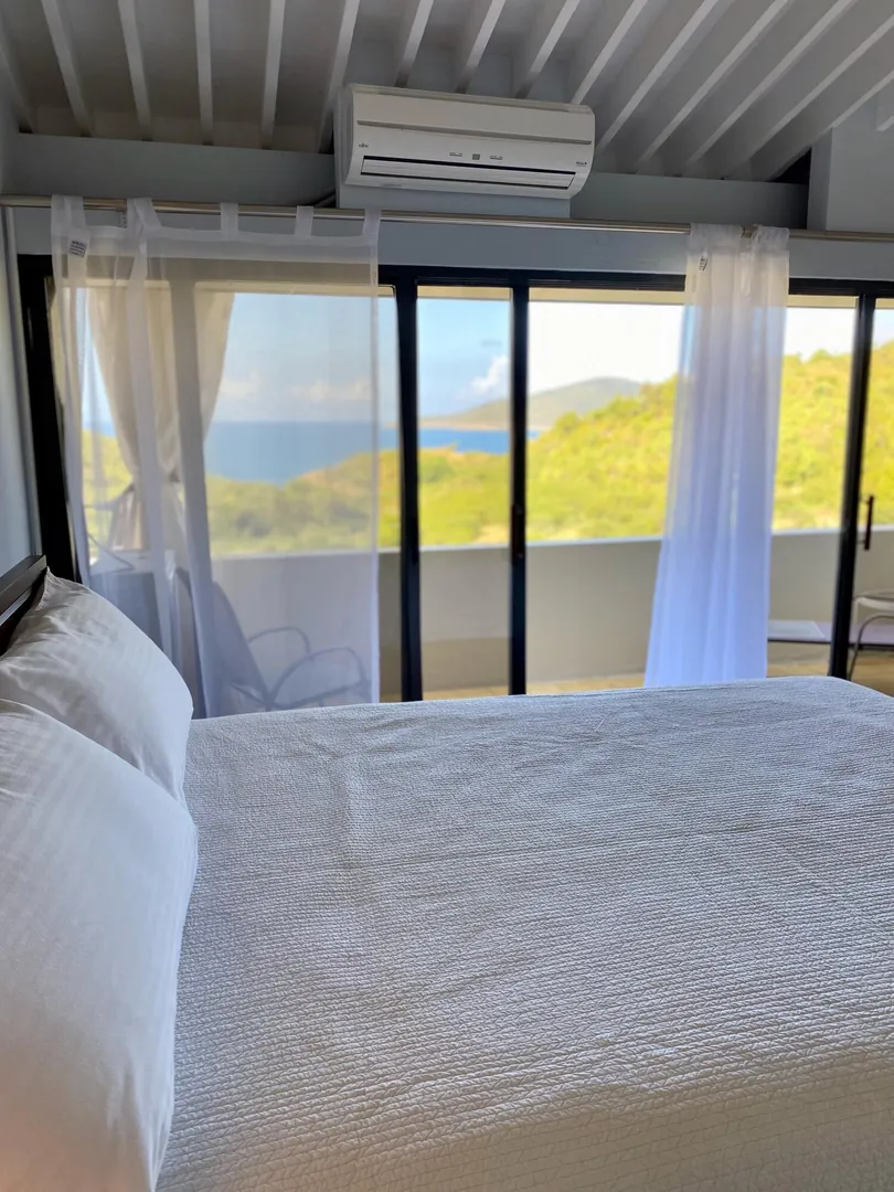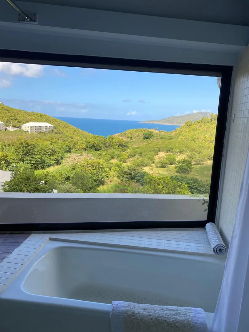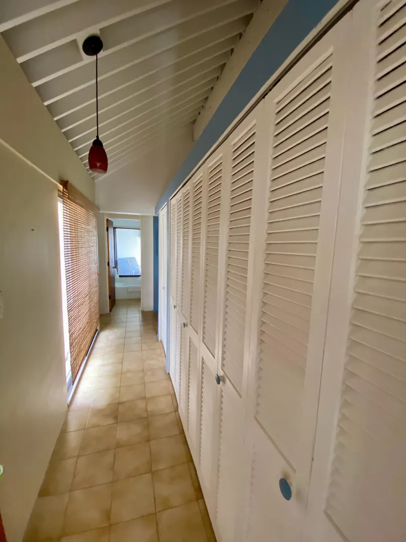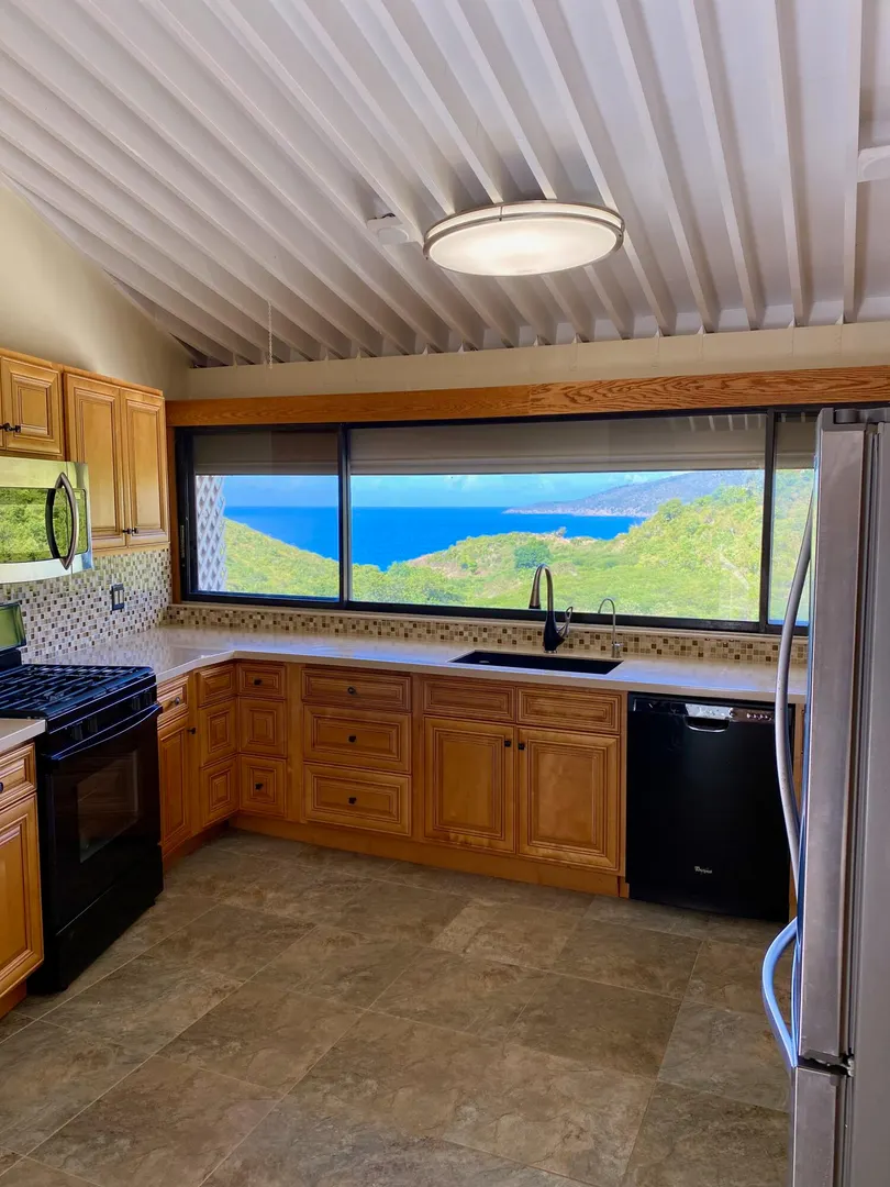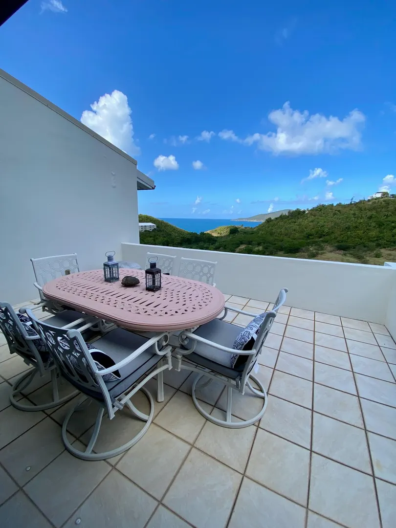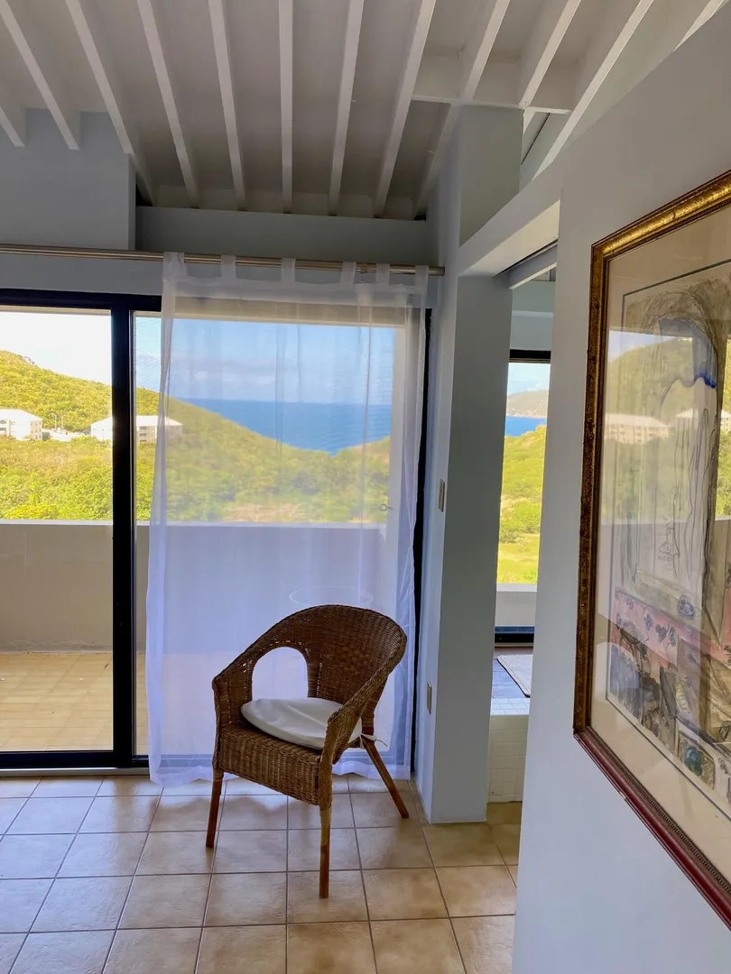Preferred location near end of quiet cul de sac, sets this renovated upper unit apart. In the Tennis Village, this unit is one of the closest to Magens Bay. This sought after splayed unit features larger, more open kitchen, with Corian countertops and custom cabinetry. Large patio with windward side location, enjoys best breezes, as well as verdant valley views, with the ocean and out islands prominently in view. Quiet, no traffic location. Second bedroom set up to use separate back patio entrance, and mini kitchen facilities. Split AC;s custom Armor Fabric storm system are nice up grades. covered parking for one car. Vacant, easy to show,