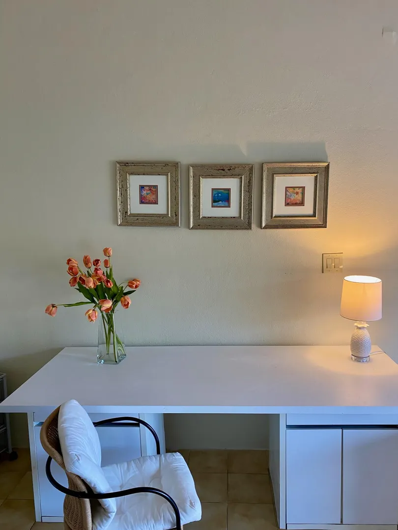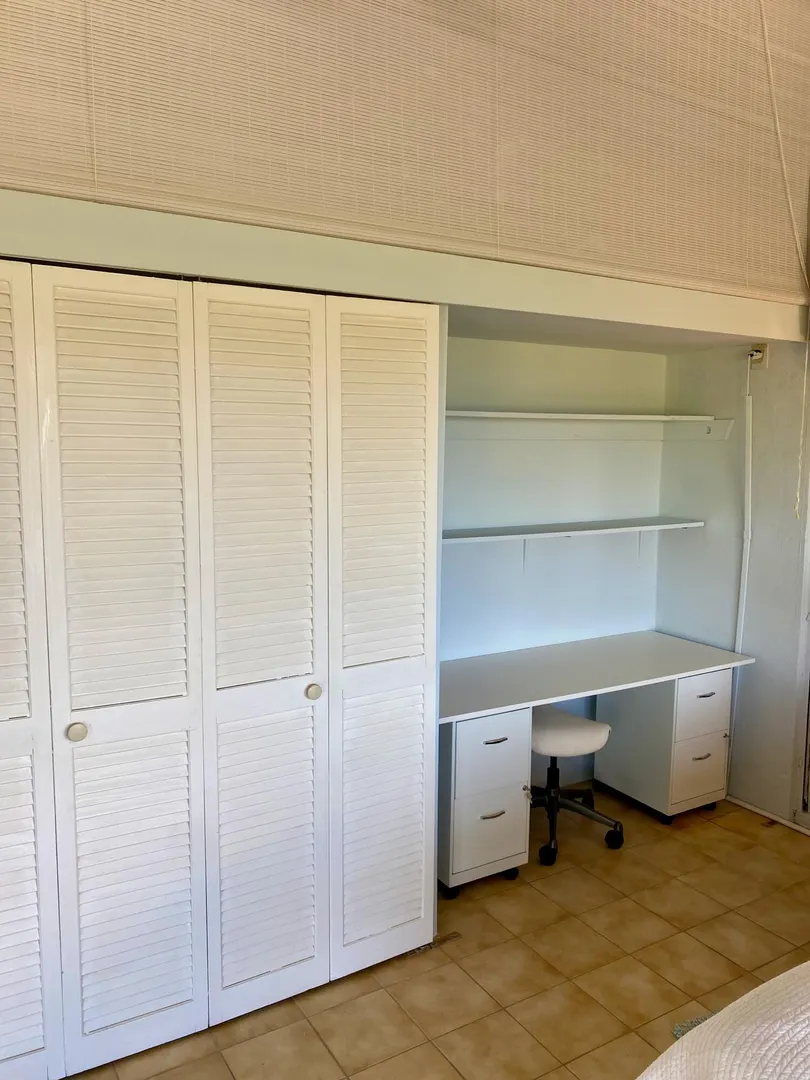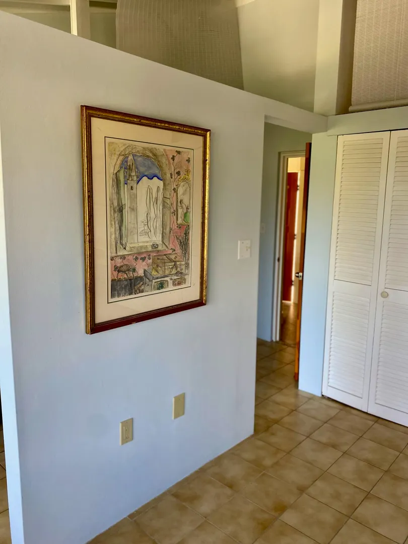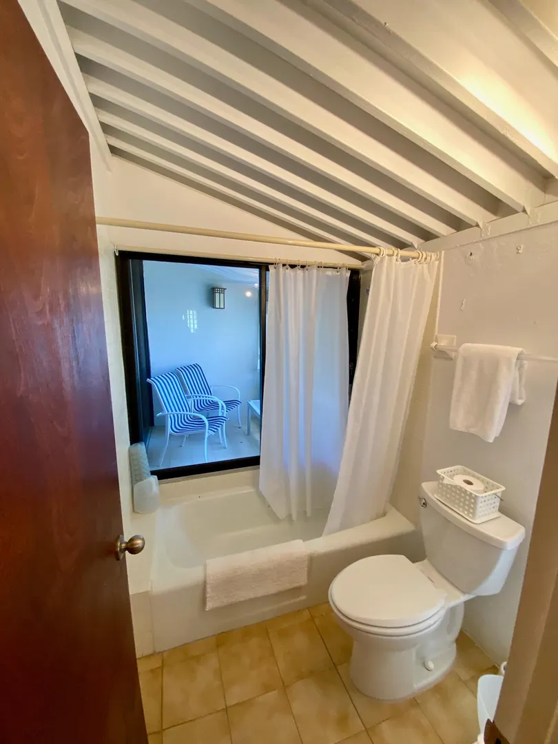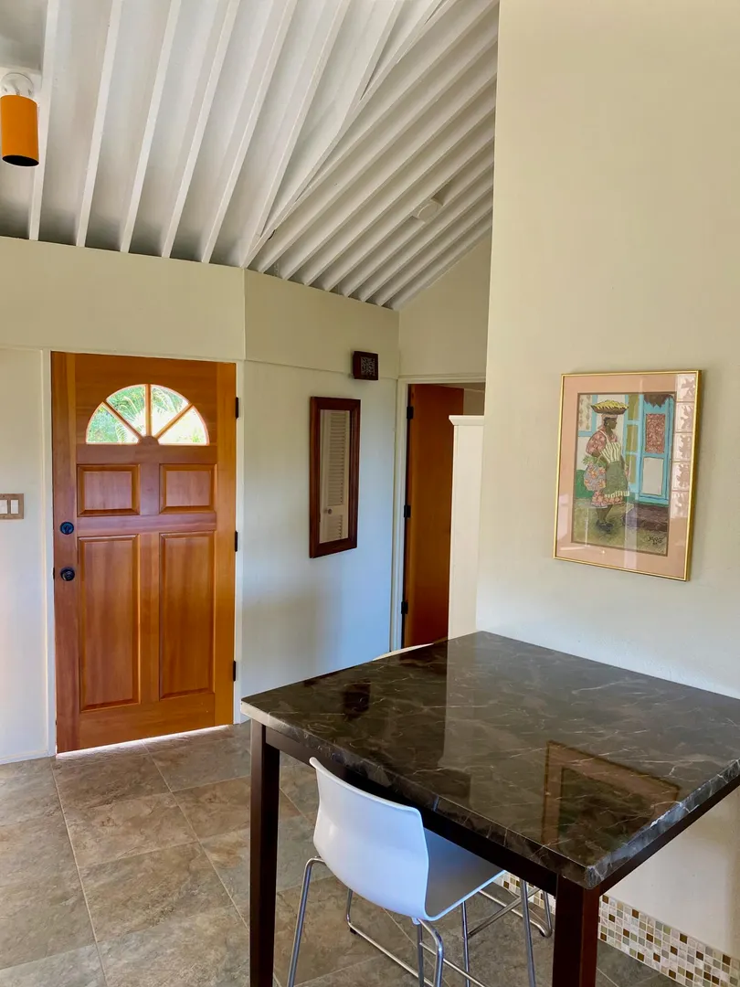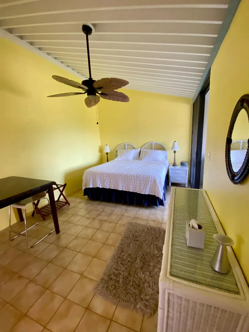 Preferred location near end of quiet cul de sac, sets this renovated upper unit apart. In the Tennis Village, this unit is one of the closest to Magens Bay. This sought after splayed unit features larger, more open kitchen, with Corian countertops and custom cabinetry. Large patio with windward side location, enjoys best breezes, as well as verdant valley views, with the ocean and out islands prominently in view. Quiet, no traffic location. Second bedroom set up to use separate back patio entrance, and mini kitchen facilities. Split AC;s custom Armor Fabric storm system are nice up grades. covered parking for one car. Vacant, easy to show,