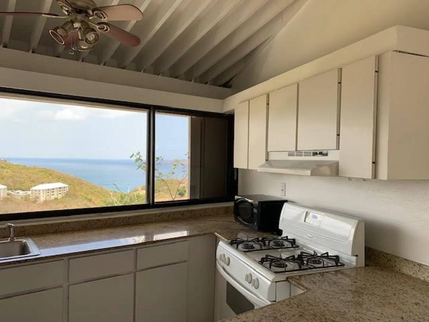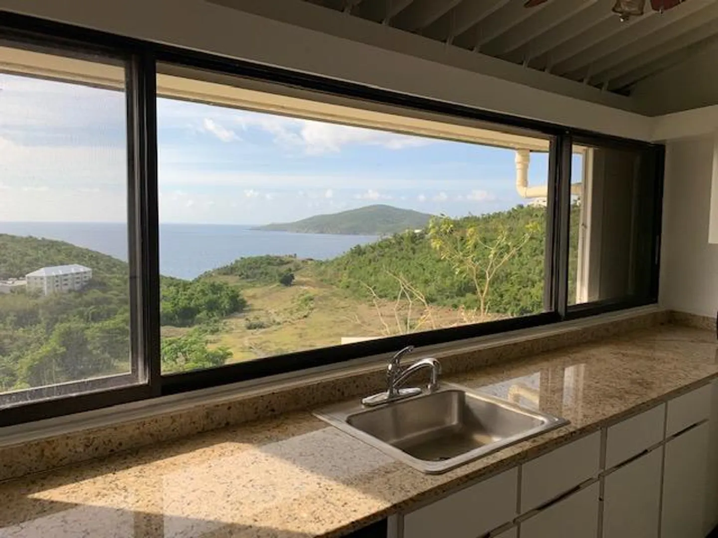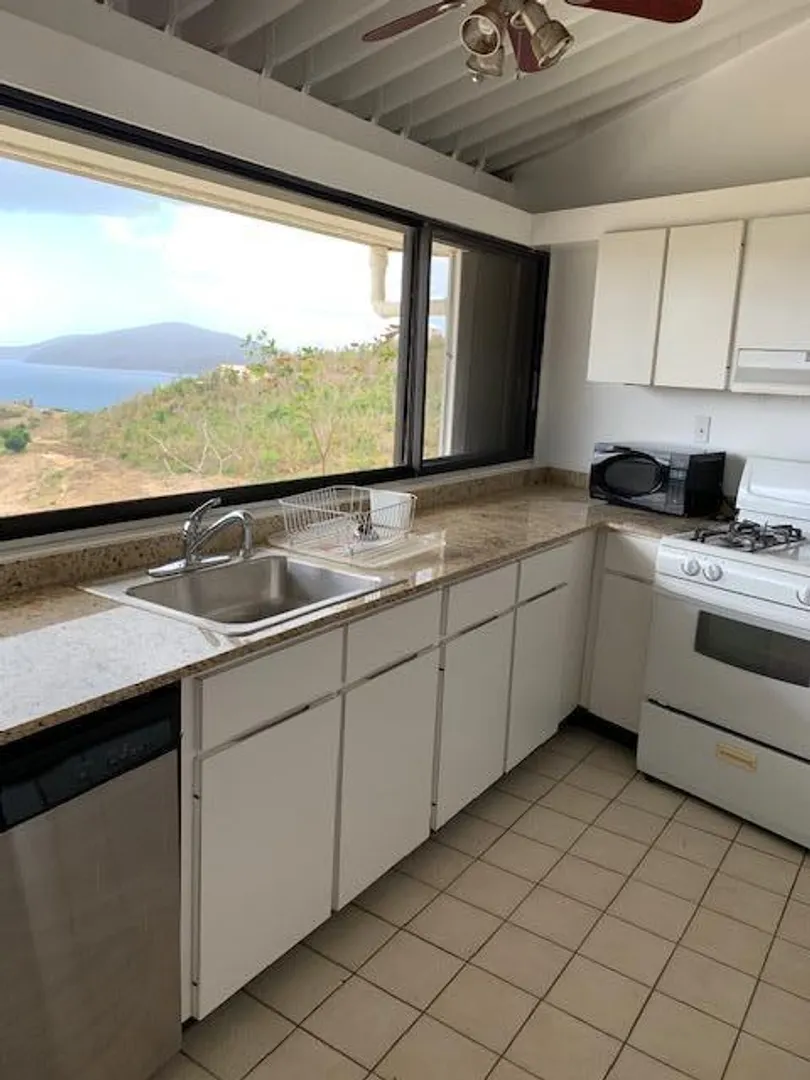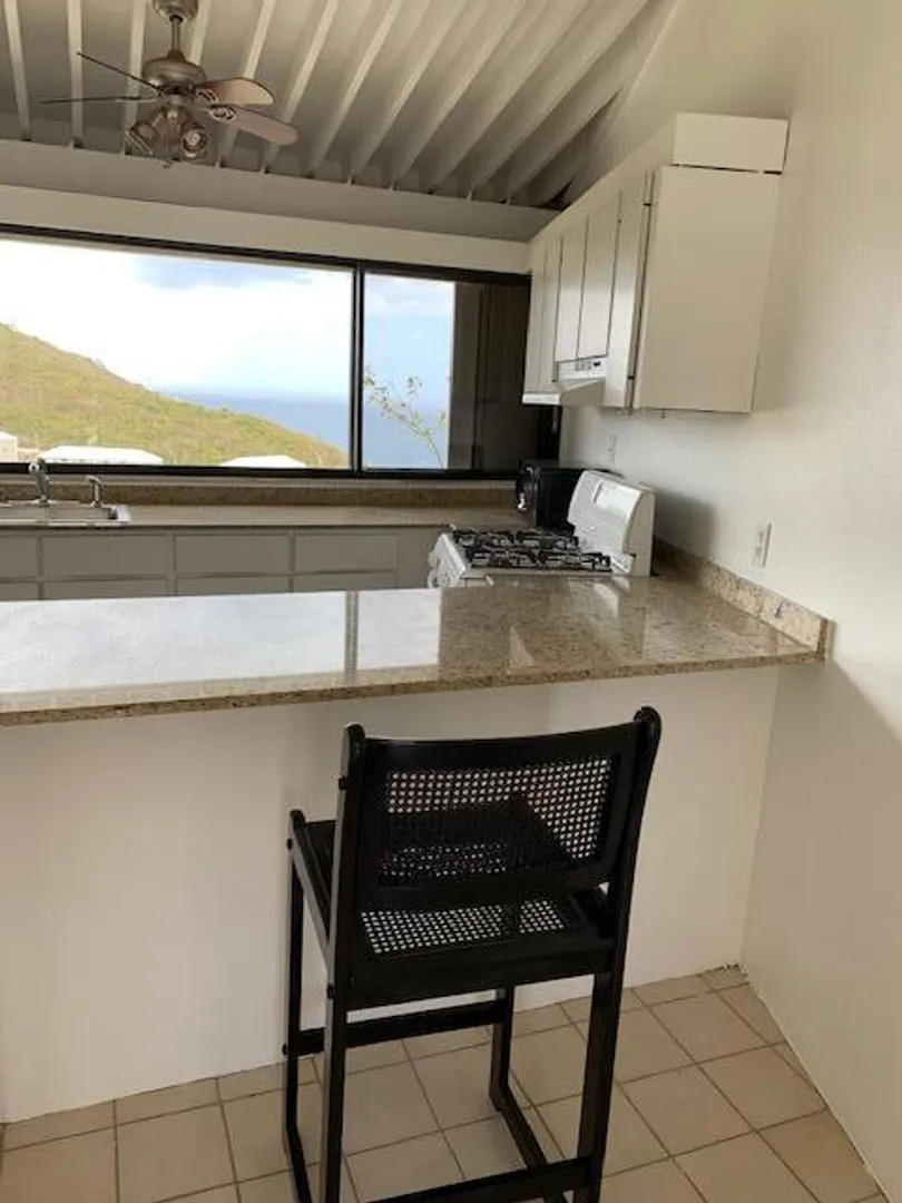 Top floor 2 bedroom, 2 bath end unit offers views from the living room, kitchen, bathroom and master bedroom. In Mahogany Run, one of the island's premier residential communities End unit on a quiet cul de sac. Property has a 24/7 guard gate, 2 pools and is in a central location with easy access to town, the airport and the east end. Also only five minutes from beautiful Magens Beach. Kitchen with a view, granite counter-tops, new stainless refrigerator and dishwasher. Spacious rooms, vaulted ceilings, A/C, UV water filter, lots of storage space. Newly painted and unfurnished this is a blank canvas waiting for a new owner to add their own finishing touches.One of the island's finest restaurants, Old Stone Farmhouse is located on property