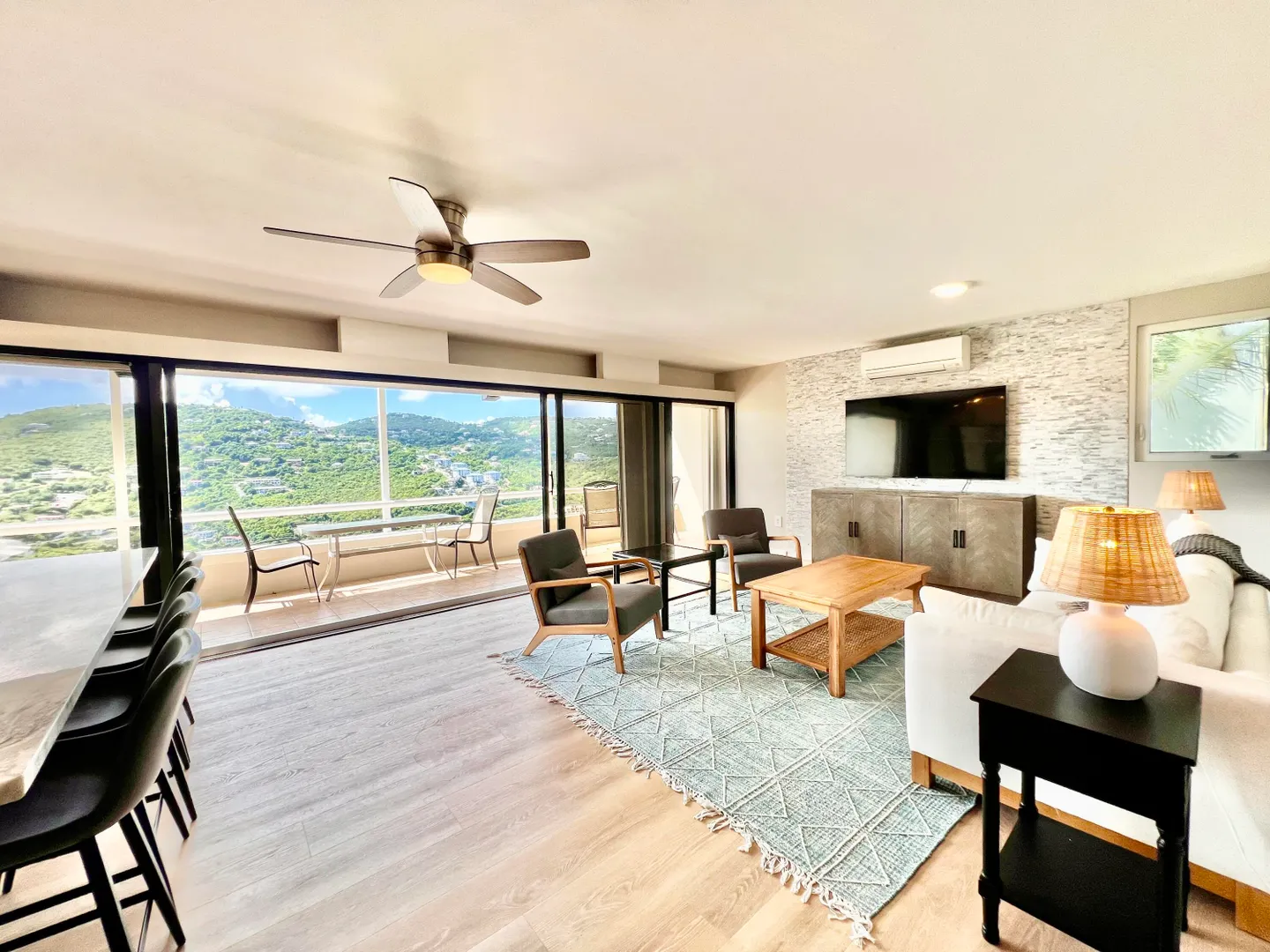 This recently renovated split level unit features two bedrooms and two bathrooms showcasing a contemporary and elegant design. The residence radiates both luxury and comfort, located just minutes from the renowned Magen's Bay Beach. Unwind and take in the sunset while enjoying the shimmering lights on the hillside. The homeowners' association fees encompass various amenities, including pest control, trash removal, UV ray filtered water, 24-hour security with a guard and gate, as well as insurance for windstorms, floods and fires. Service dogs are permitted with board approval.