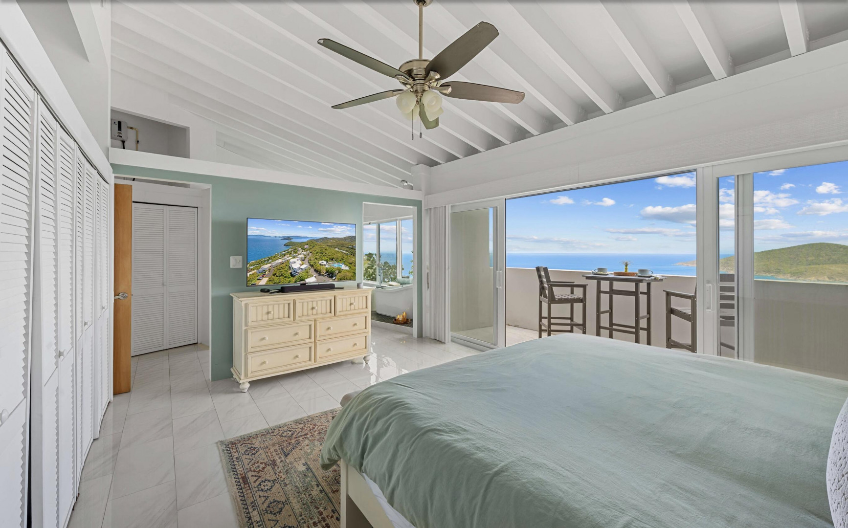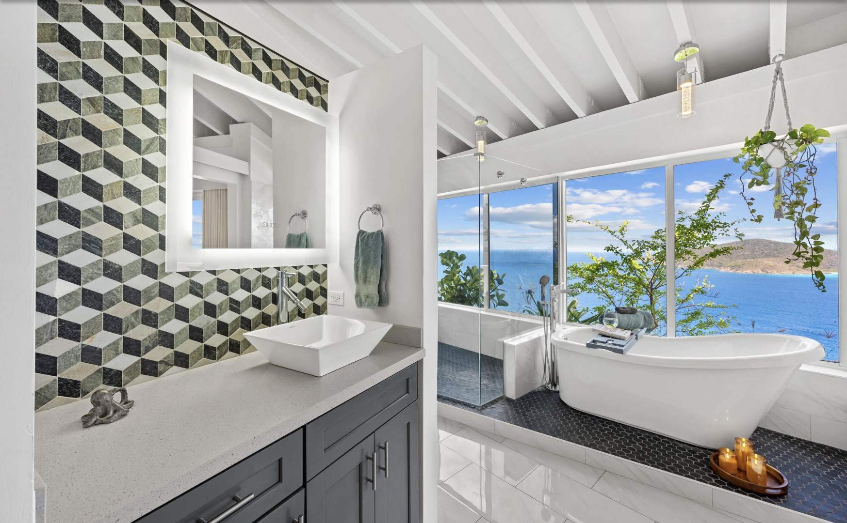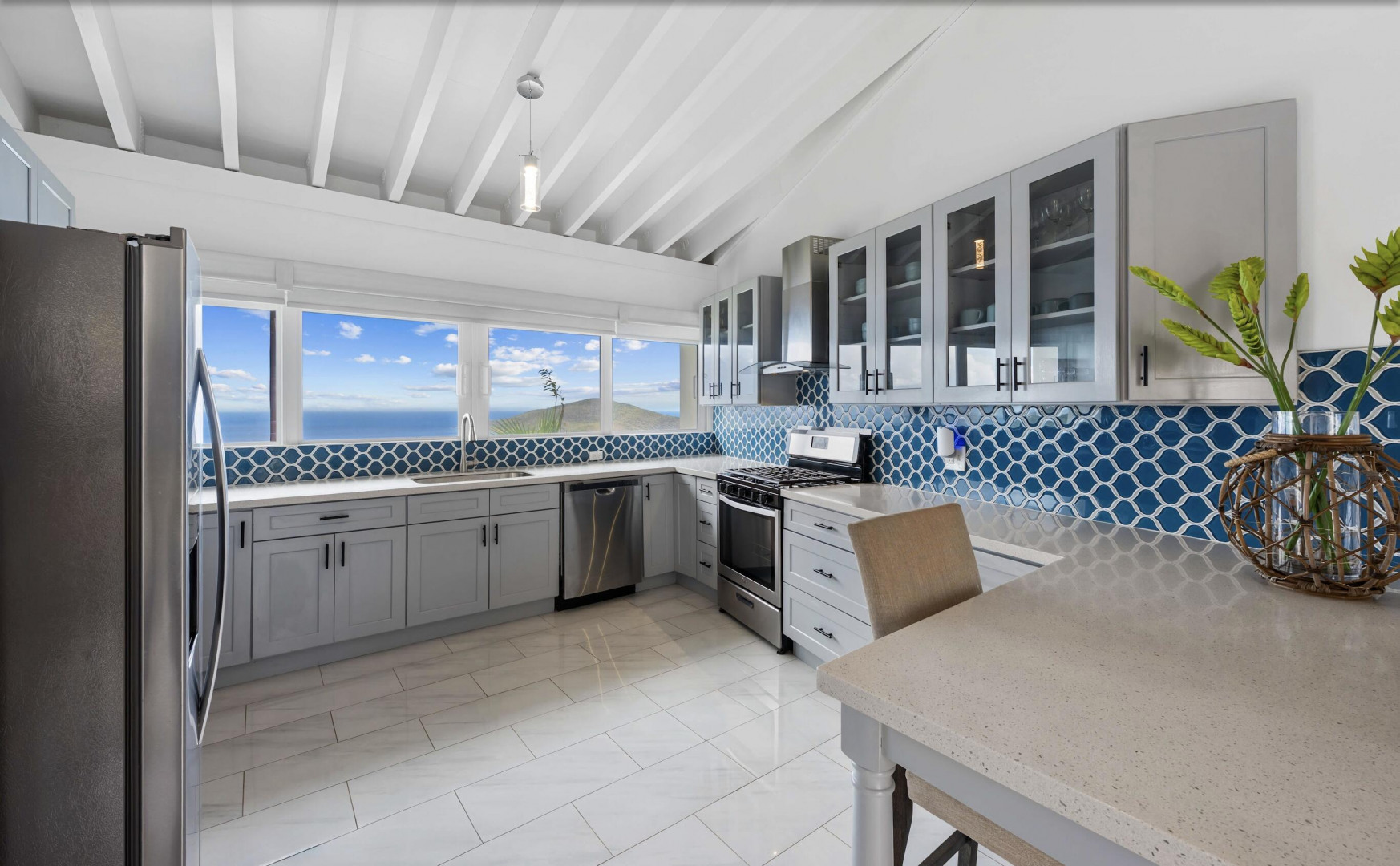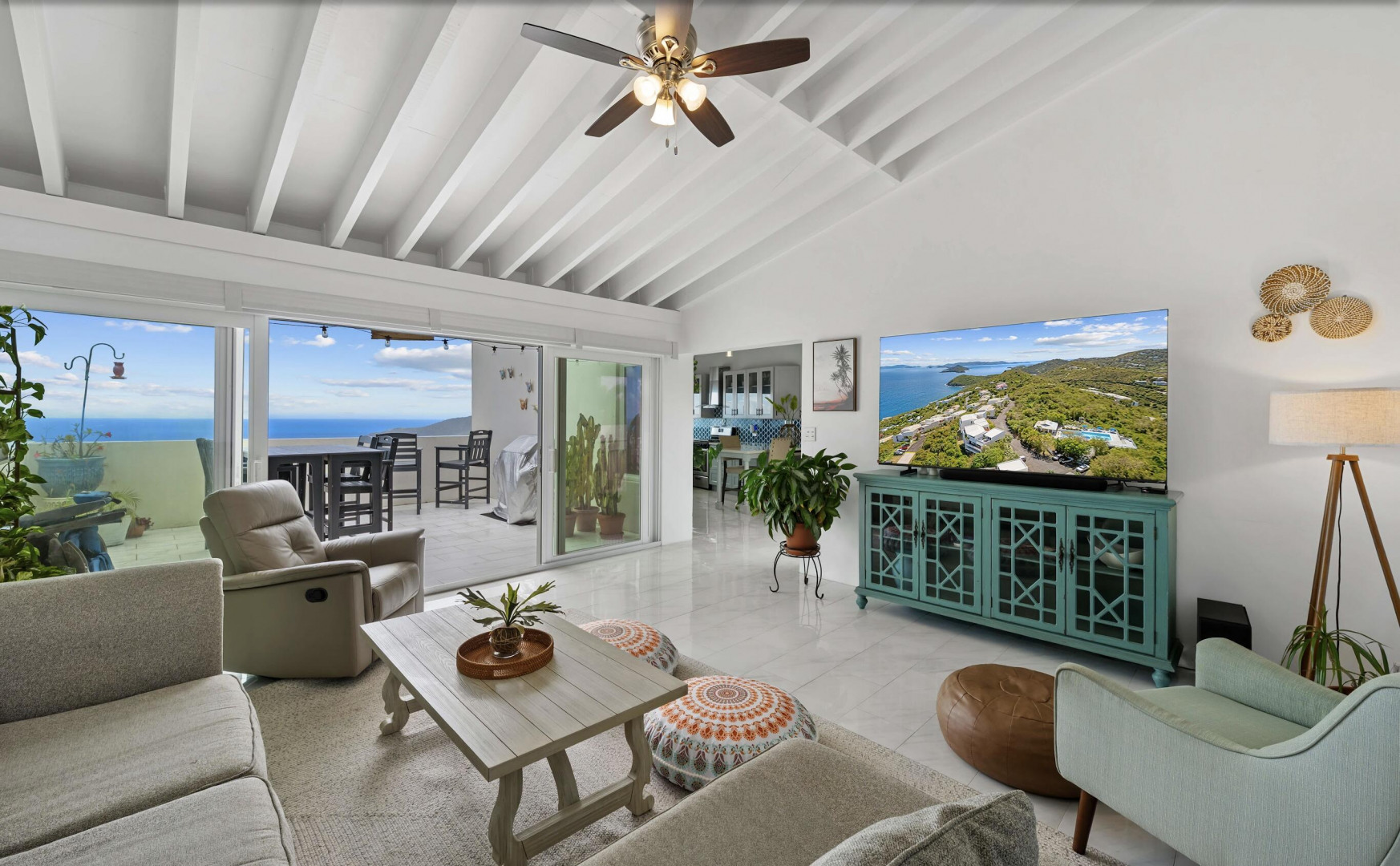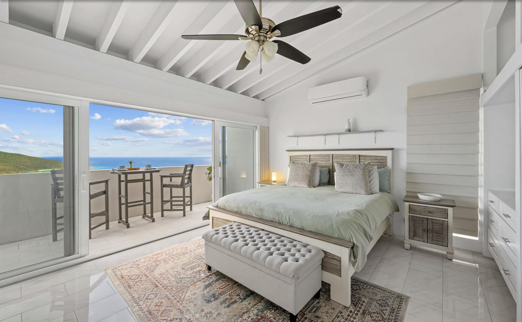 Welcome to one of the most thoughtfully reimagined residences at Mahogany Run, a fully renovated 2 Bed - 2 Bath condominium where Caribbean luxury meets effortless island living. Soaring beamed ceilings, gleaming polished tile floors, and an open, light drenched layout signal that this is no ordinary condo. The split wing floor plan gives each bedroom suite its own private sanctuary. The primary suite is serene, spacious, and styled with elegance, opening onto a private balcony overlooking the Atlantic. The second suite is equally impressive, tucked into its own private wing with a private entrance. The expansive roof top patio is arguably the finest vantage point in all of Mahogany Run. This home delivers an unmatched combination of style, privacy, and breathtaking natural beauty.