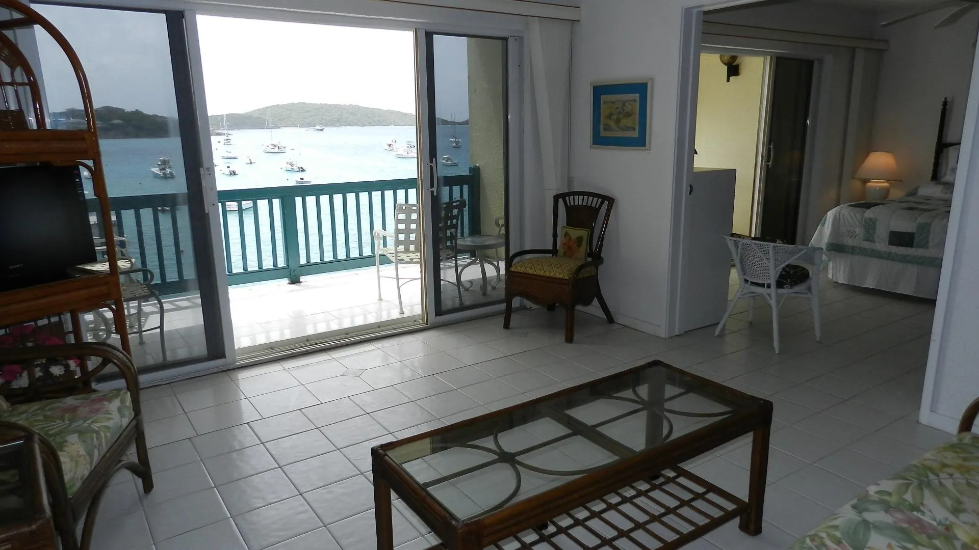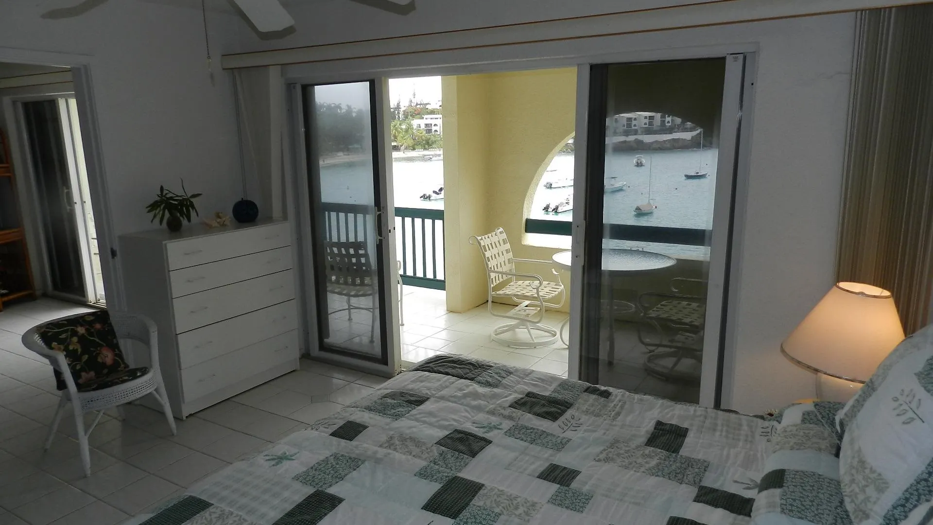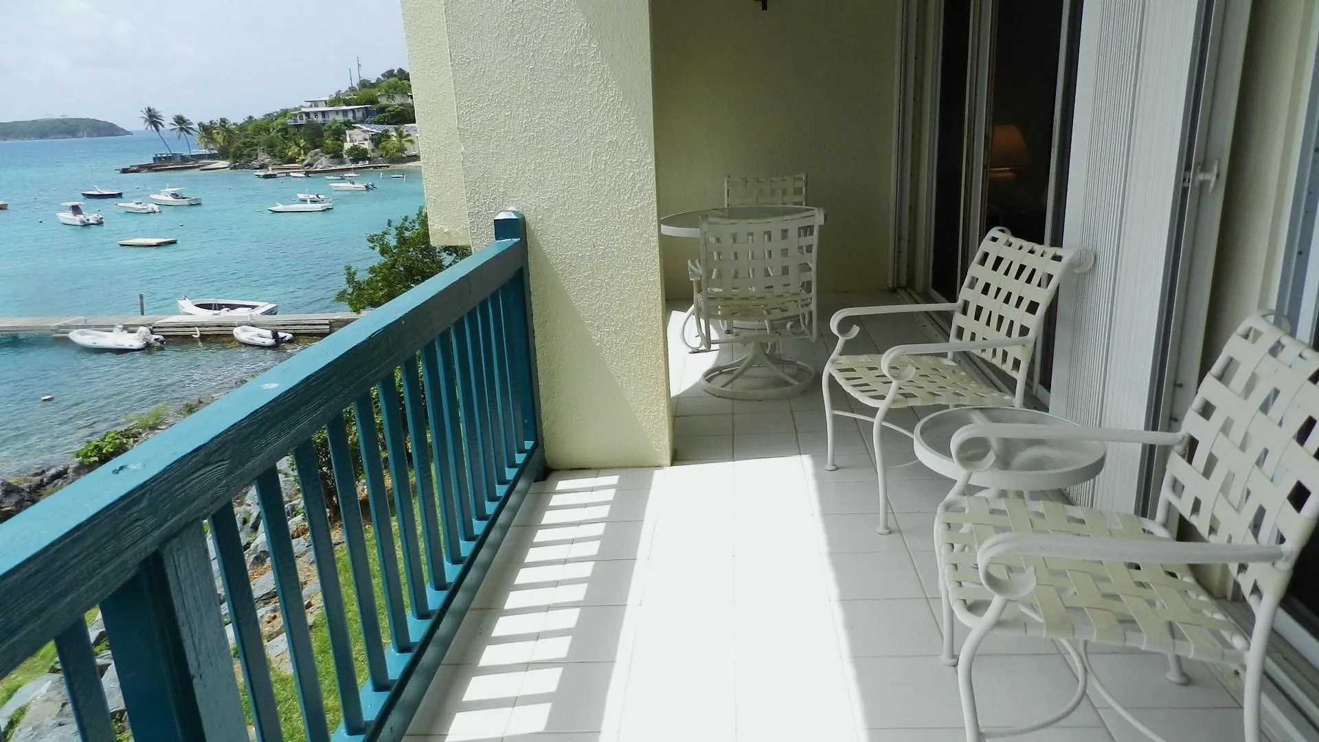 Pristine, well maintained Windward condo, enjoys WATERFRONT location just steps from Cowpet beach or St. Thomas Yacht Club. Full length covered balcony. Never rented, this bright and airy lower unit has white tile throughout and Corian kitchen counter tops - truly shows well. Soothing water music; eastern exposure and cooling breezes mean no need for AC! Long term daily housekeeper maintained
