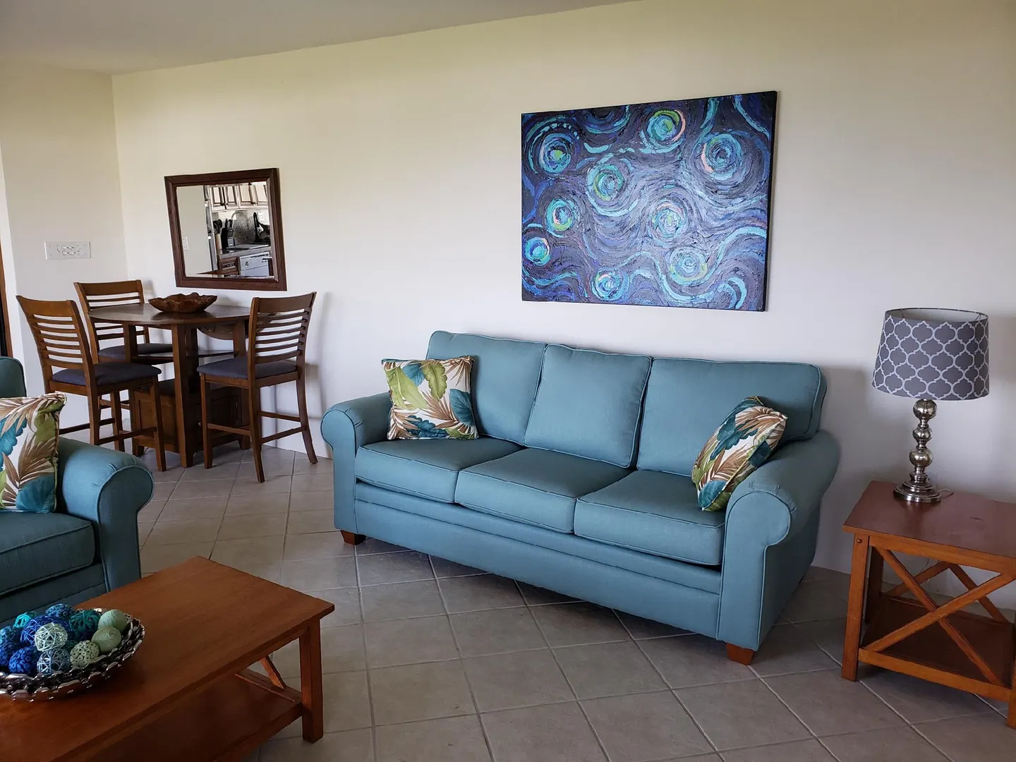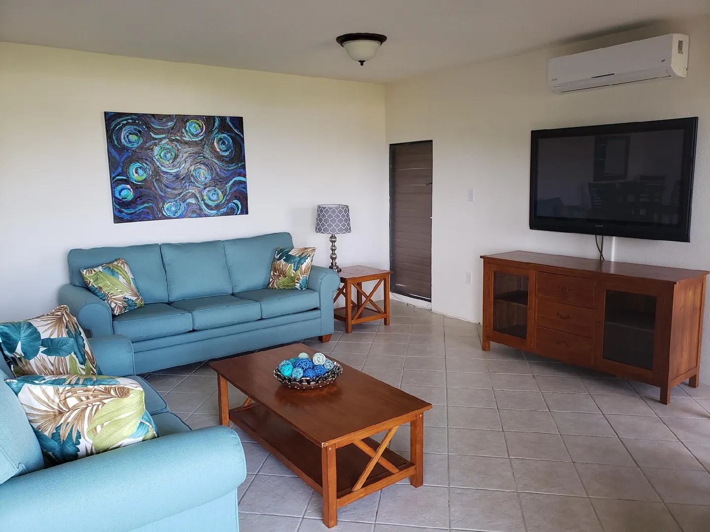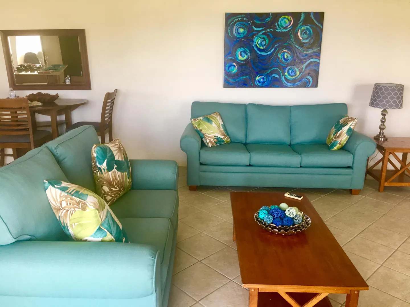 Beautiful, modern and tastefully furnished, one-bedroom condo located near world famous Magens Bay,St.Thomas. Golf-course and ocean views, newly renovated kitchen and bathroom, beautiful tile throughout, A/C wall units in bedroom and living room, washer/dryer, mounted flat-screen TV, comfortable balcony furniture, gas grill.