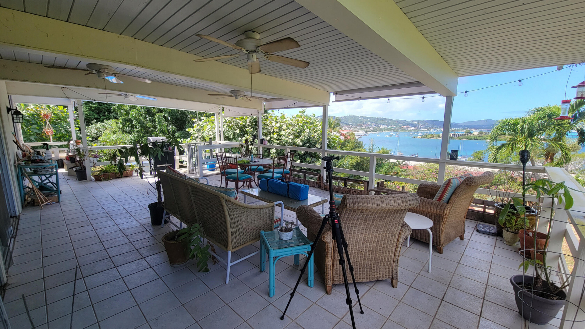 Welcome to a rare find! Stunning views of the sea, Christiansted harbor and beyond from this duplex featuring a one bedroom, one and a half bath upstairs and one bedroom, one bathroom downstairs. The upstairs unit has a 658 square foot terrace, a gorgeous perch to take in the breezes, vistas and sun. The house was renovated in 2022. The lot is enveloped in mature tropical landscaping. A perfect vacation rental property for an investor. Also perfect to live in with proximity to town, beaches and a short stroll for coffee and shopping in Gallows Bay. No matter the use, the views will captivate any occupant. Pool is not functional. Property is being sold AS IS. Same day showings!