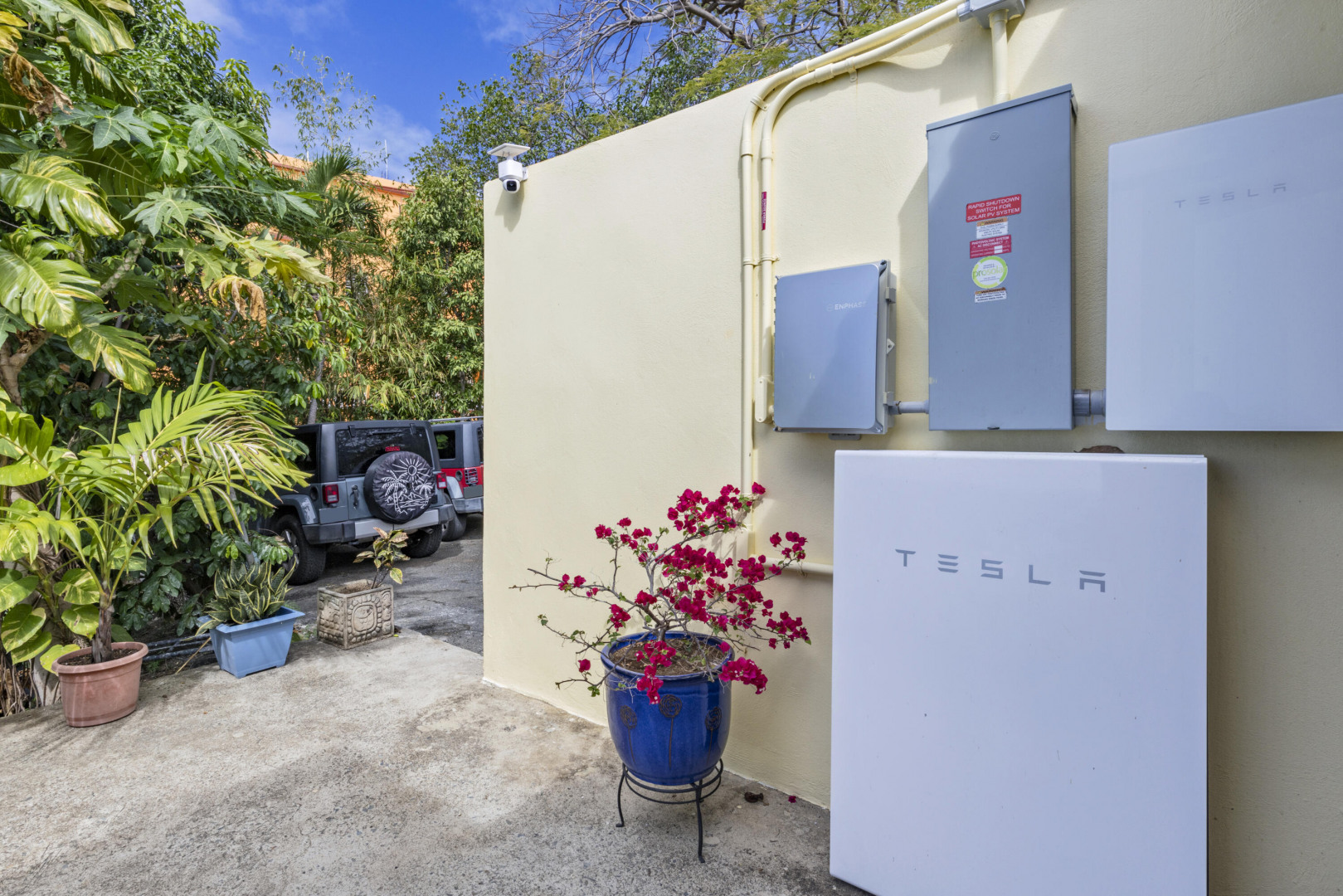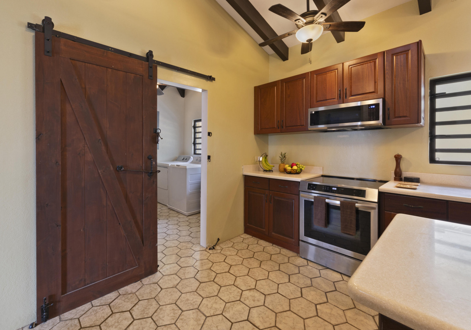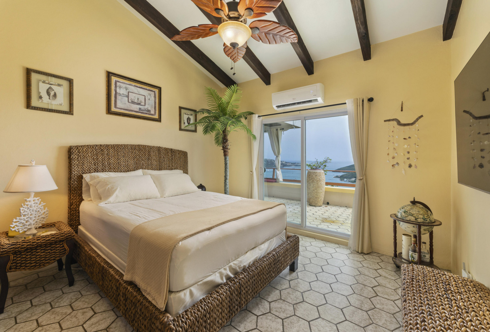 All utilities included! Bella Palms -- gorgeous furnished 2BR/1BA in Solberg w/ panoramic St. Thomas harbor views. 15' vaulted ceilings, exposed wood beams, original hex tile & brand new shower. Queen beds, Braxton Culler furnishings, baby grand piano, induction stove, microwave & Whirlpool appliances incl. dishwasher. AC, ceiling fans & floor safes in both bedrooms. Covered terrace, outdoor kitchen/BBQ, custom dining for 14 & 2 off-street parking spots. Electricity & Starlink internet included.