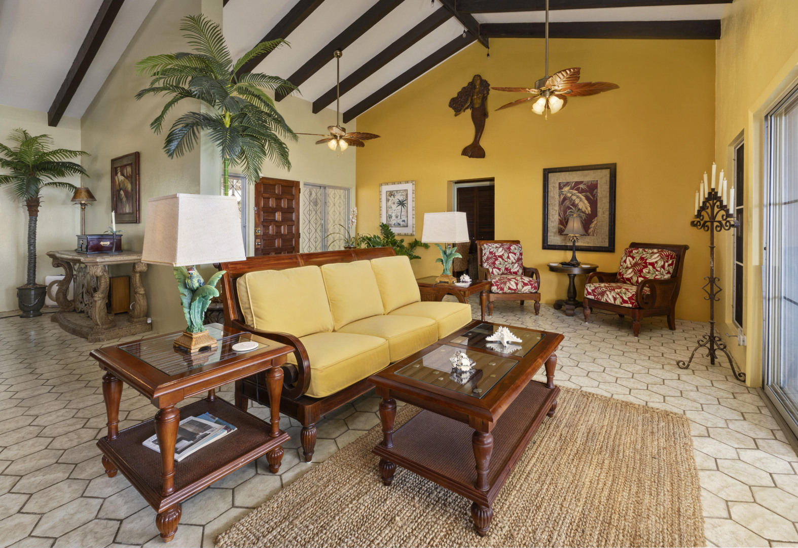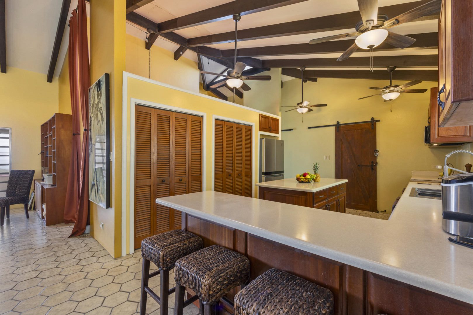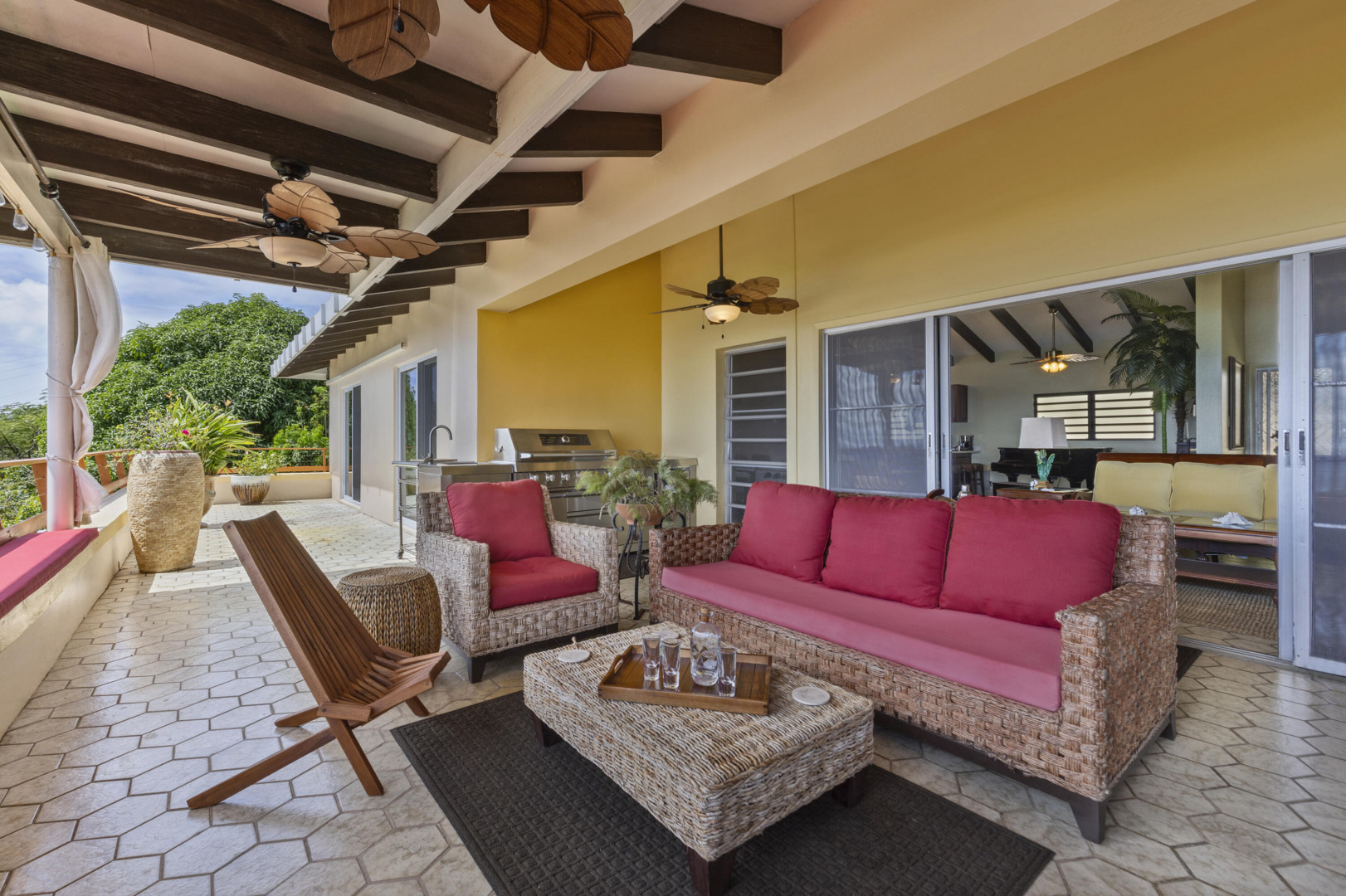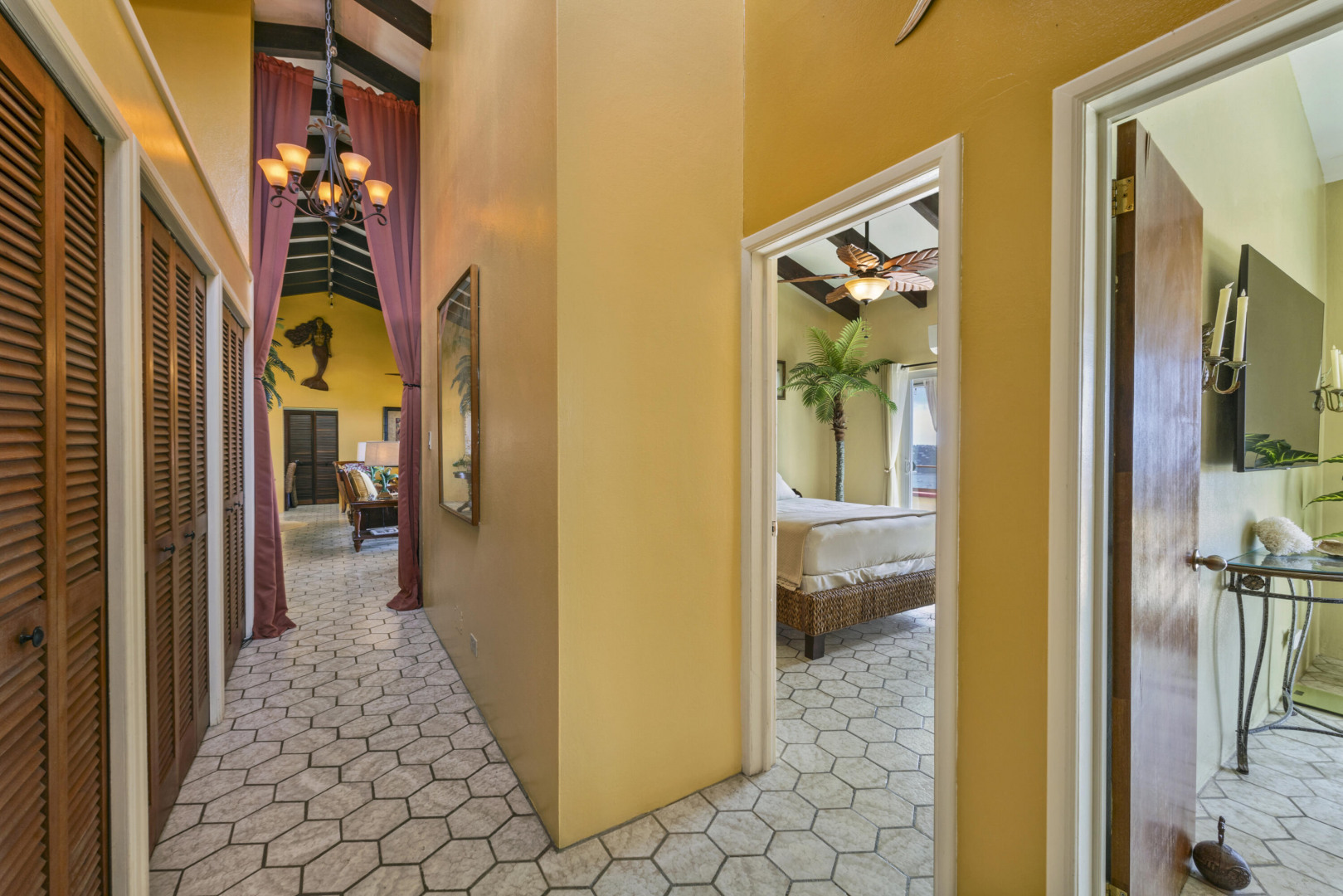 All utilities included! Bella Palms -- gorgeous furnished 2BR/1BA in Solberg w/ panoramic St. Thomas harbor views. 15' vaulted ceilings, exposed wood beams, original hex tile & brand new shower. Queen beds, Braxton Culler furnishings, baby grand piano, induction stove, microwave & Whirlpool appliances incl. dishwasher. AC, ceiling fans & floor safes in both bedrooms. Covered terrace, outdoor kitchen/BBQ, custom dining for 14 & 2 off-street parking spots. Electricity & Starlink internet included.
