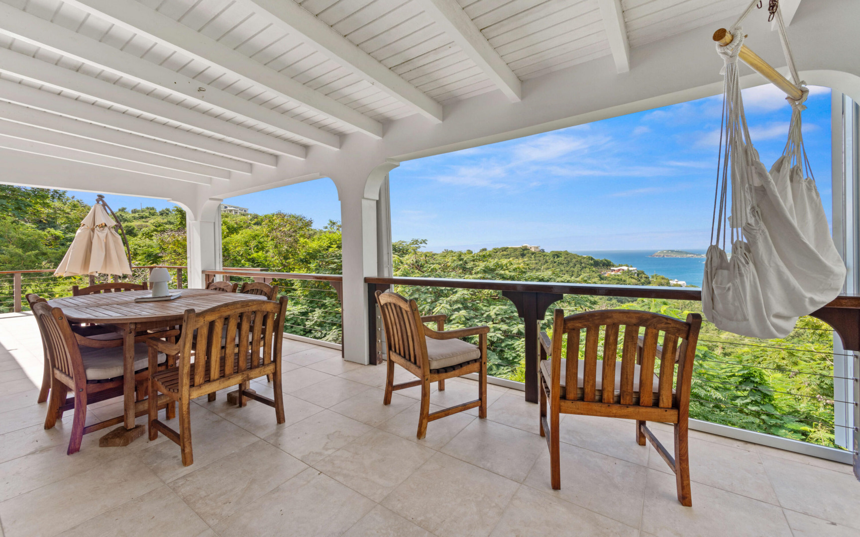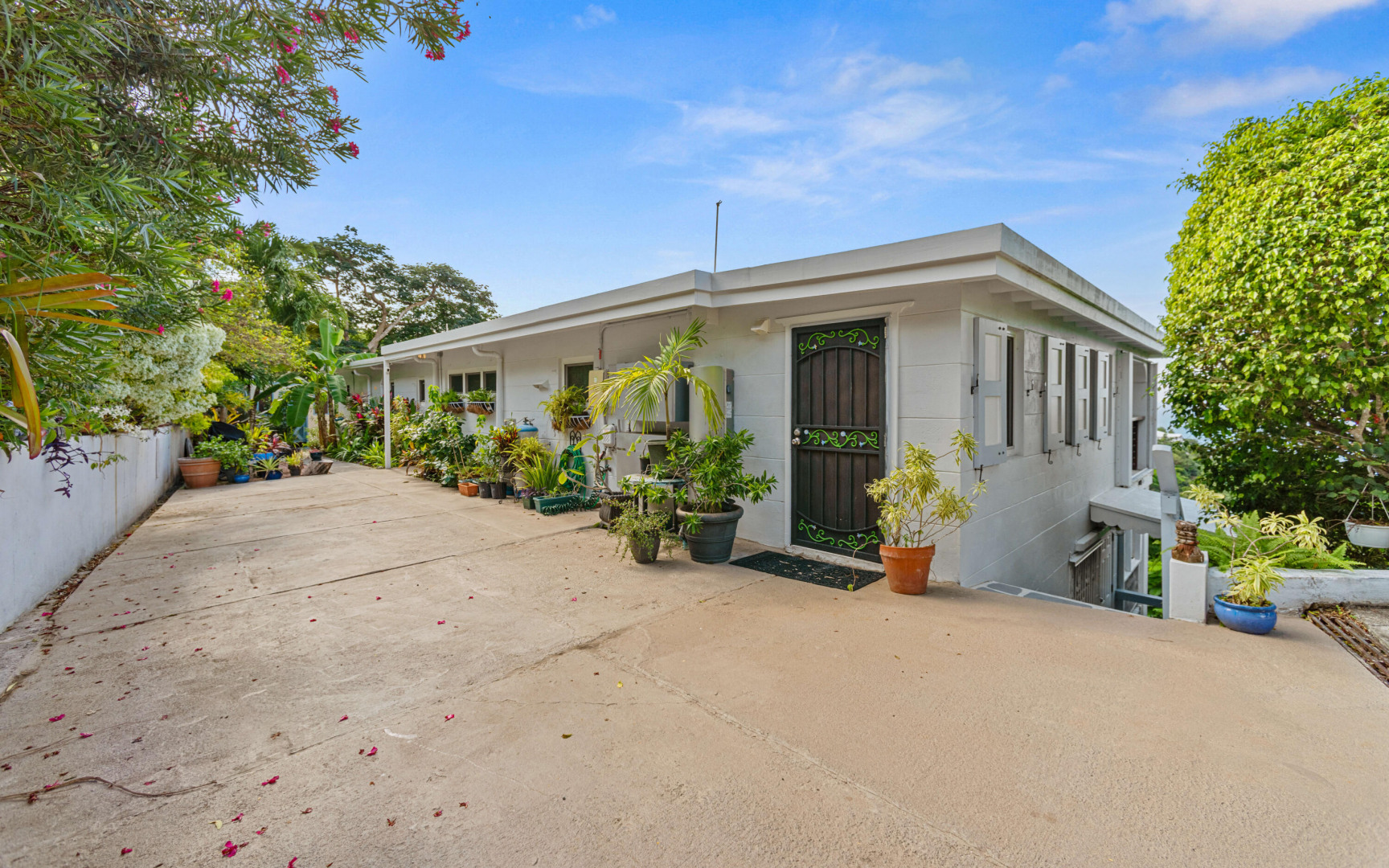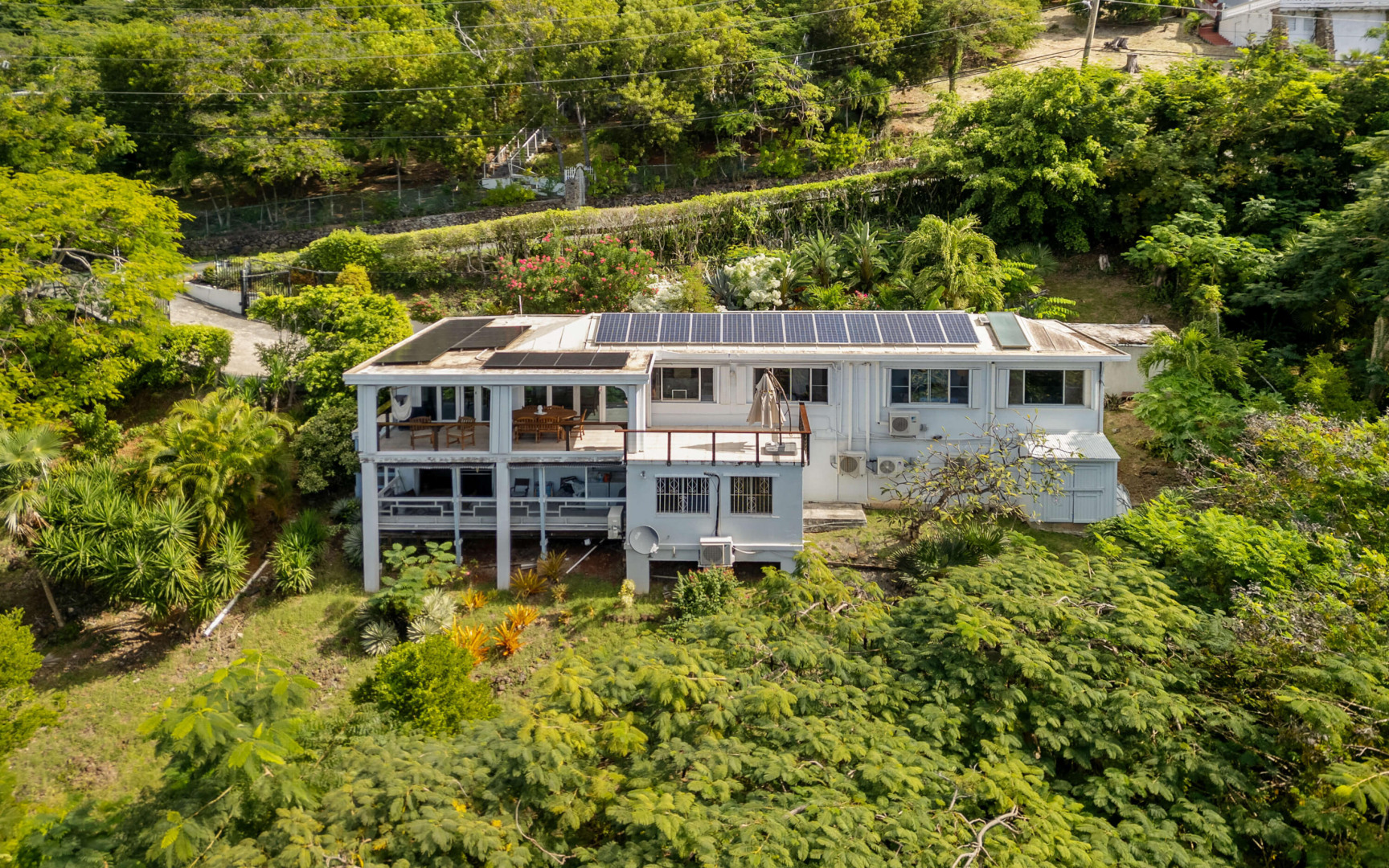 Enjoy serene harbor and ocean views from this 3-bedroom, 2-bath concrete home with a separate 1-bedroom apartment. Set on just over half an acre, the spacious deck offers the perfect spot to relax, whether with your morning coffee or to watch the cruise ships depart.This property is designed with practicality in mind, featuring solar panels, backup batteries, a small generator, and water filtration systems in both kitchens. Located in the convenient Bakkero neighborhood, it's close to schools, Havensight, and various beaches.An electronic gate provides privacy, and the landscaped yard includes a variety of tropical plants, such as pineapples, pomegranates, and aloe. Fully shuttered and thoughtfully maintained, this home combines modern functionality with the ease of island living.