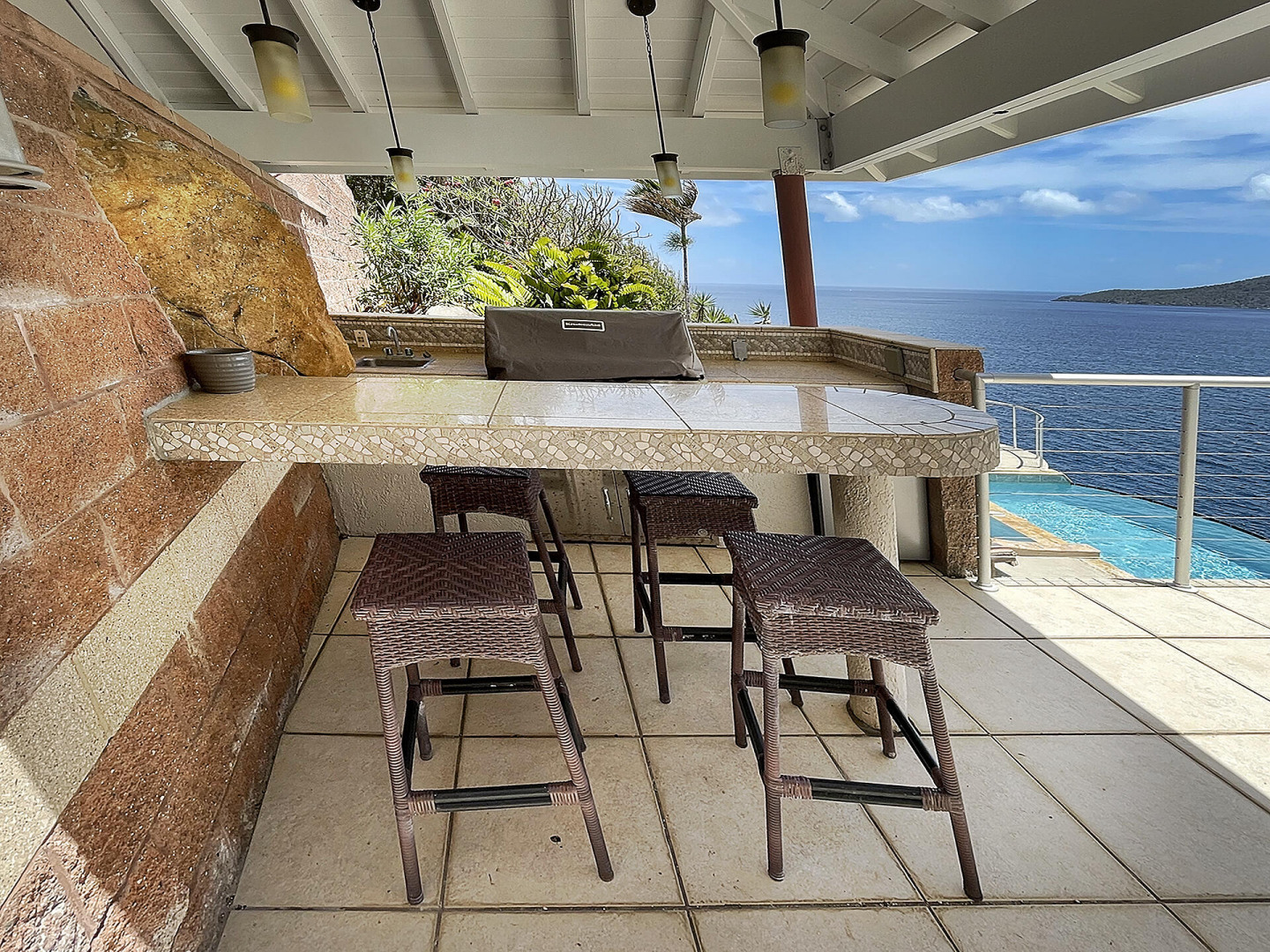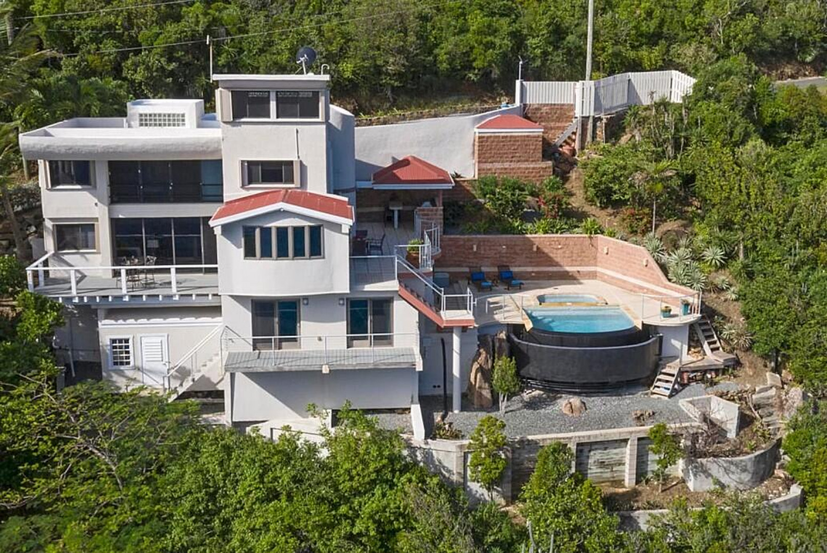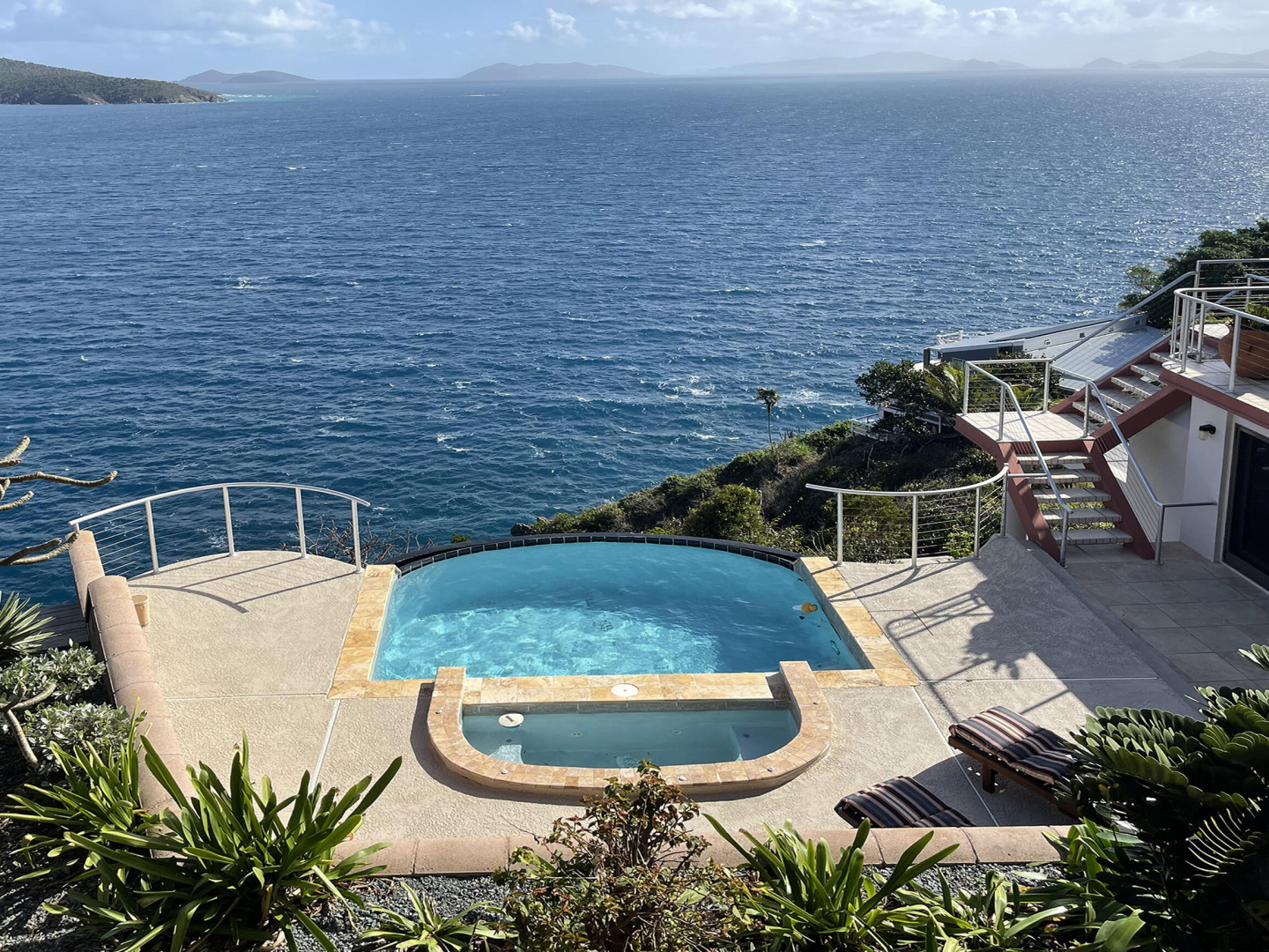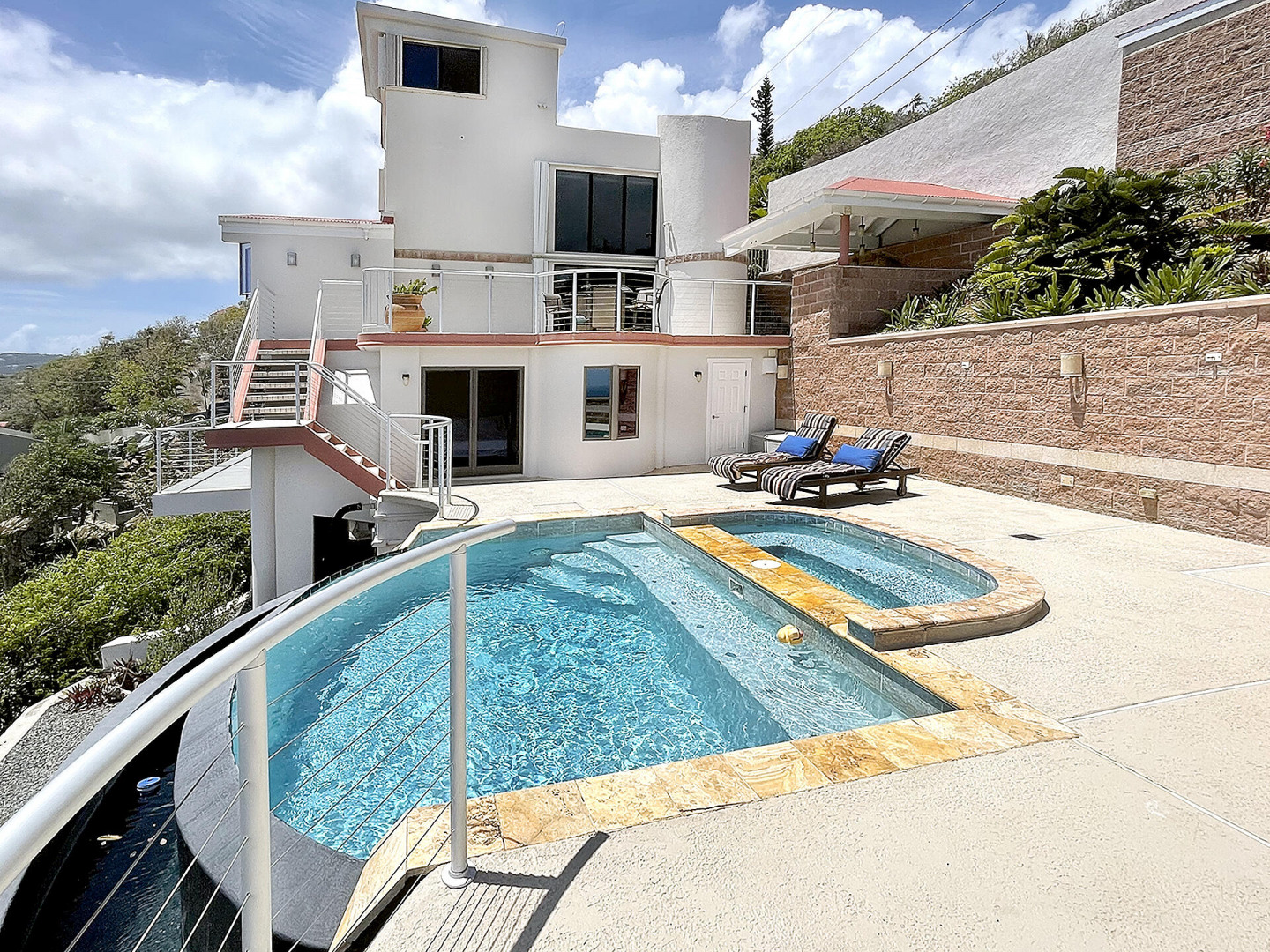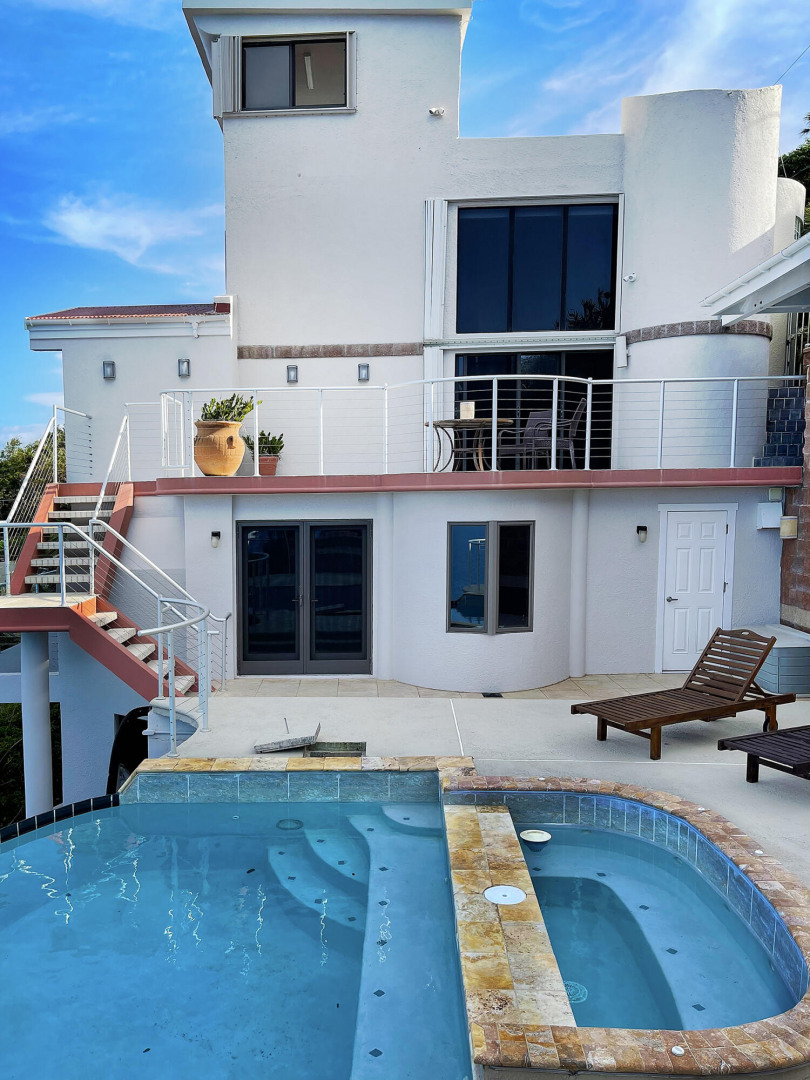 WATERFRONT home, gated REDROCK community-Mediterranean-style Villa; Spectacular views Hans Lollik, St John & BVI. Solar, Bright oversize Windows & Sliding Glass Doors. Open multi-level Layout 4 large decks wth views for entertaining. Major reno 2005-2006- Chef's Kitchen: Quartz Counters, Sub Zero frge + wine frge, Viking Cooktop, 2 ovens, Miele Dishwasher, microwave & double ovens +6k Miele Coffee machine. Din Room opens to outdoor Kitchen, Grill, fridge, Bar Sink. Relax in Infinity Edge .Pool with Down Island Forever Views.Spacious Primary Suite wth barn doors + ensuite & entire-room closet. 2 Guest Suites each wth baths + decks. Top level office perch wth ocean views. Automatic Diesel Generator, solar, Full House UV Water Filter. Lux Waterfront Villa. Home is Realtor owned