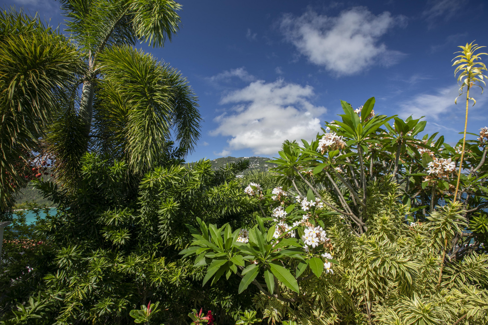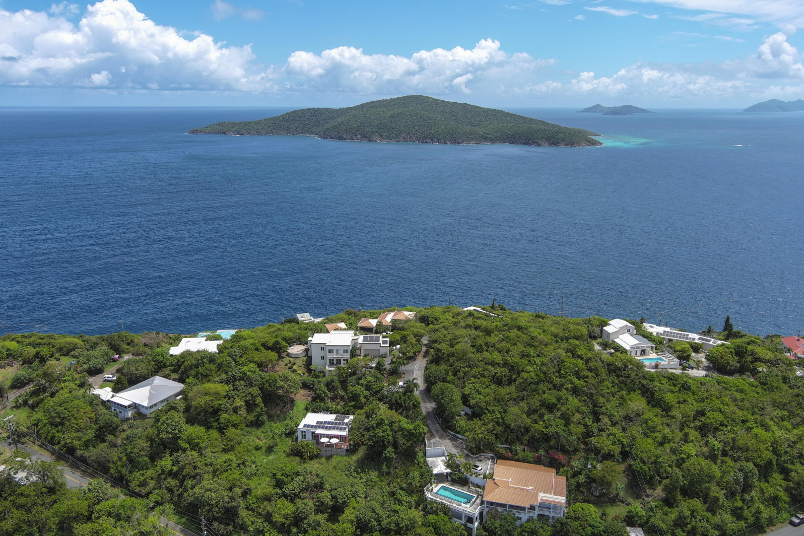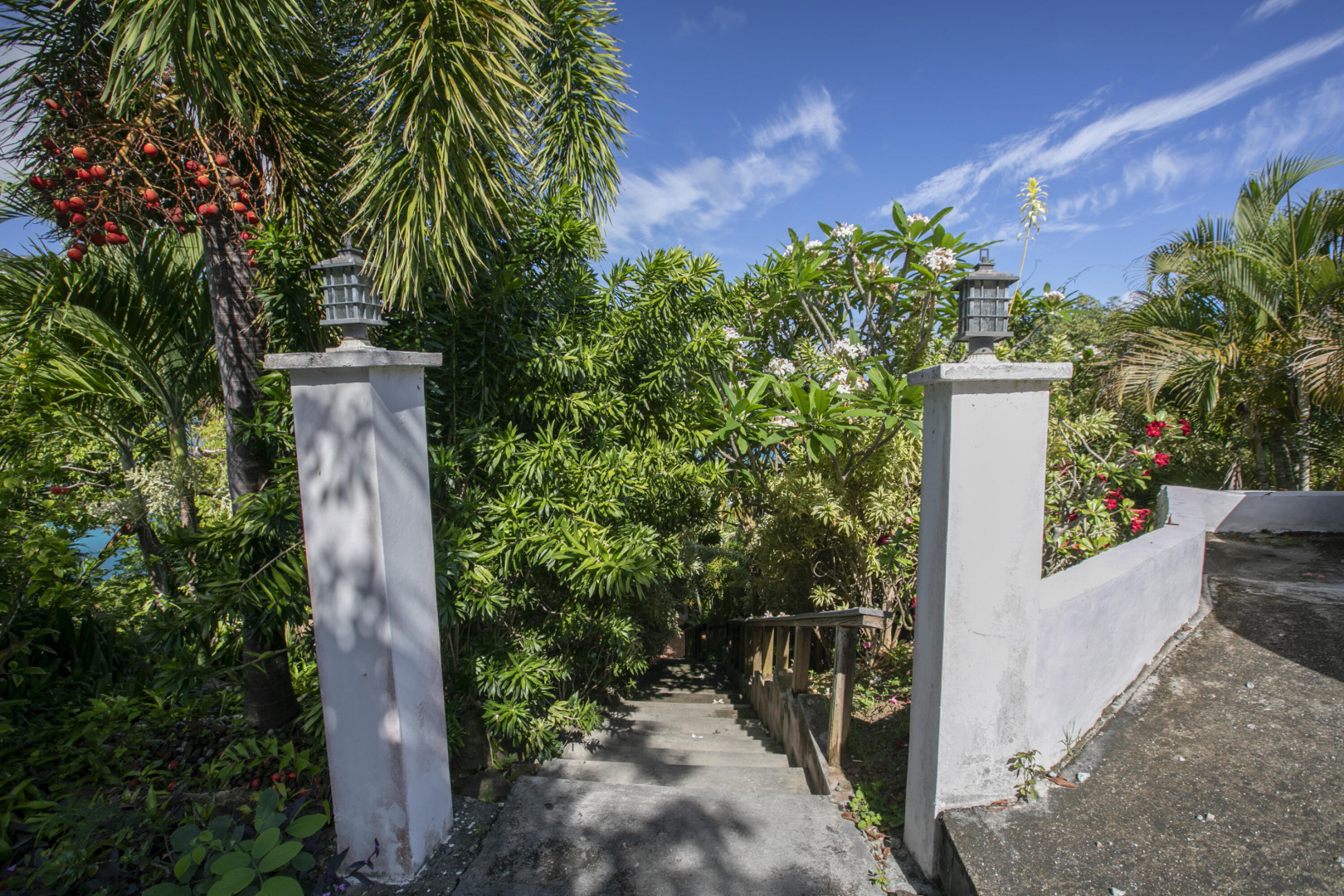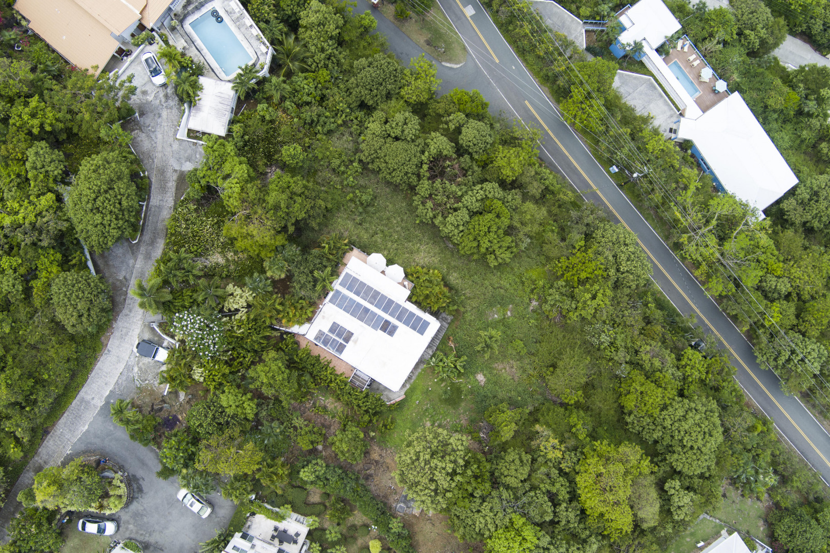 This home and vacation rental is located in a quiet, gated community on the Peterborg peninsula with beautiful views of Magens Bay. It sits on over half an acre with plenty of privacy and space to expand. The house is equipped with 28 solar panels and backup generator. The flat roof is ready for a second story if desired. Inside, the home features a large living room with high ceilings and tall windows, a spacious kitchen, AC in bedrooms and living room, 2BE 1BA, and a 55,000 gallon cistern. This turnkey opportunity includes wooden furniture and a Balinese door frame. Banana plants grow outside the living room window, and lush, low-maintenance plants surround the stairs going down to the house. The property is a short walk or drive to the beach.