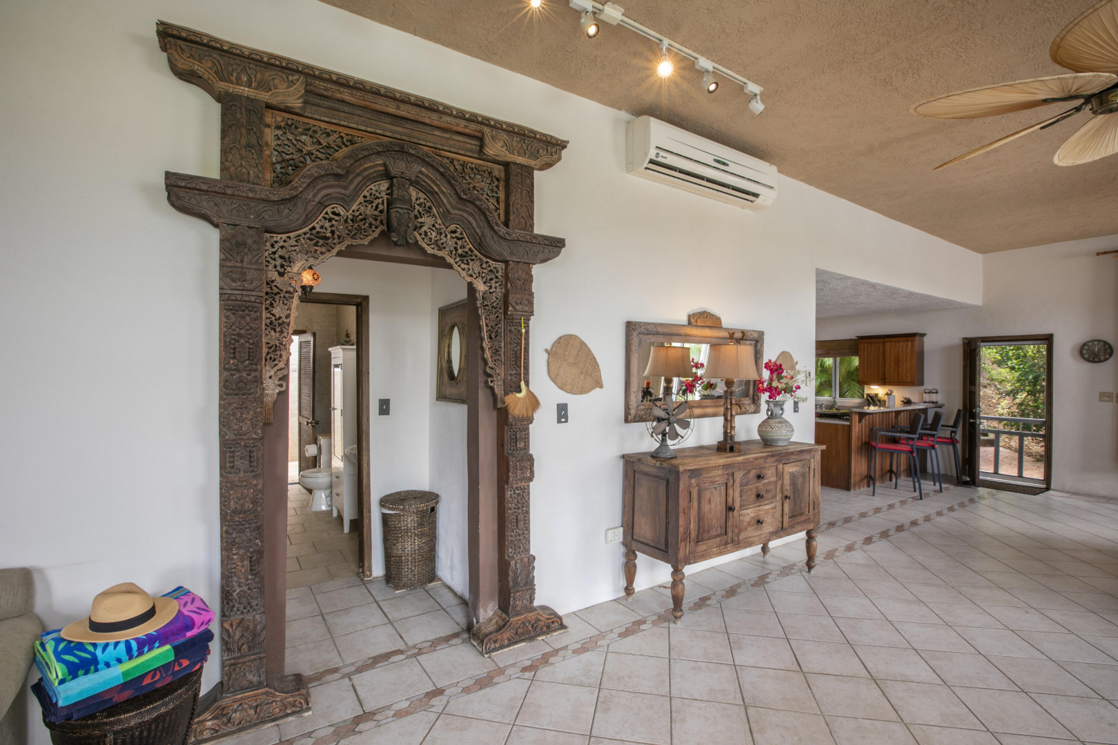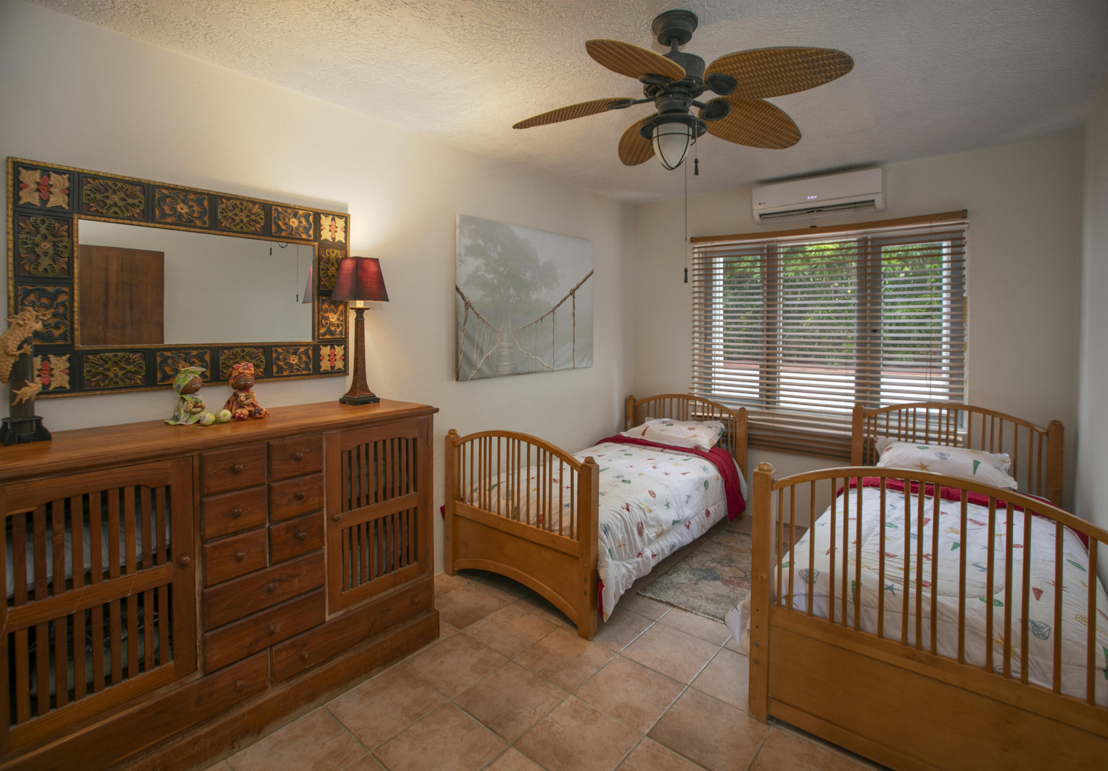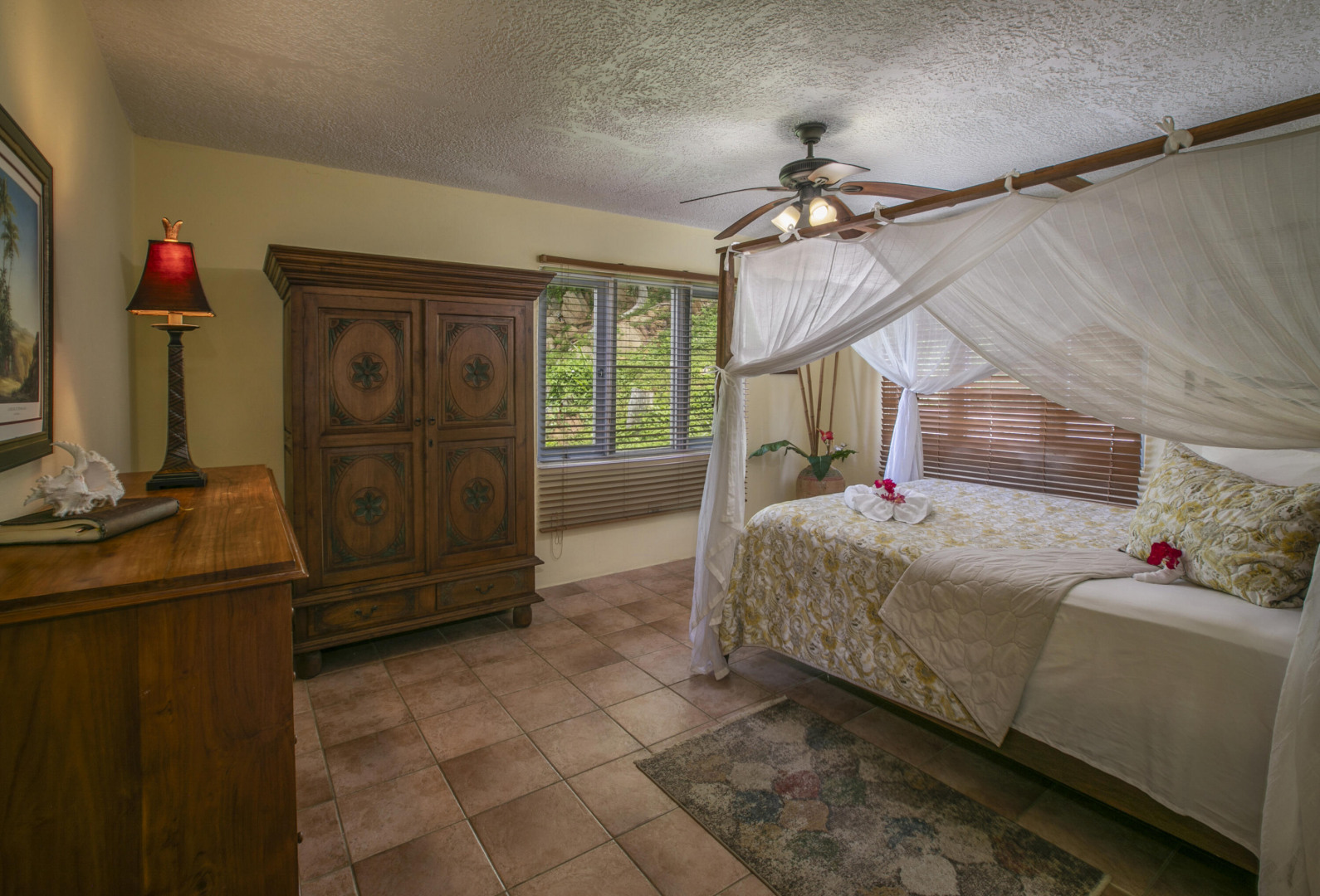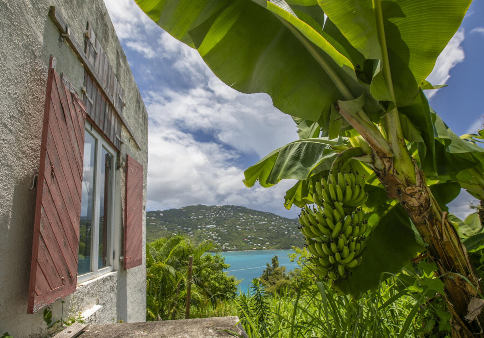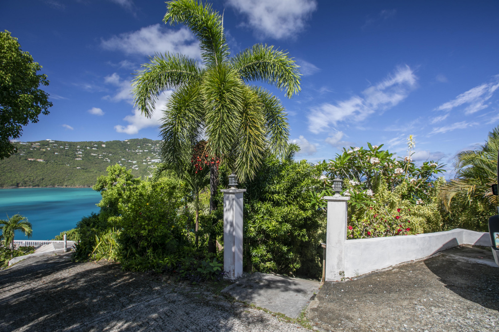 This home and vacation rental is located in a quiet, gated community on the Peterborg peninsula with beautiful views of Magens Bay. It sits on over half an acre with plenty of privacy and space to expand. The house is equipped with 28 solar panels and backup generator. The flat roof is ready for a second story if desired. Inside, the home features a large living room with high ceilings and tall windows, a spacious kitchen, AC in bedrooms and living room, 2BE 1BA, and a 55,000 gallon cistern. This turnkey opportunity includes wooden furniture and a Balinese door frame. Banana plants grow outside the living room window, and lush, low-maintenance plants surround the stairs going down to the house. The property is a short walk or drive to the beach.