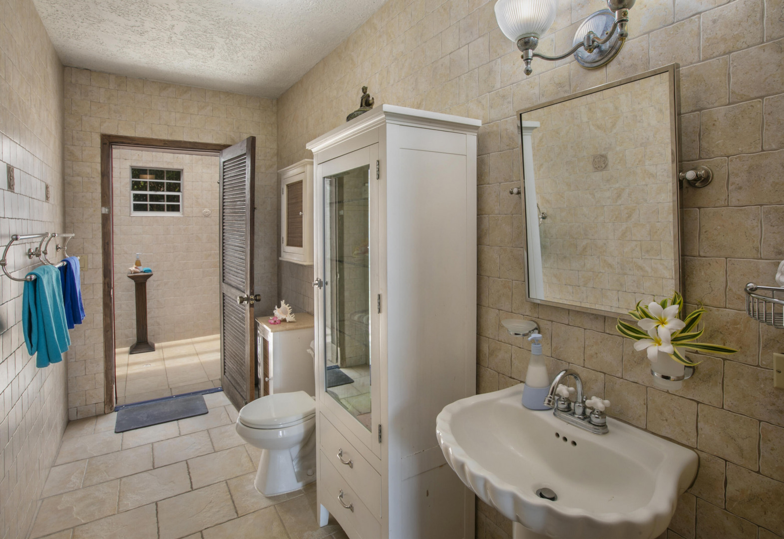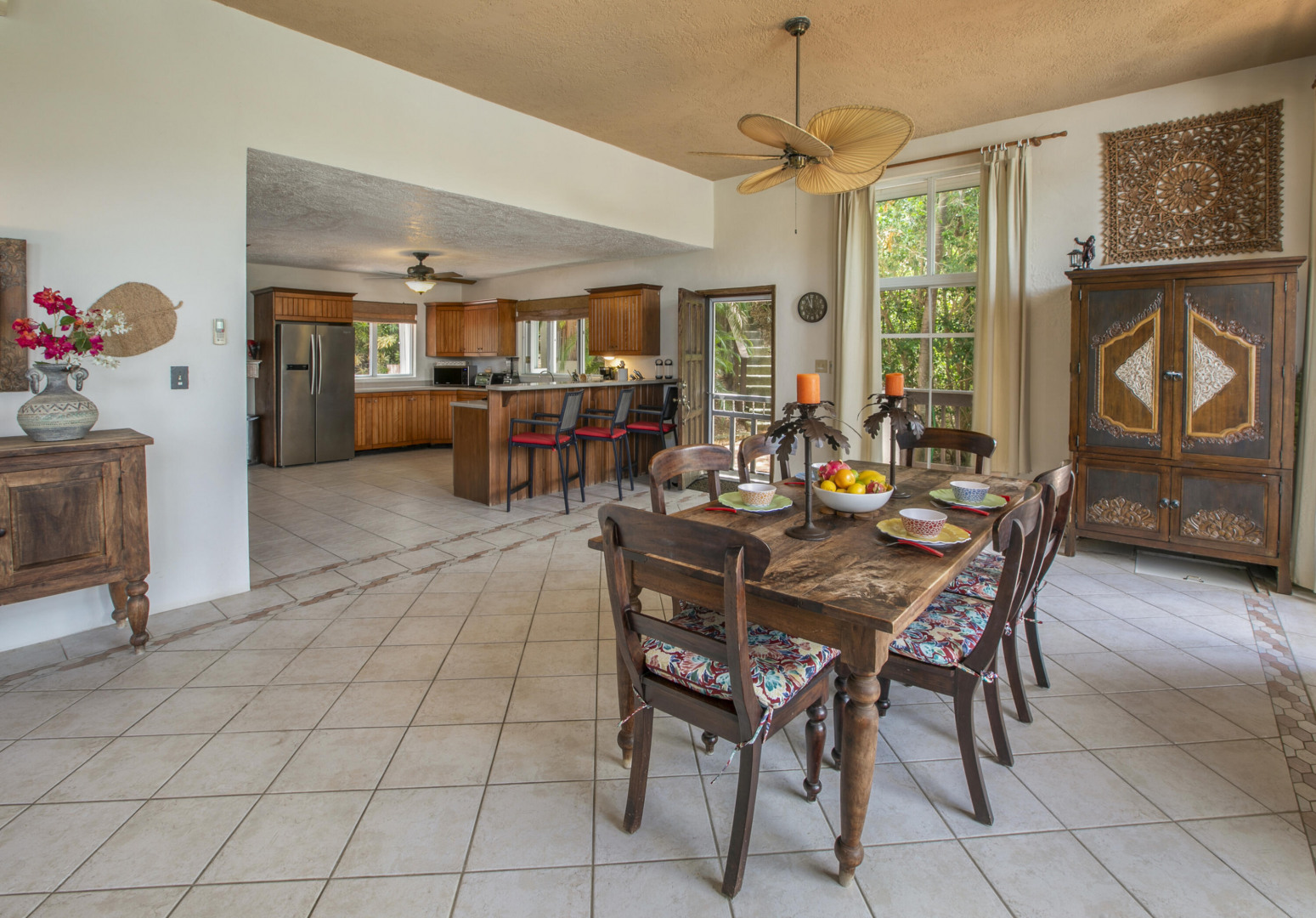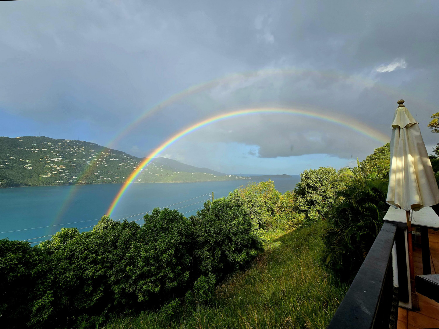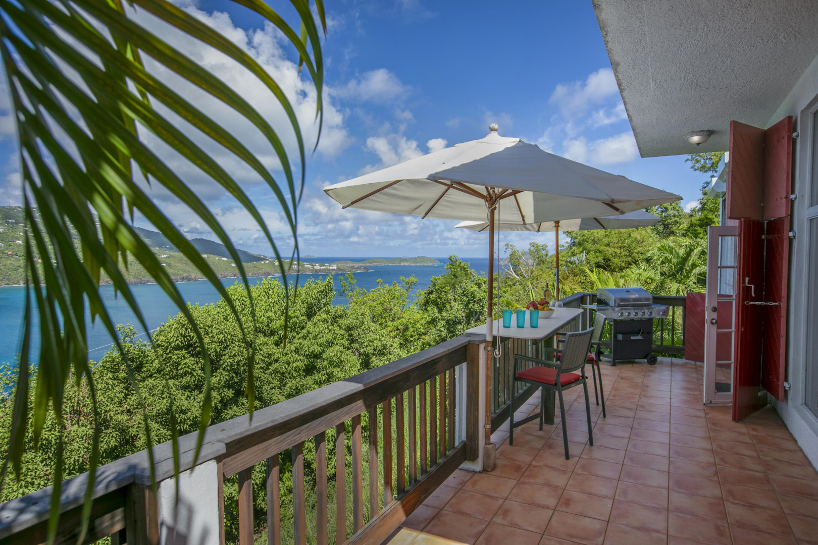This home and vacation rental is located in a quiet, gated community on the Peterborg peninsula with beautiful views of Magens Bay. It sits on over half an acre with plenty of privacy and space to expand. The house is equipped with 28 solar panels and backup generator. The flat roof is ready for a second story if desired. Inside, the home features a large living room with high ceilings and tall windows, a spacious kitchen, AC in bedrooms and living room, 2BE 1BA, and a 55,000 gallon cistern. This turnkey opportunity includes wooden furniture and a Balinese door frame. Banana plants grow outside the living room window, and lush, low-maintenance plants surround the stairs going down to the house. The property is a short walk or drive to the beach.
