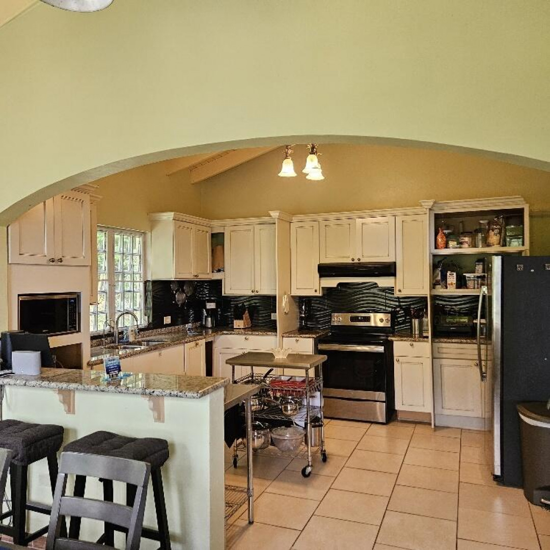 Massive concrete home with 4 bedrooms, 2 baths upstairs and a large 3 bedrooms, 2 baths apartment downstairs on a walk in level. Situated on a lushly landscaped parcel. During past few years seller has installed 30 solar panels and 3 Tesla power walls which provide most of Main level power needs. The apartment needs kitchen cabinets as the old ones are removed. Main level needs some new til floors and painting. Added during past few years are extensive stone walls and the beginning of a stone & concrete pool.
