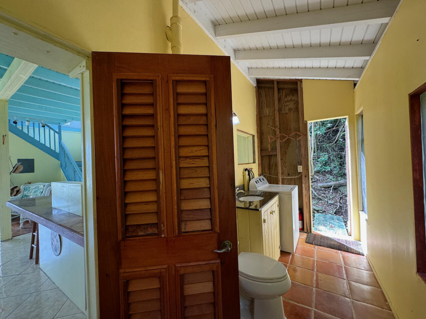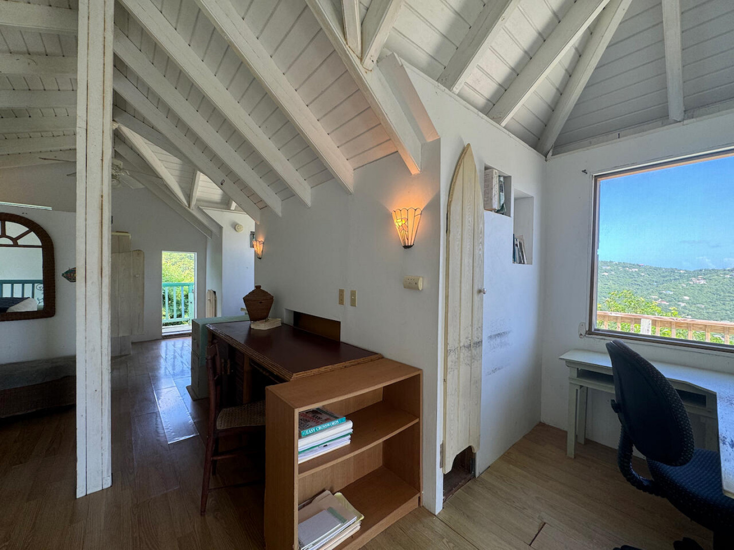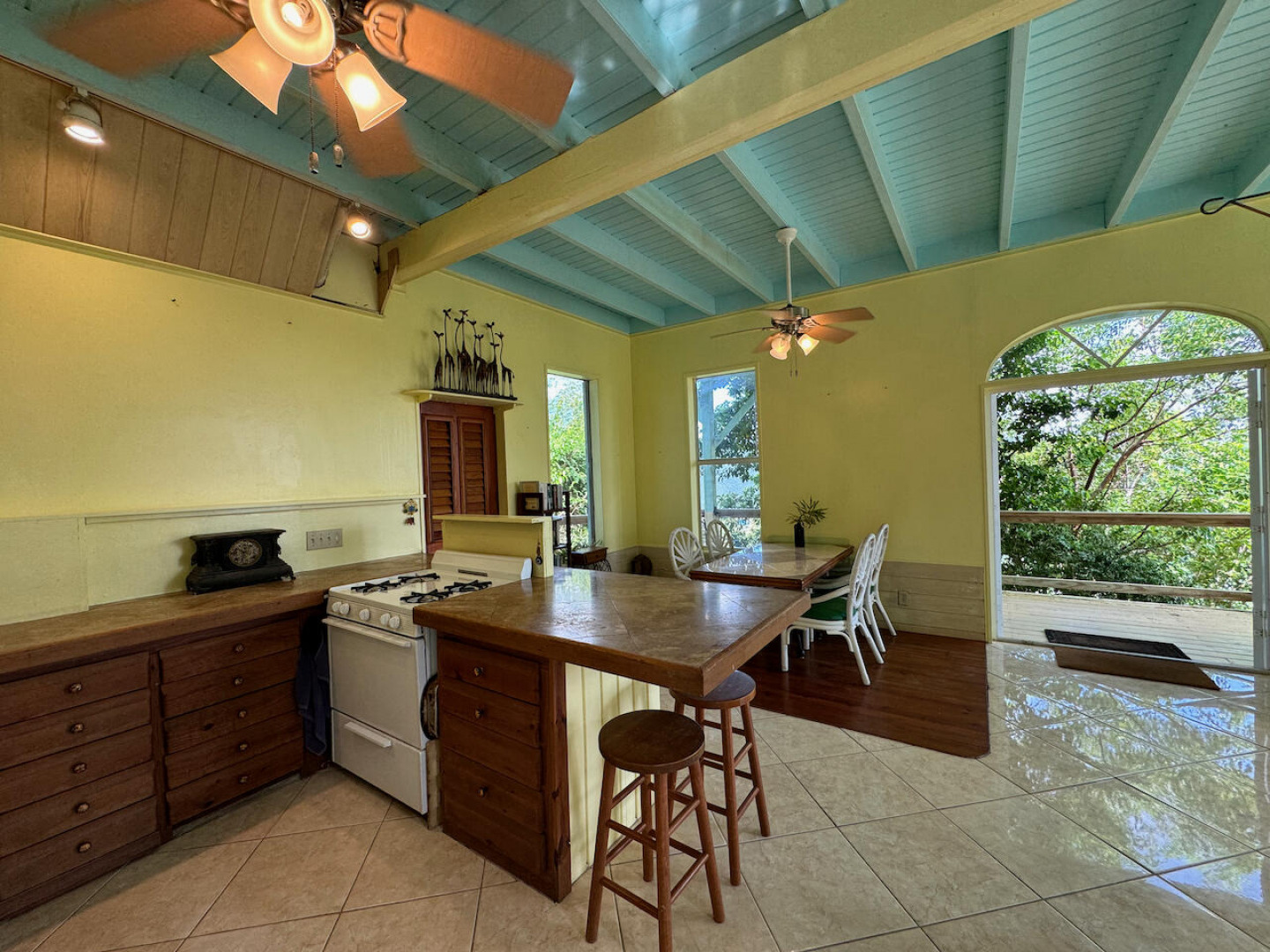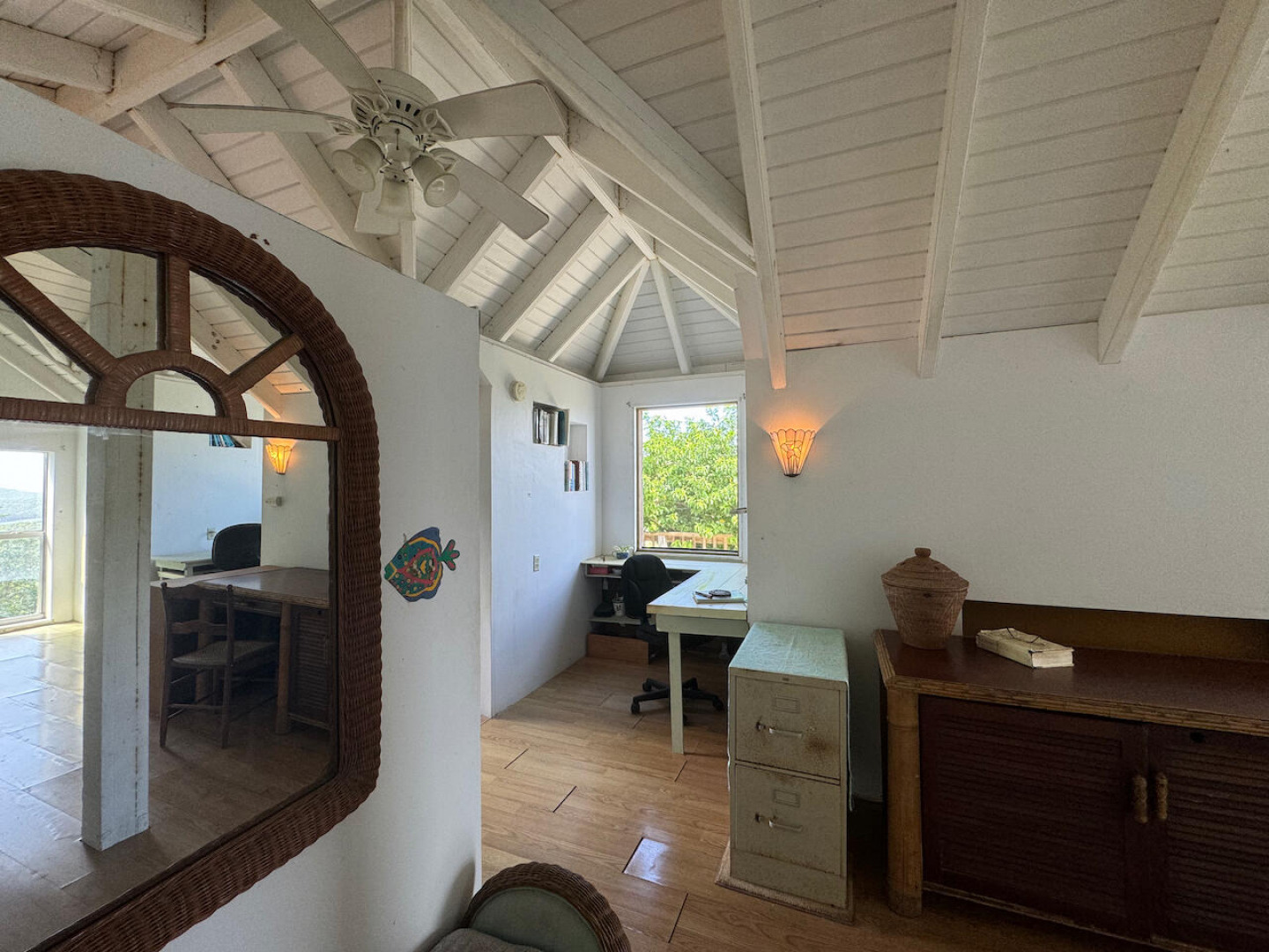 Wanted: Full coat of paint and a little love to make this charming cottage your own! Owner built and occupied since 1999, and now a perfect first home or dreamy retirement retreat. Lots of breeze, greenery, and natural light surrounding. Two built-in work nooks, with views makes this ideal for remote working too! Mixed materials of concrete cisterns/foundation and wood frame. Original construction documents and photos available. This very private spot is at the end of the road, nestled into the trees with Coral Bay and down island views to the north east. Buyers will need to embrace the adventurous road; yet only minutes from restaurants, shopping and groceries.