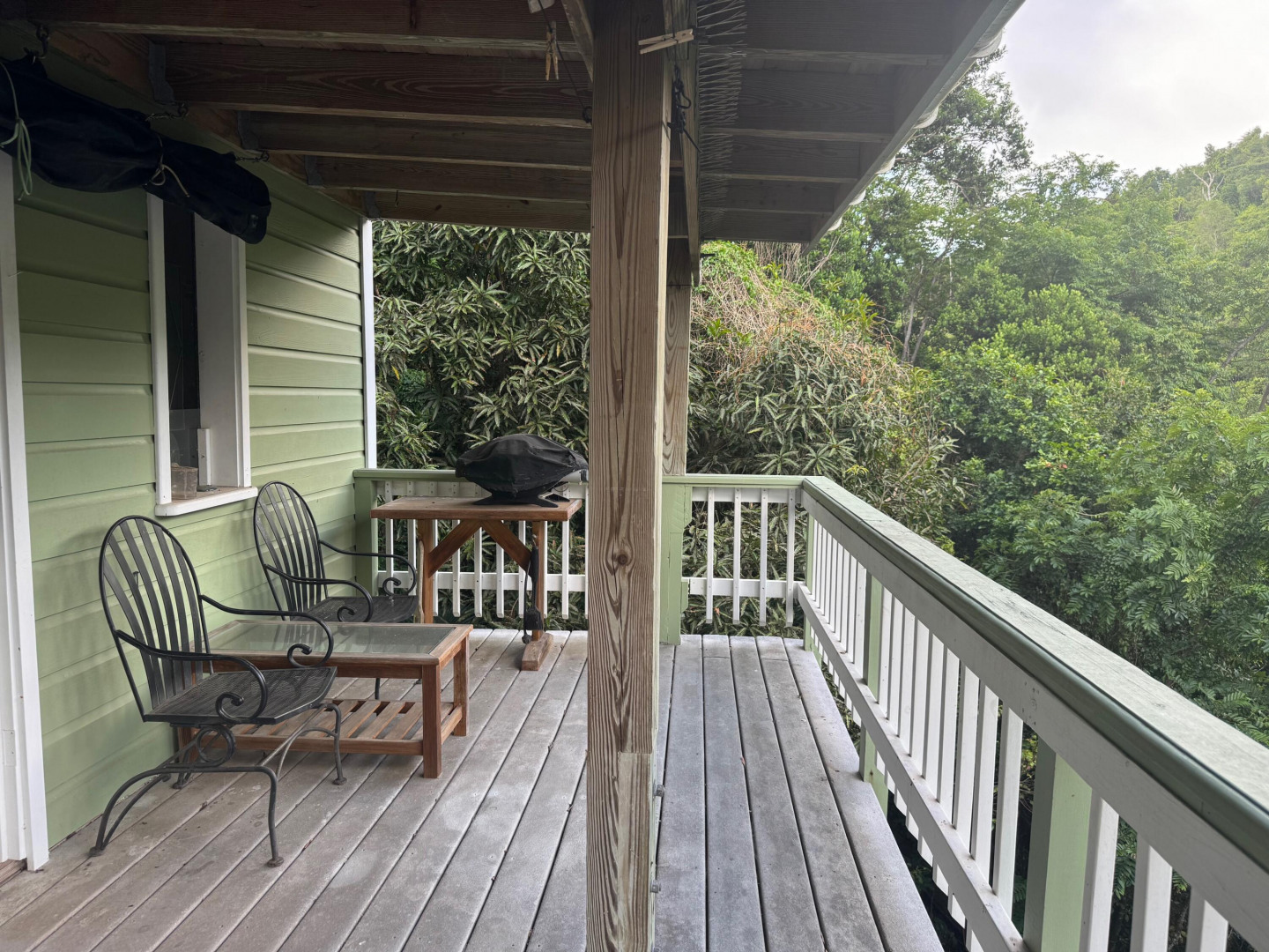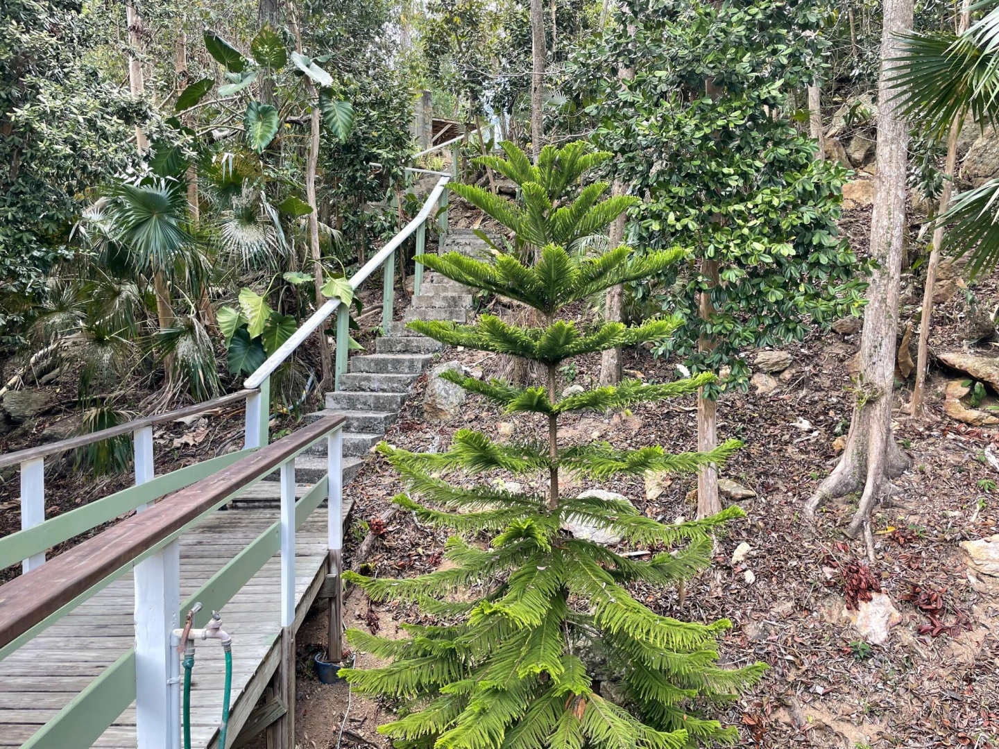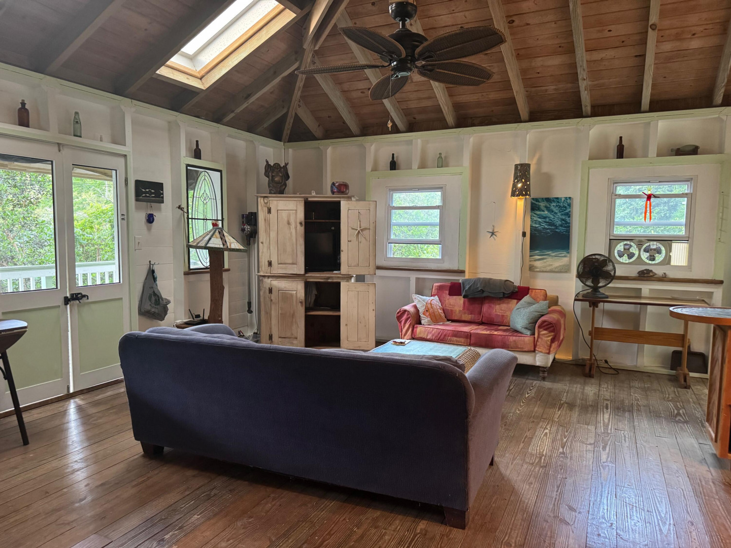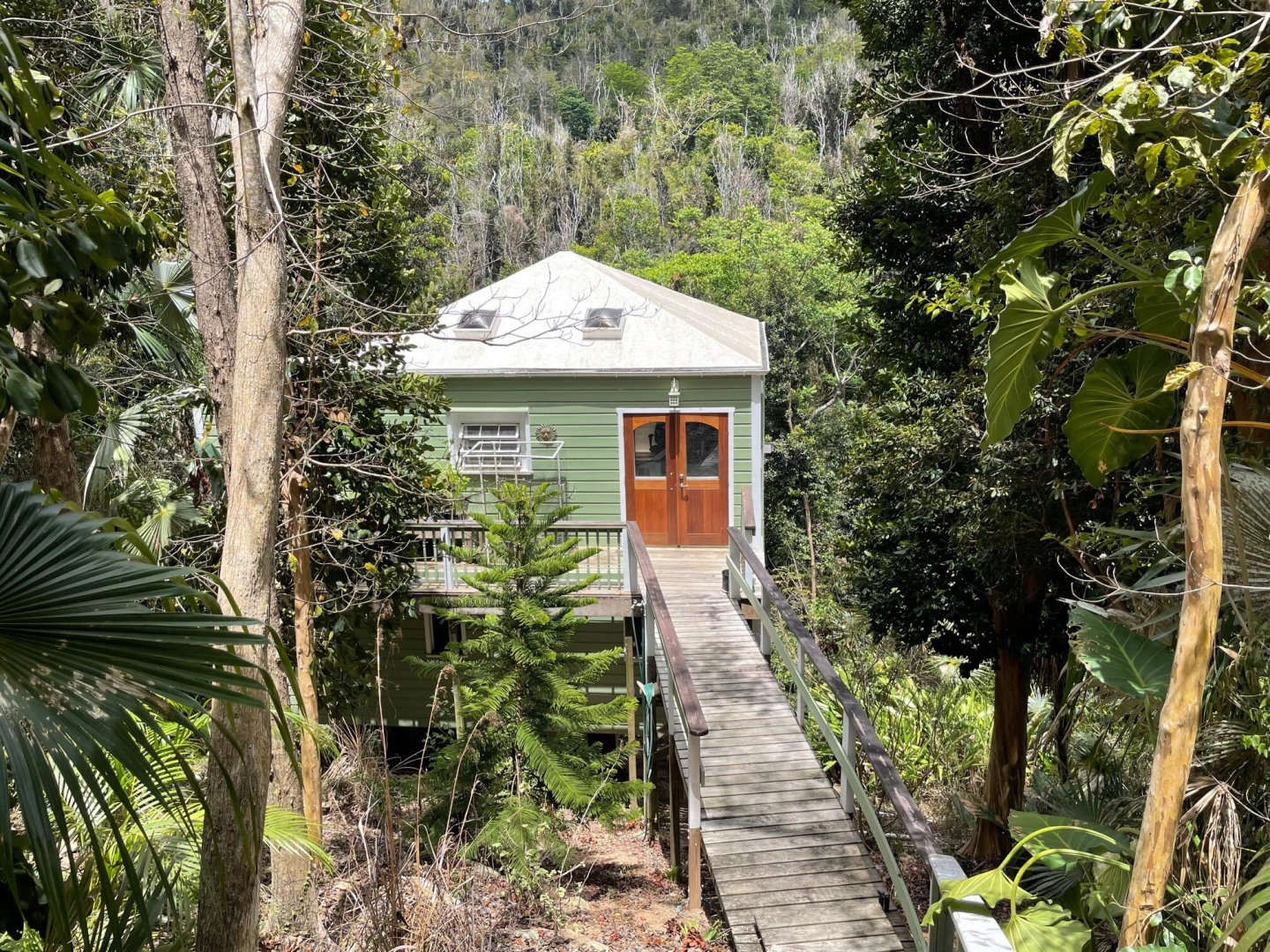 Bay Tree Cottages is a secluded, private end of the road property surrounded by lush large bay rum trees and the natural beauty of Bordeaux Mountain. The main house has a large upstairs kitchen, dining, living area with laundry and the downstairs has one large bedroom with ample closets and ensuite bathroom. Both levels have covered porches. The smaller cottage has kitchen, dining and living area as well with a sleeping loft, shower and separate bathroom with composting toilet. At the entry is a small shop / garage. This gardeners dream property has a lot of potential. Property has certificate of occupancy and permanent power. Buyers to verify cistern size and square foot of buildings.