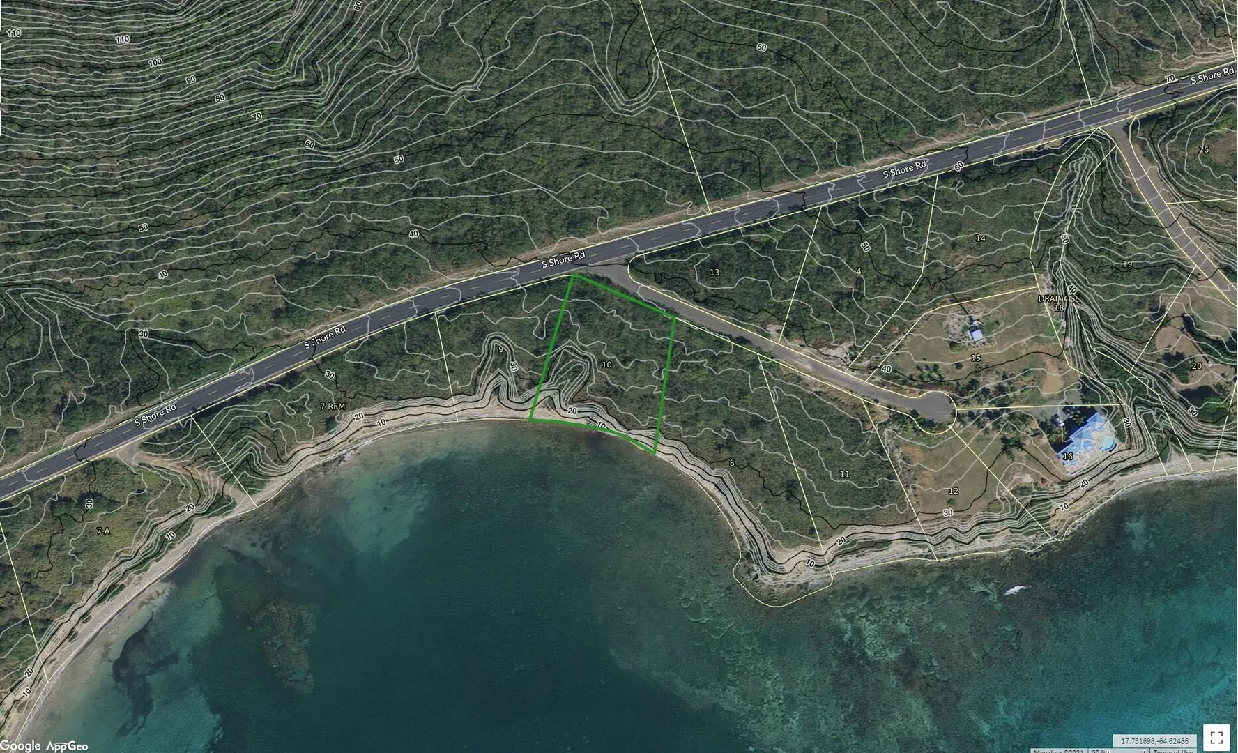 This .62 acre parcel is located just off South Shore road West of Divi Casino and Grassy Point and extends from the road all the way to the waterfront. Unobstructed sea views! Excellent building site! Estate Wood Cottage is a 15 minute drive to downtown Christiansted.