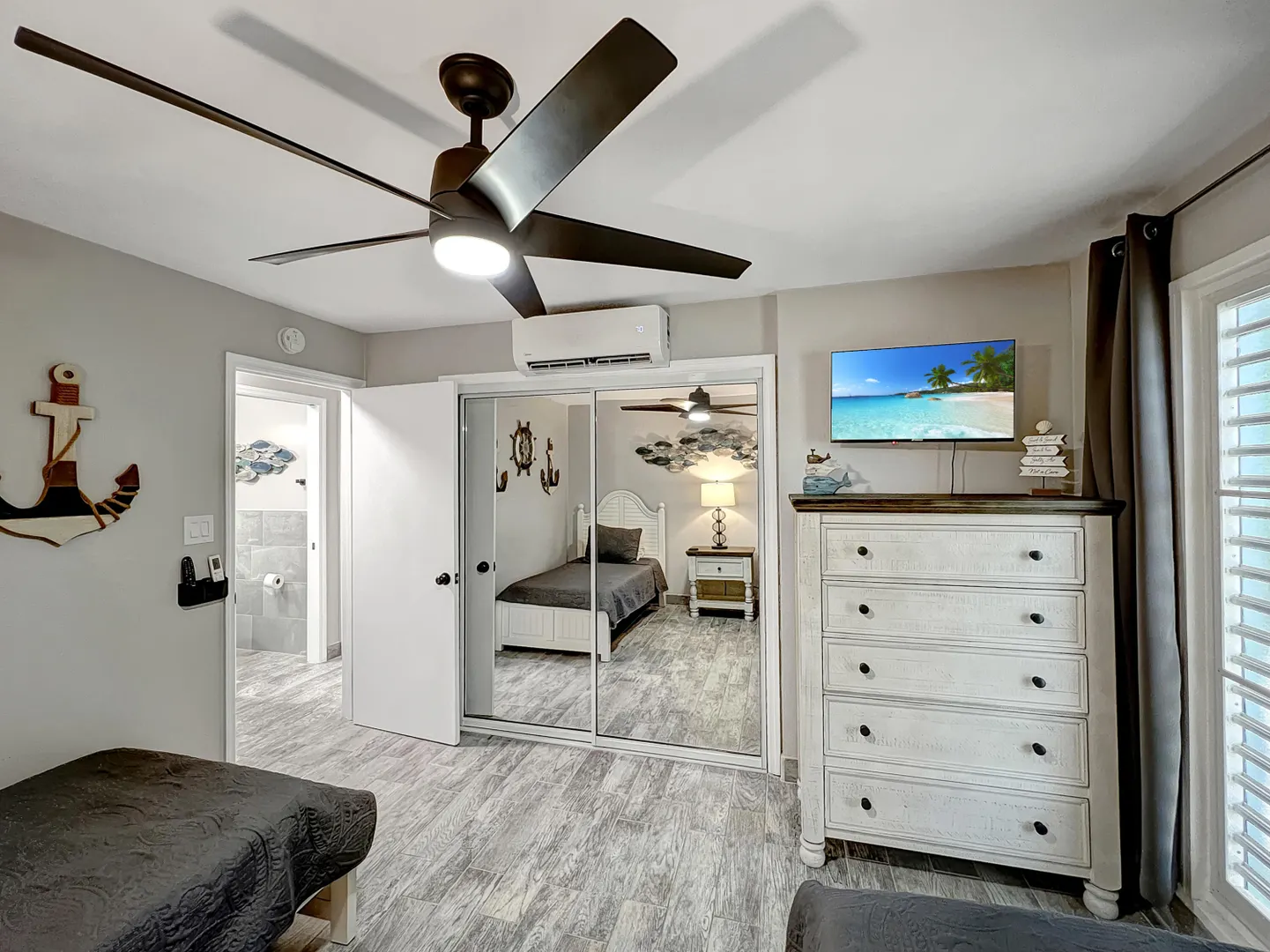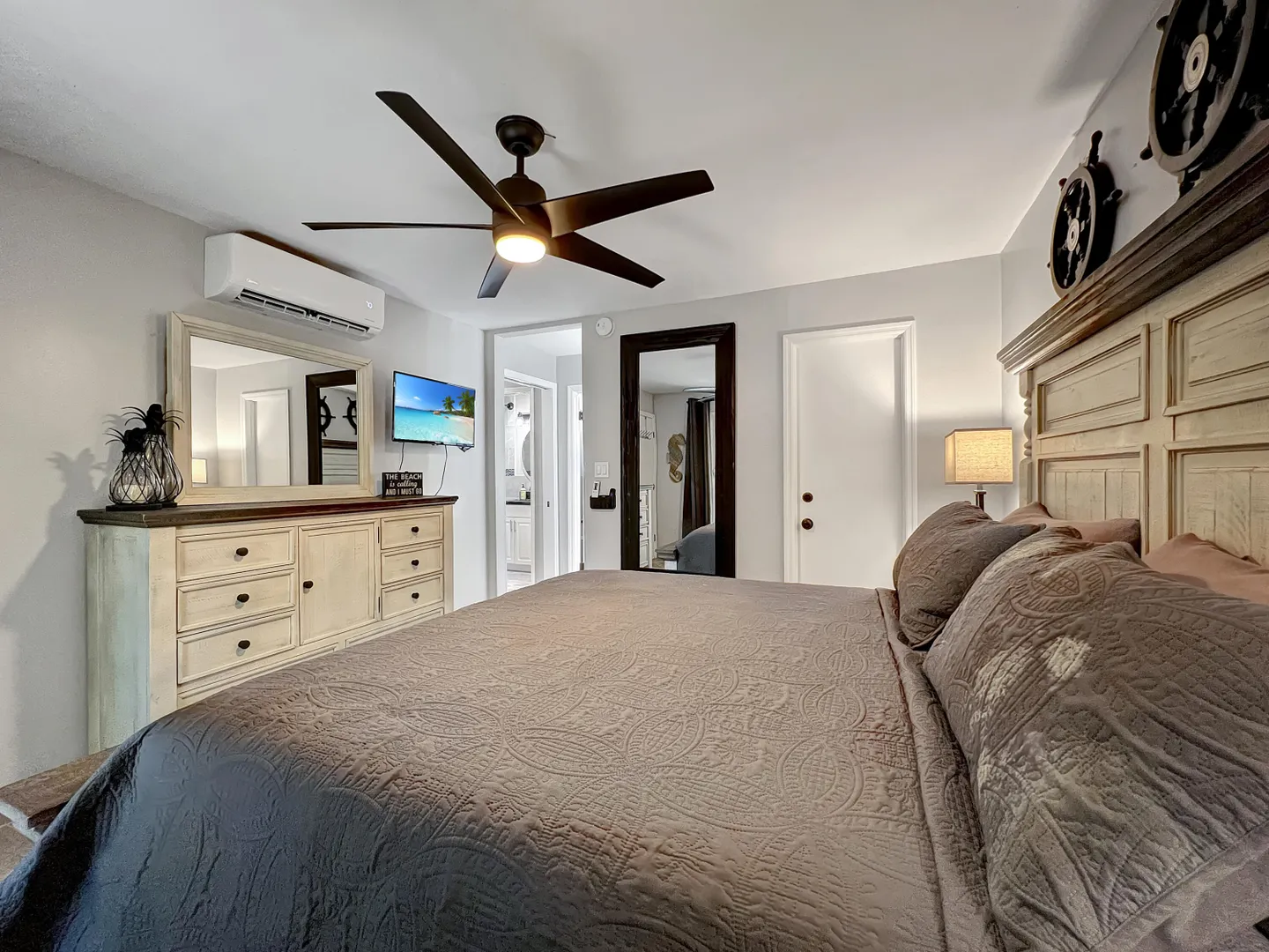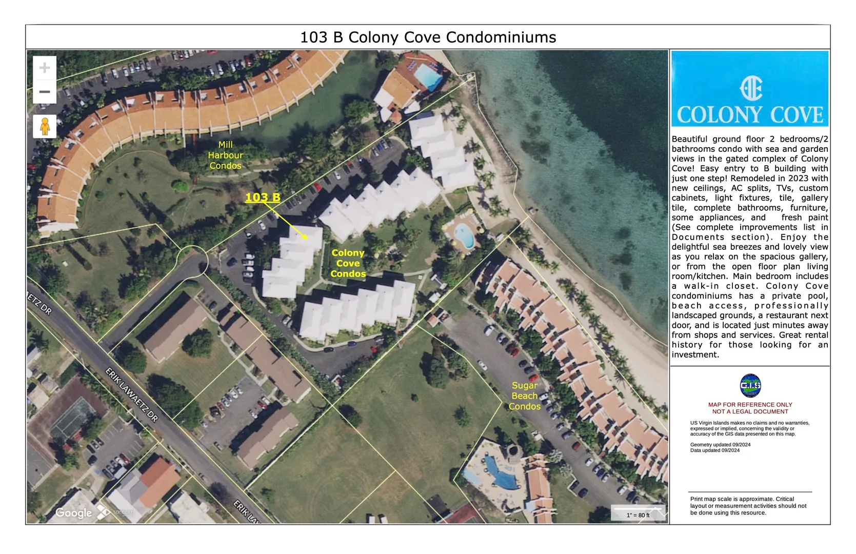 Beautiful ground floor 2 bed/2 bath condo with sea & garden views in the gated complex of Colony Cove! Easy entry to B building with just 1 step from parking lot! Remodeled in 2023 with new ceilings, AC splits, TVs, custom cabinets, light fixtures, tile, gallery tile, complete bathrooms, furniture, some appliances, & fresh paint (See improvements list in Documents section). Enjoy the delightful sea breezes and lovely view as you relax on the spacious gallery, or from the open floor plan living room/kitchen. Main bedroom includes walk-in closet & locking owners' closet. Colony Cove condominiums has a private pool, beach access, professionally landscaped grounds, a restaurant next door, & located just minutes from shops & services. Great rental history for those looking for an investment.