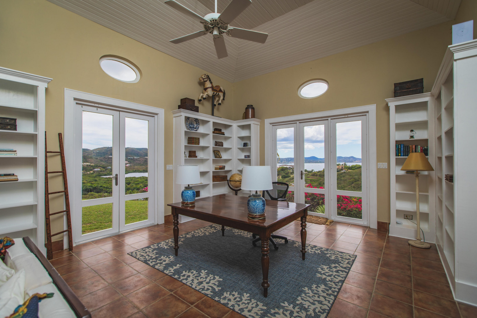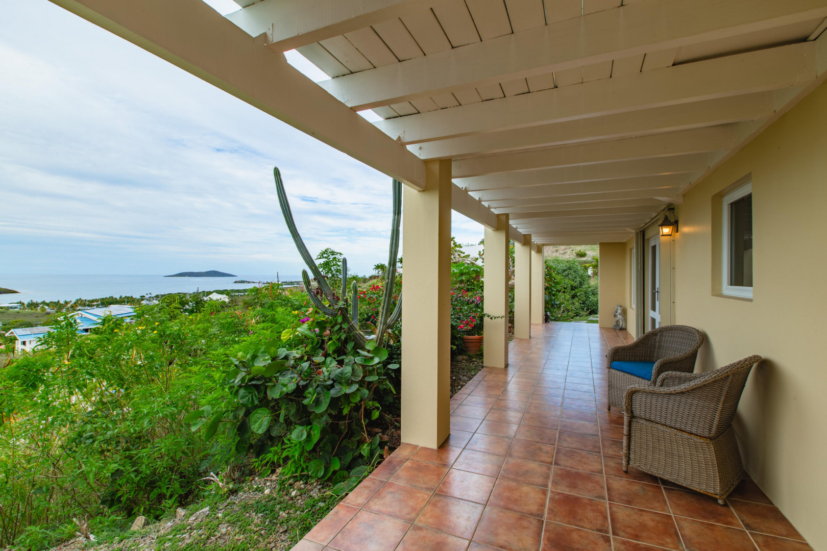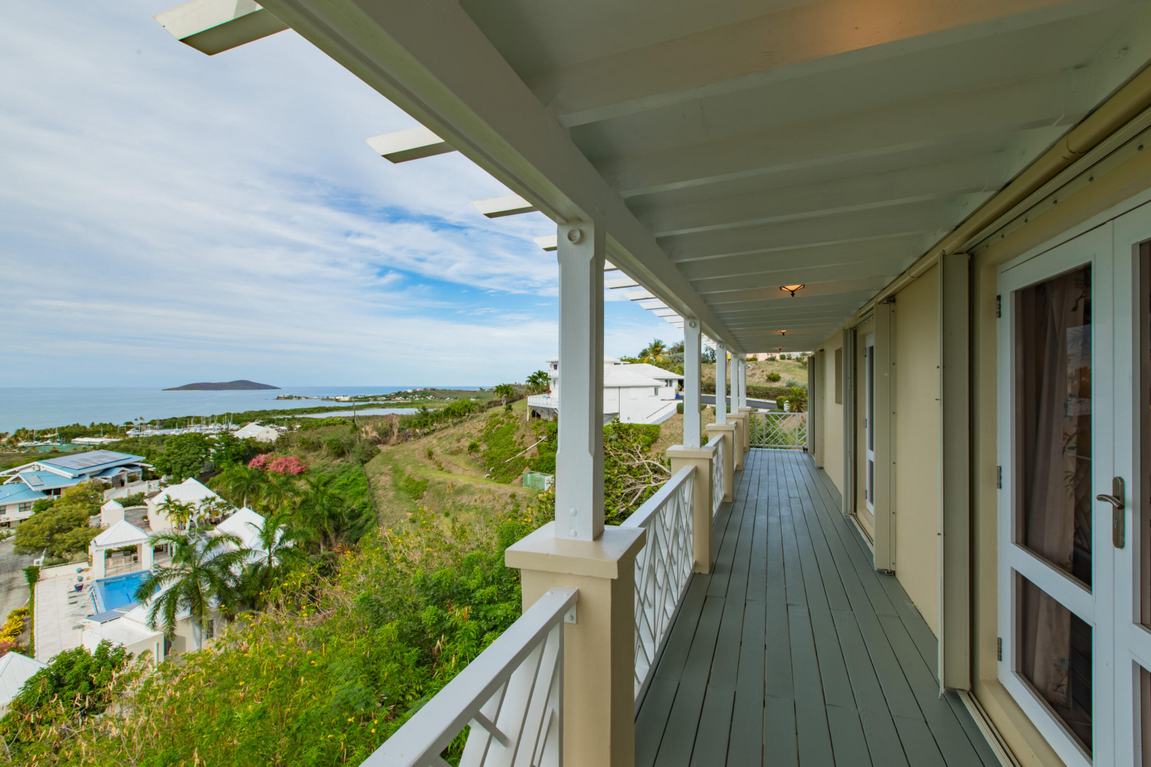 Welcome to this luxurious 4-bedroom, 4-bathroom hilltop estate, complete with a 1-bedroom , 1-bath apartment, located in a prestigious beachfront gated community on the east end, near the iconic Buccaneer Resort & Golf Course. Perched high above the coastline, this stunning property offers breathtaking panoramic views of the Caribbean Sea, blending modern elegance with island charm. The home features a spacious custom chef's kitchen, ideal for entertaining, with top-of-the-line appliances, hand-painted murals and sleek finishes. The expansive great room boasts live coral tile walls, elegant tray ceilings, and an abundance of natural light, creating a serene yet sophisticated living space. The master suite offers privacy with its own wing and features a spacious library, trey ceilings,spacious walk-in closet, outdoor gallery access and central air conditioning. The upper level of this estate is home to 3 guest suites, each with access to the long, covered gallery with views over the valley towards Buck Island and the sea. Step outside to your very own oasis, complete with a resort-style pool, surrounded by lush tropical landscaping, a serene water feature and poolside gazebo. Sustainable living is at your fingertips with a solar power system, Tesla battery backup, and a diesel generator ensuring your comfort and peace of mind. Built with high-quality materials, including impact glass windows, this home is designed for both luxury and durability. The 1-bedroom apartment offers flexibility, perfect for guests, extended family, or as an income-generating rental. Located in a coveted community with beach access and unparalleled amenities, this property is your gateway to the best of Caribbean living. Schedule your showing today and make this exclusive hilltop retreat your own!