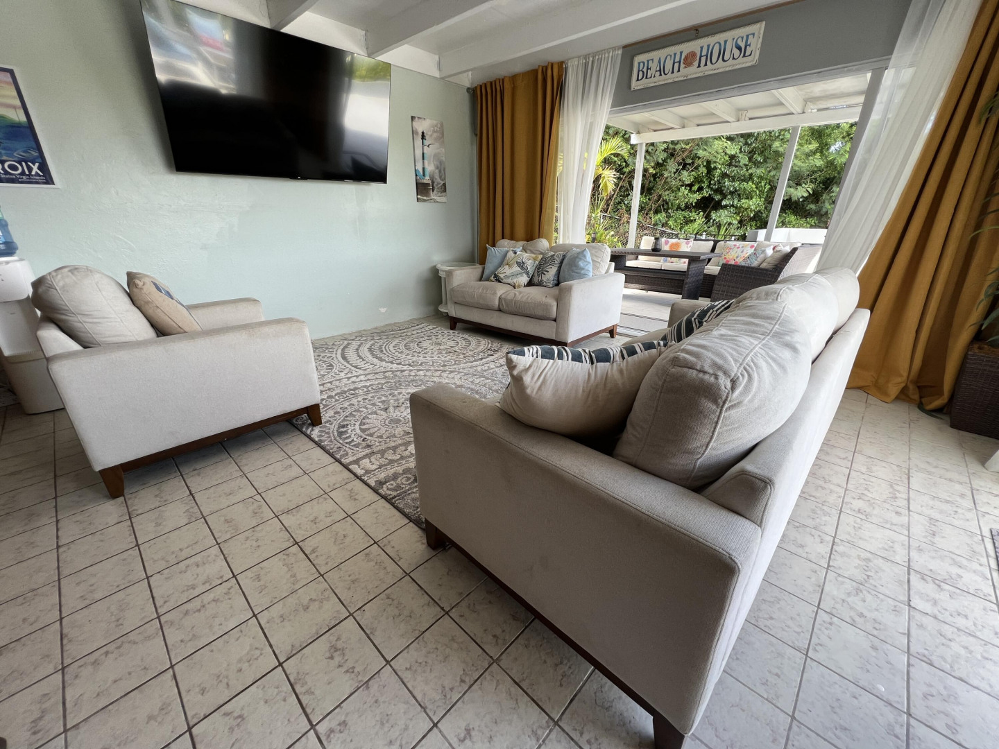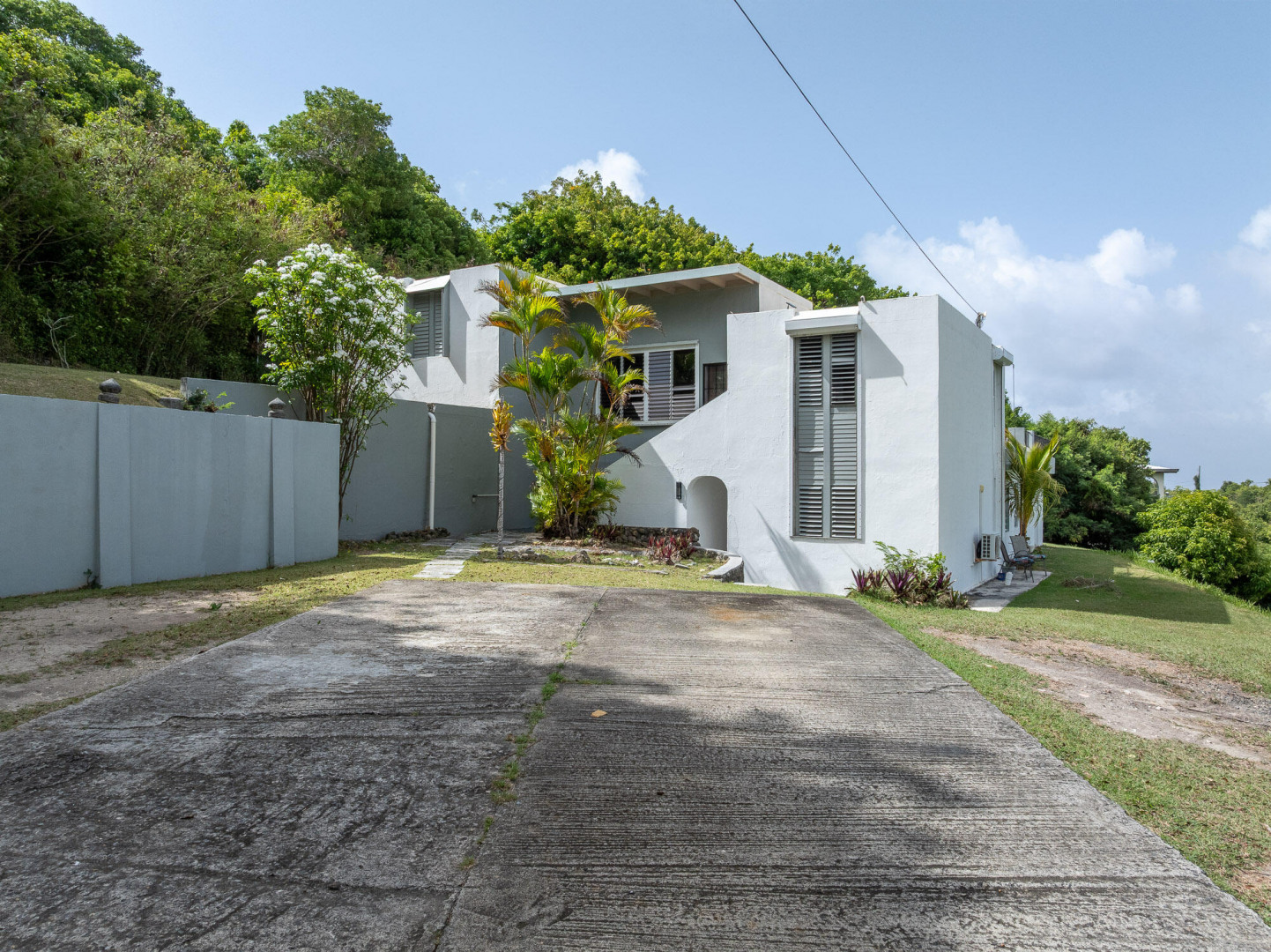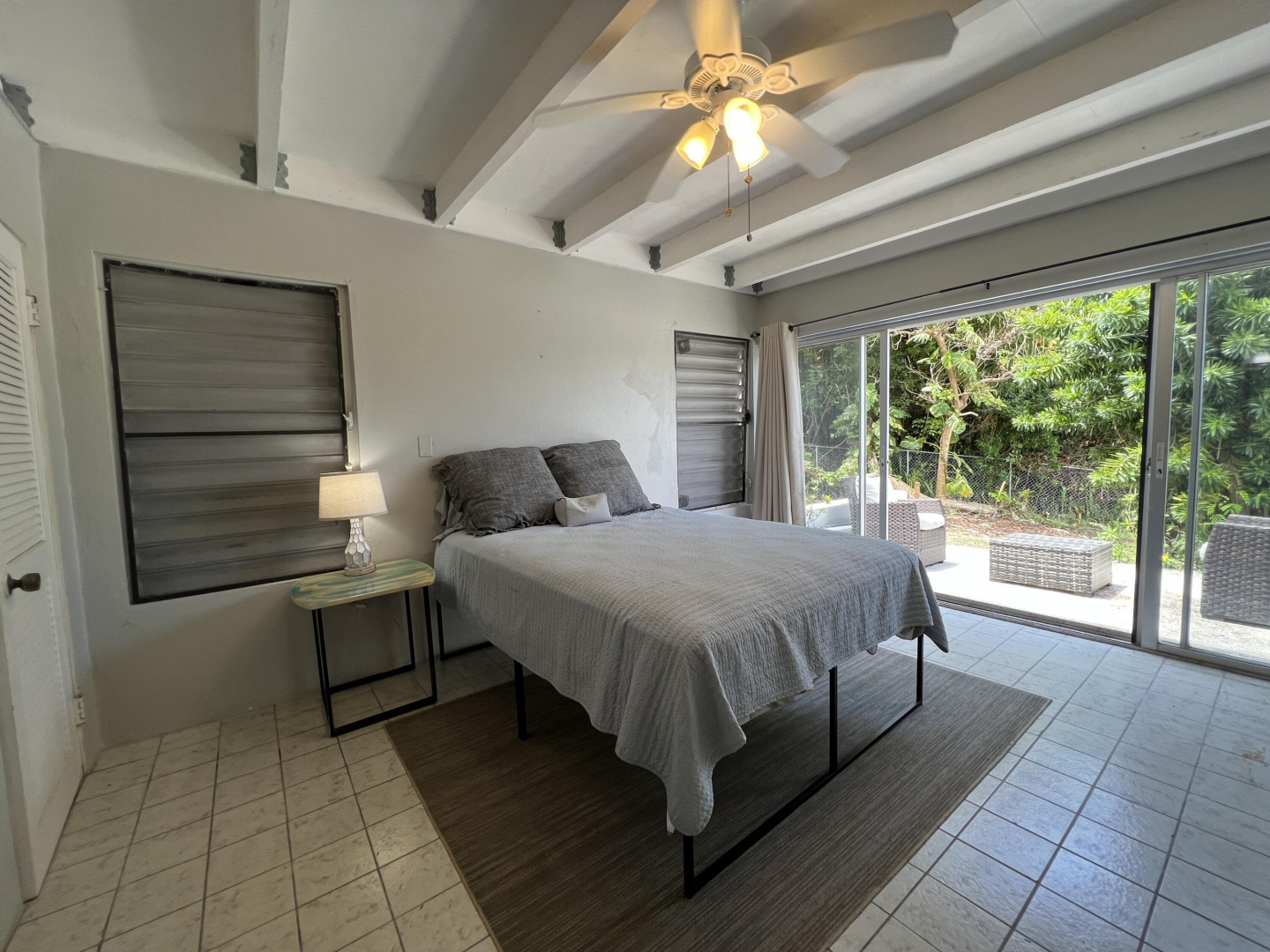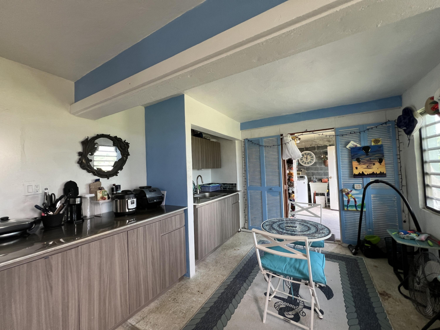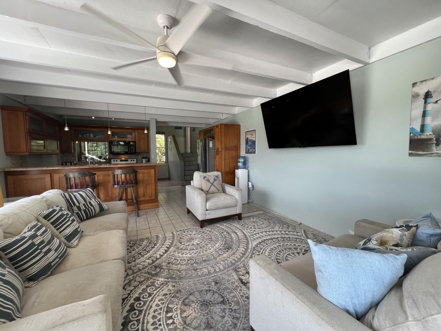 Tucked away at the end of a quiet lane in a friendly mid-island neighborhood, this multi-story home offers laid-back island living with gorgeous views of both the north and south shores. The main home features two spacious en suite bedrooms, an open kitchen that flows right into the living area, and a breezy covered gallery with tile flooring. Downstairs, you'll find a separate efficiency apartment, great for guests or rental income. There's also a workshop for your hobbies and a fenced-in backyard, ideal for kids or pets to play safely. A private, versatile home in a convenient location!