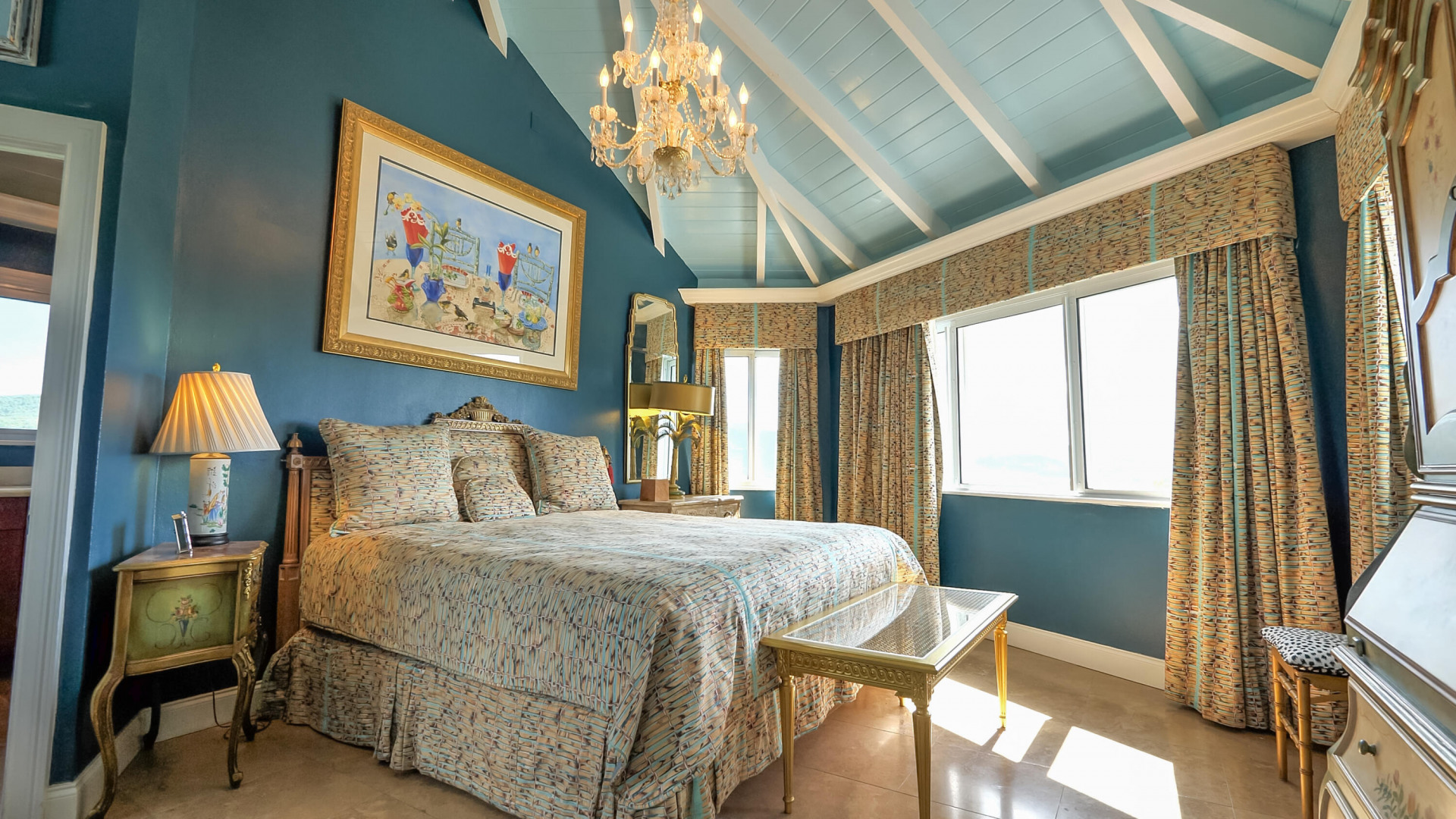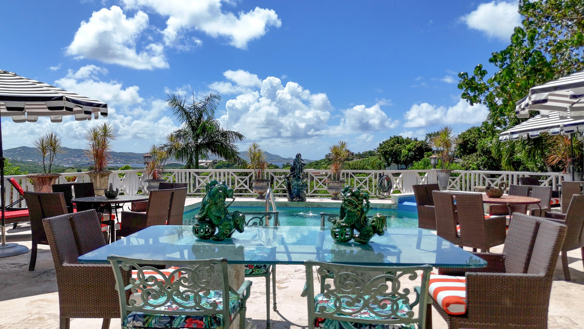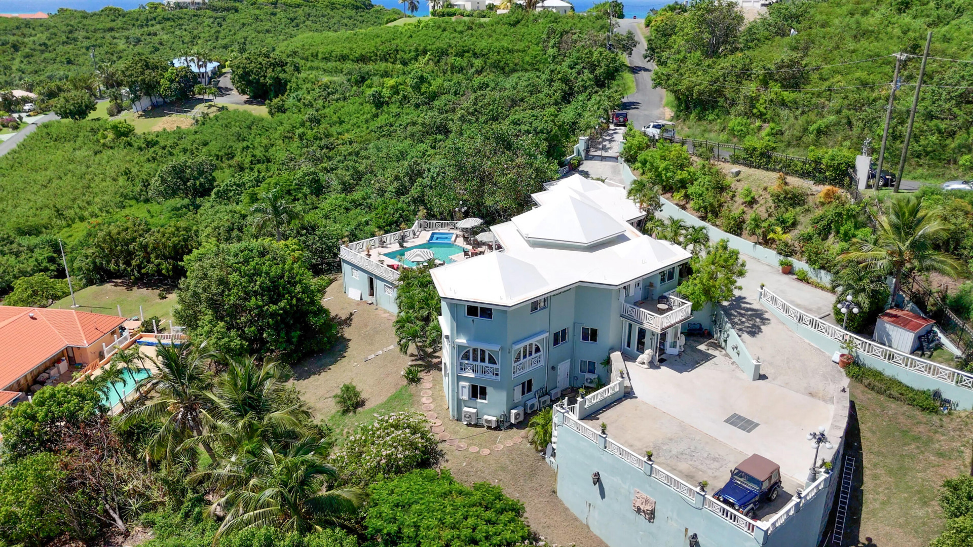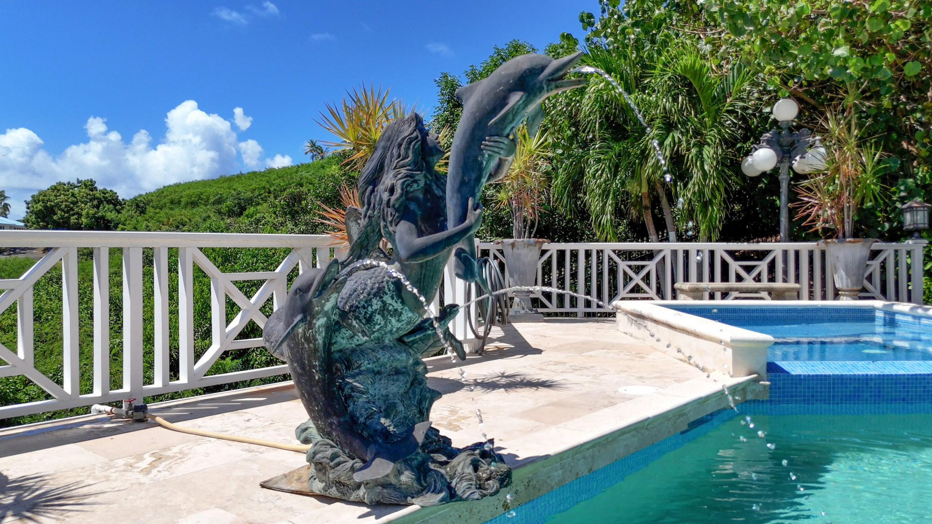 Discover Papaya Court, an iconic St. Croix estate featured in several of Carleton Varney's design books. Varney, also known as 'Mr. Color' and longtime president of Dorothy Draper & Co., was a close friend of the seller. This exquisite home is designed for grand entertaining, featuring a luxurious Chef's kitchen and dining area upstairs, complemented by a fully equipped bar with direct access to an expansive pool deck downstairs. The private and luxurious primary suite, along with three guest suites, ensures comfort for visiting guests. Nestled in the island's premier beach community, this masterpiece offers sweeping views of The Buccaneer Golf Course, Christiansted, and the Caribbean Sea. Beaches, restaurants, and shopping are just minutes away.Papaya Court is designed for grand entertaining and refined living. As you enter through a beautiful iron gate, sourced from a prestigious auction, you are welcomed by an expansive property where every detail has been thoughtfully curated. The home's layout offers multiple living areas, perfect for hosting gatherings and functions or enjoying quiet moments in the tropical breeze. The upstairs level features an open Chef's kitchen, recently updated with top-of-the-line appliances and gleaming granite countertops. The spacious island, sleek cabinetry, and high-end finishes make this kitchen an ideal space for preparing culinary delights. Adjacent to the kitchen is a formal dining room, where you can host elegant dinners while enjoying the beautiful view of the golf course and the lights of Christiansted at night. The downstairs area is equally impressive, with a fully equipped bar and lounge that opens directly onto the expansive pool deck with a large and inviting pool. The pool is set up with a pool heater to make sure the temperature stays comfortable even when the tradewinds cool it down in the winter months. Whether you're hosting large gatherings or intimate parties, this outdoor space offers the perfect venue, with ample room for sunbathing, dining, or relaxing by the pool. The poolside guest suite provides visitors with their own private living room and kitchen, allowing for extended stays in comfort and privacy.