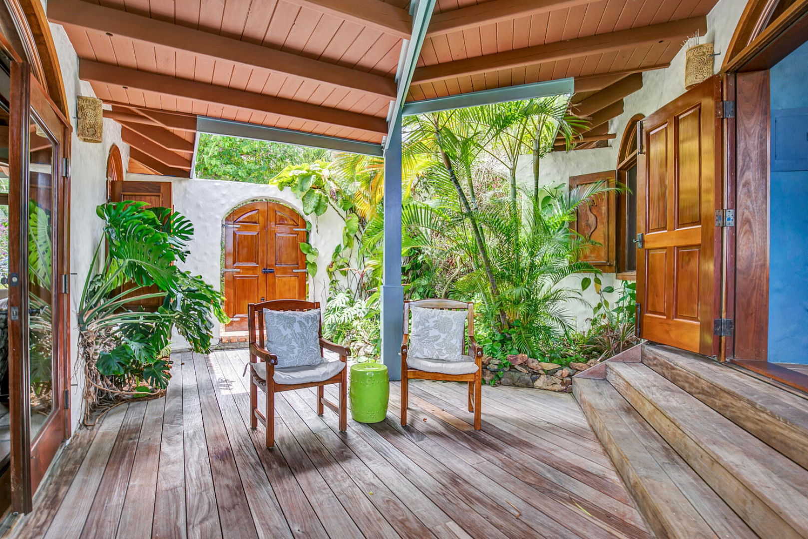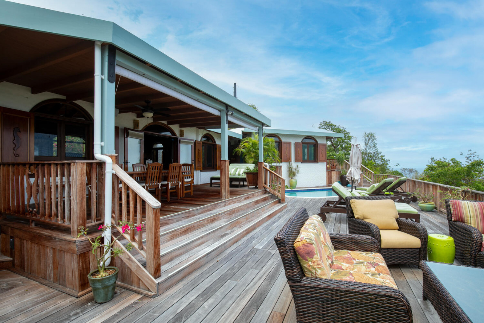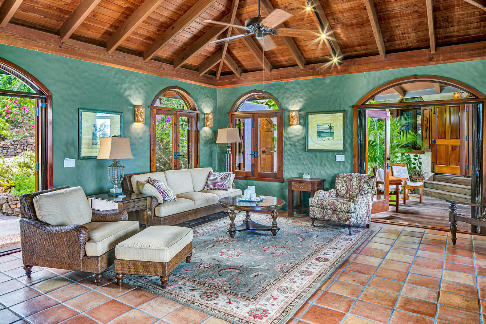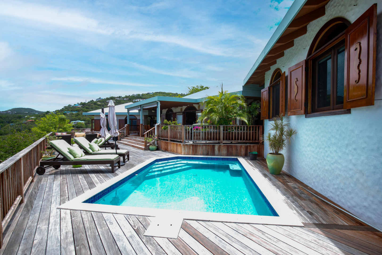 With the perfect blend of privacy, seamless indoor/outdoor living, and charming ocean views, it's easy to see how a budding young country singer may have been inspired to write some of his number one hits during times of respite at Villa De Vida, his first island home. This Chocolate Hole property is an entertainer's delight. A spacious kitchen and living room area opens to an expansive Ipe wood deck that overlooks the twinkling lights of St. Thomas. Take in the sunset from a deck lounger or enjoy a glass of wine while floating in the pool to the sounds of the waves rolling in gently to Hart Bay below. Each of the three bedroom suites is situated in its own private building, connected to the great room via covered walkways and picturesque arched entrance ways.Outdoor showers in each bedroom offer a unique island living experience. The master's shower is spacious, featuring its own garden and is enclosed with a skylight above, welcoming in the sunshine while protecting you from passing showers. The home is well-appointed and beautifully furnished, with Tommy Bahama furnishings in the master bedroom. Villa De Vida could serve as both a vacation rental home or an island residence, ideal retreat for whatever your heart desires.