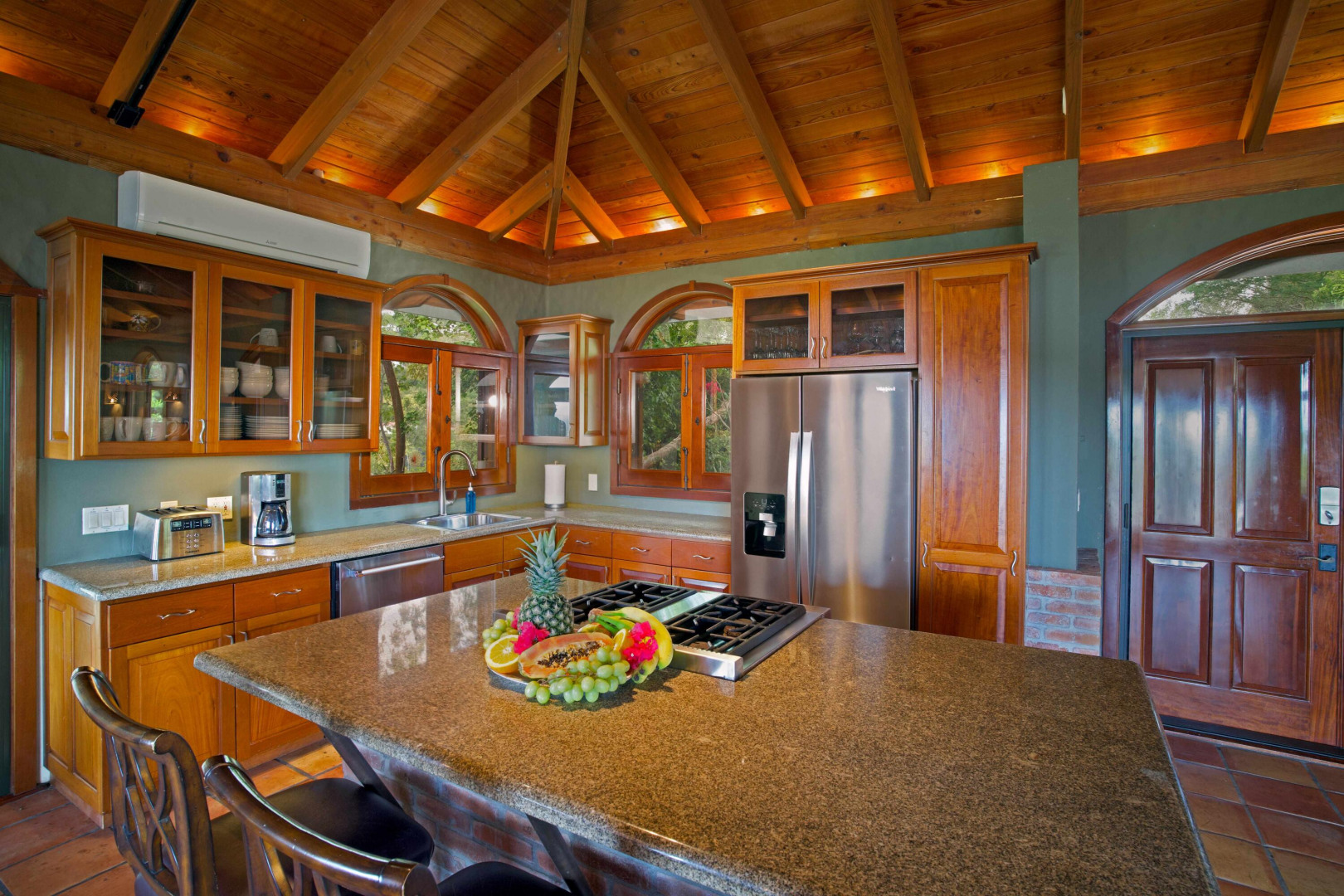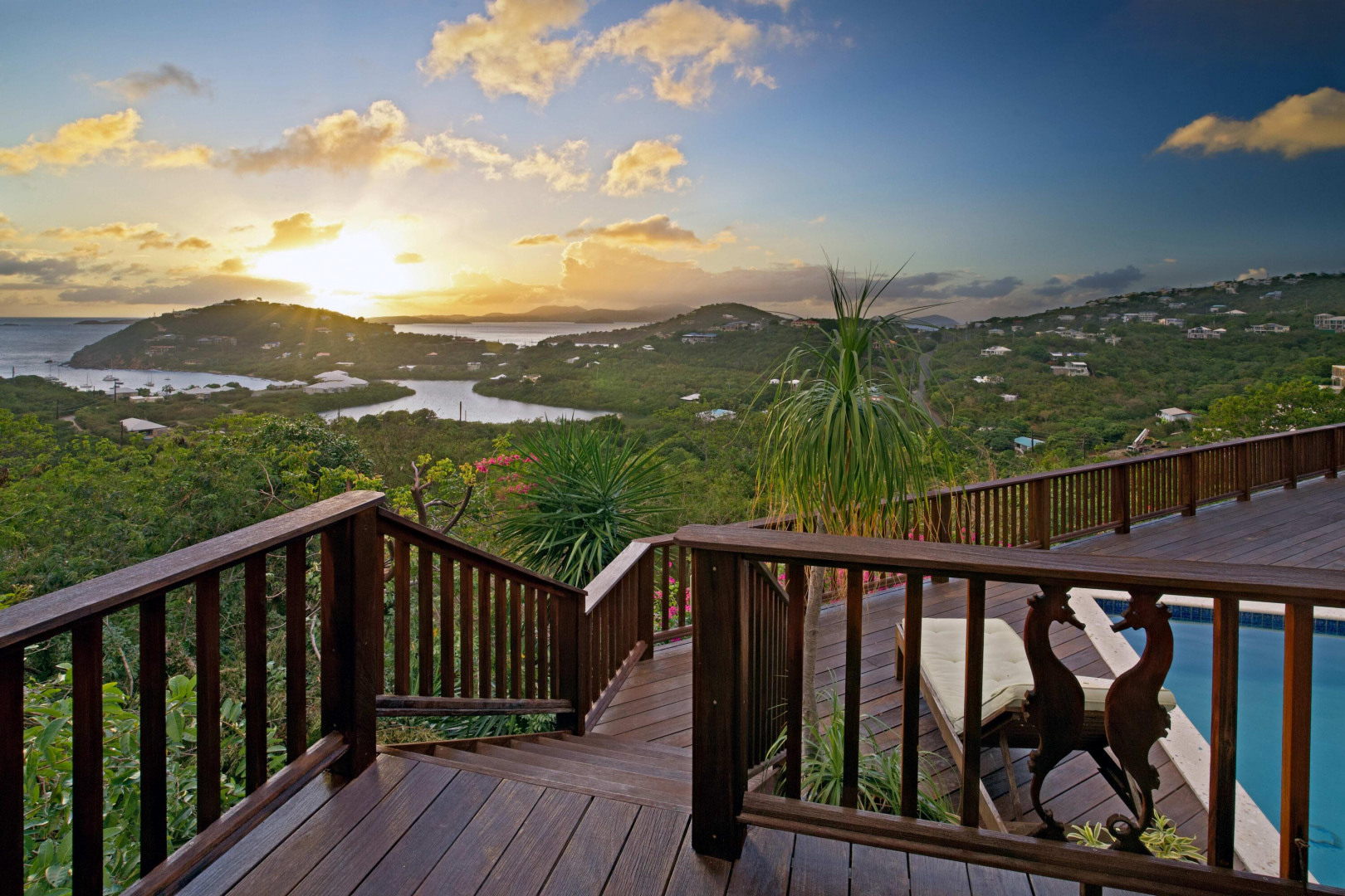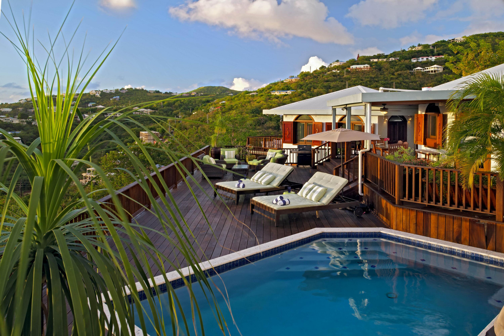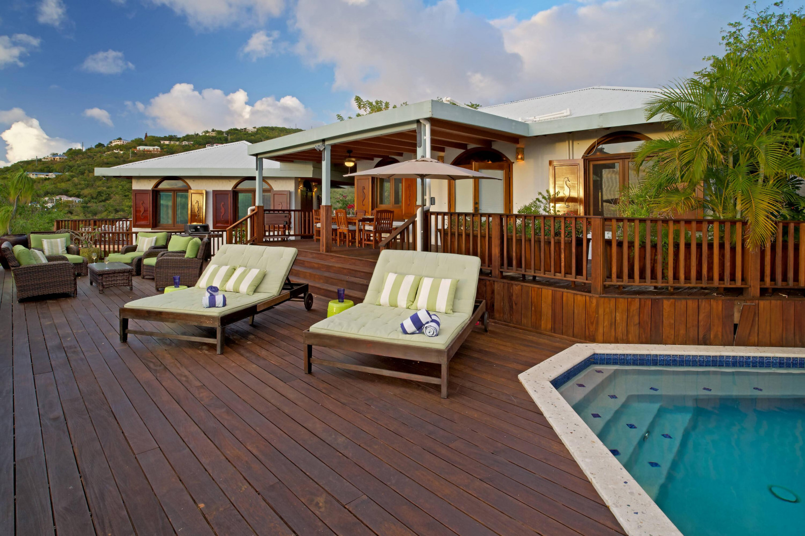 Villa De Vida is a stunning hilltop showplace in the serene enclave of Chocolate Hole which combines luxury with privacy and offers enchanting ocean views and lush tropical landscaping on 1.21 acres of property. The spacious kitchen and Great Room open on to an expansive Ipe wood deck perfect for entertaining and an inviting swimming pool where you can enjoy colorful sunsets and the twinkling lights of St. Thomas at night. The three charming bedroom suites are housed in separate buildings, each linked to the Great Room by covered walkways and arched entrances. Elegantly furnished with thoughtful touches, this villa captures the spirit of relaxed luxury. Whether as a vacation rental or private residence, this is an idyllic island retreat and the former home of a famous country music star!