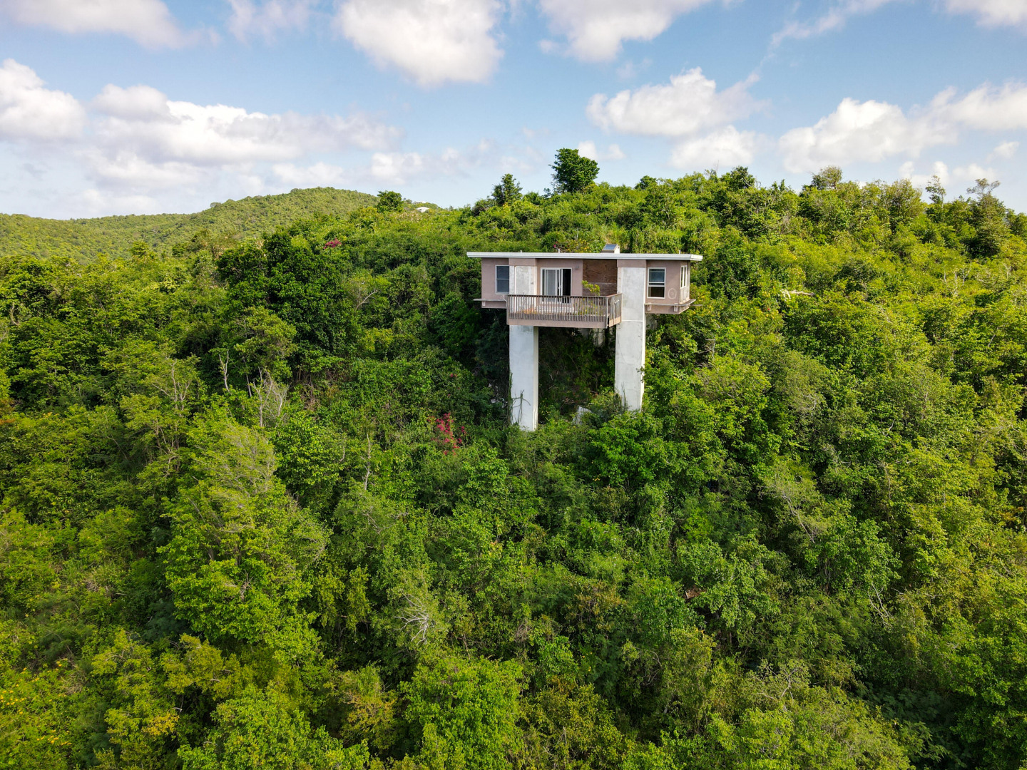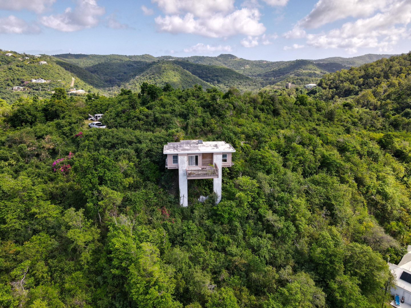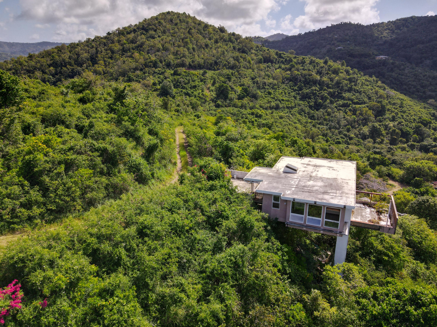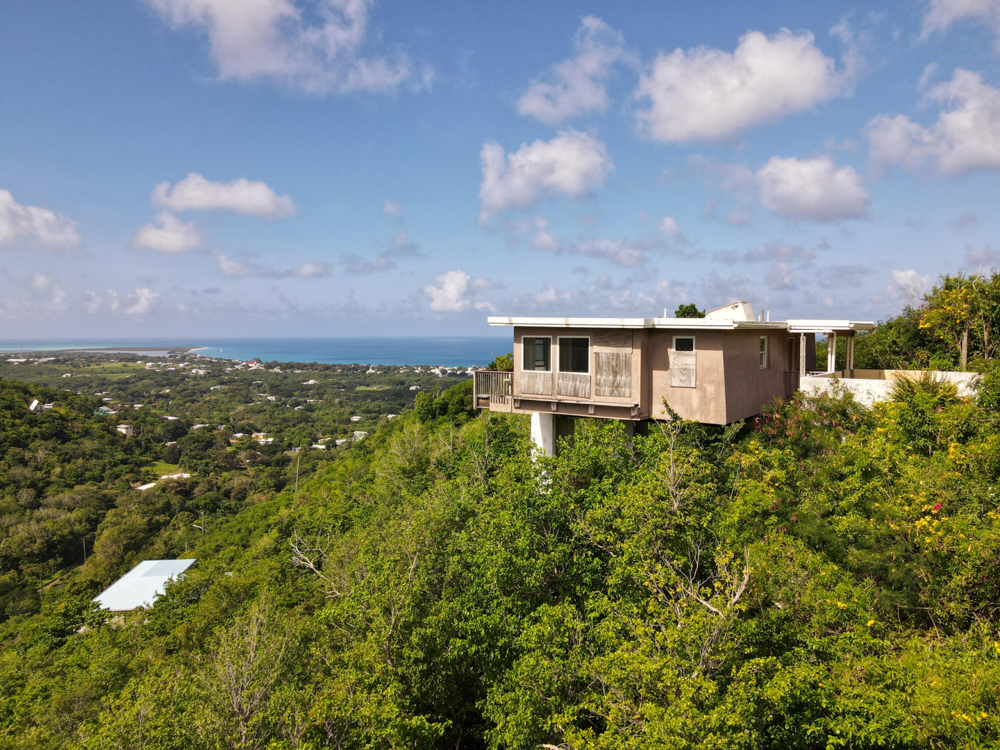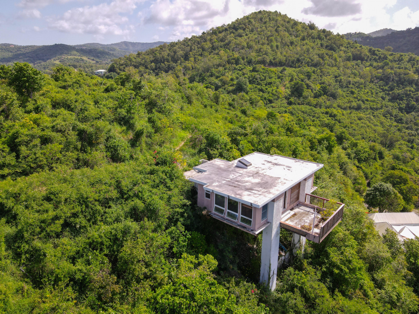 *AS IS HURRICANE DAMAGED HOME* designed by organic architect John Randall McDonald. Perched on a verdant hill in Little La Grange, this 2 bedroom, 2 bathroom house on stilts offer views of the gorgeous Caribbean Sea from every room. Valley views from the east bedroom, picture windows....be serenaded by the sounds of birds and the breeze. An amazing opportunity to build on the bones of a masterwork.